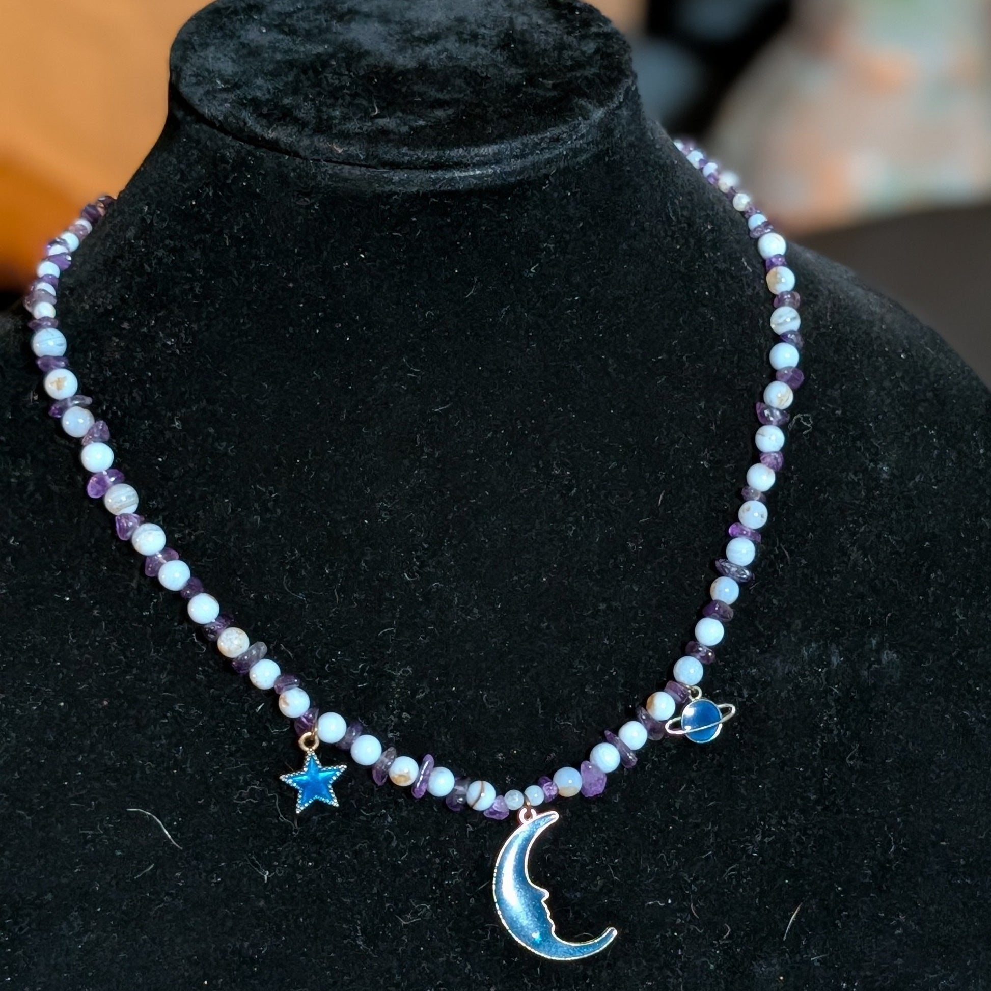✨Celestalis✨| Blue Lace Agate & Amethyst Celestial Necklace with Moon, Star & Planet Charms