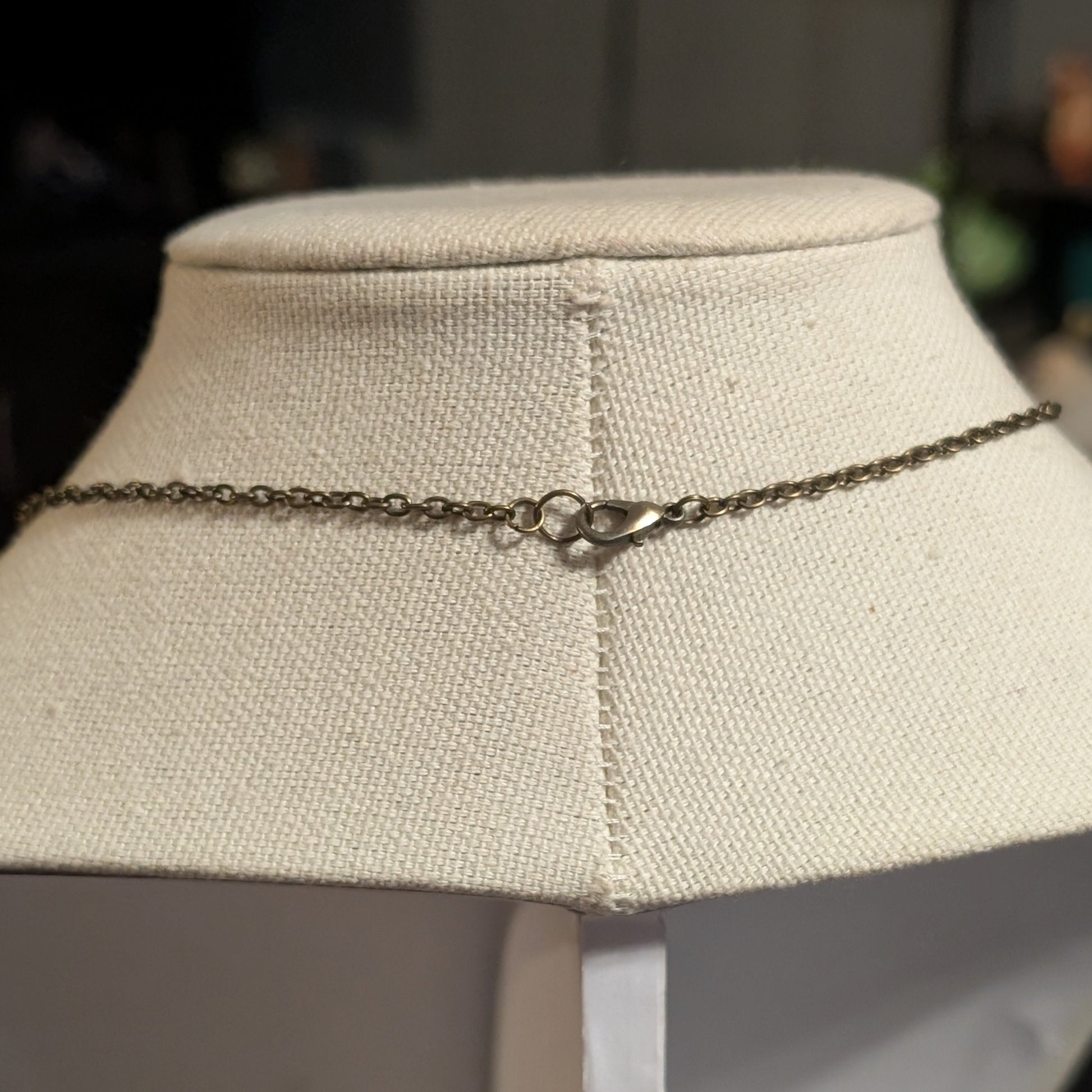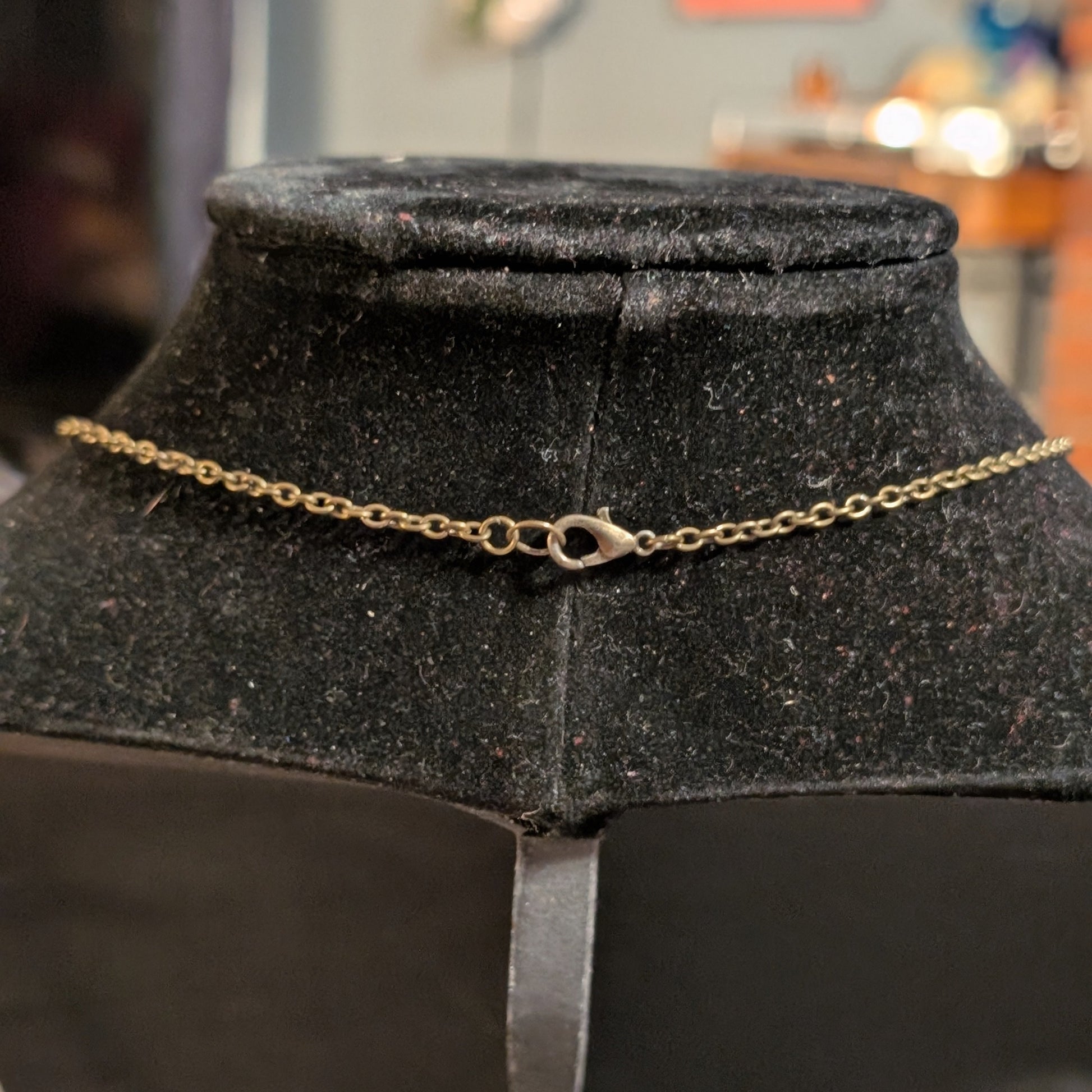 Her tri-colored tiger’s eye beads glint like shifting embers: gold, red, and shadowed brown catching the bronze of her fairy’s wings. There’s a rhythm to her—something you feel rather than hear—like light flickering over water or leaves rustling against the last warmth of the sun.