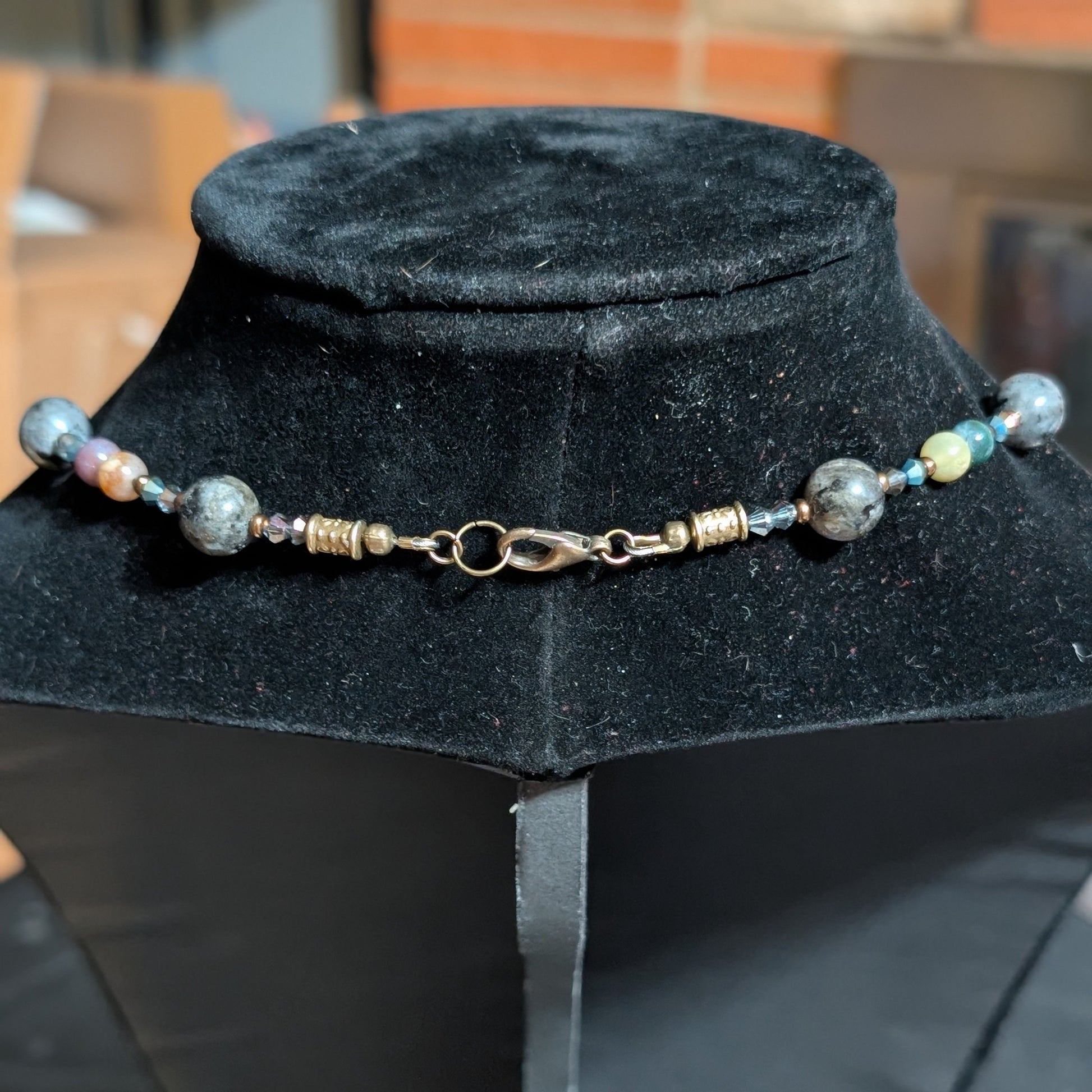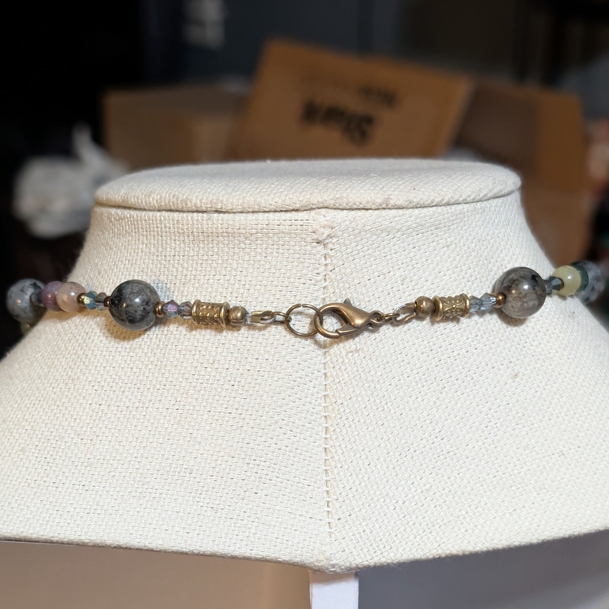 The strand carries the tale further: shimmery larkavite beads glimmer like starlight caught in stone, while Indian agate lends grounding earthiness and unexpected shades of green and rose. Bronze accents are scattered throughout, weaving a subtle metallic warmth that ties pendant and strand together in seamless harmony.