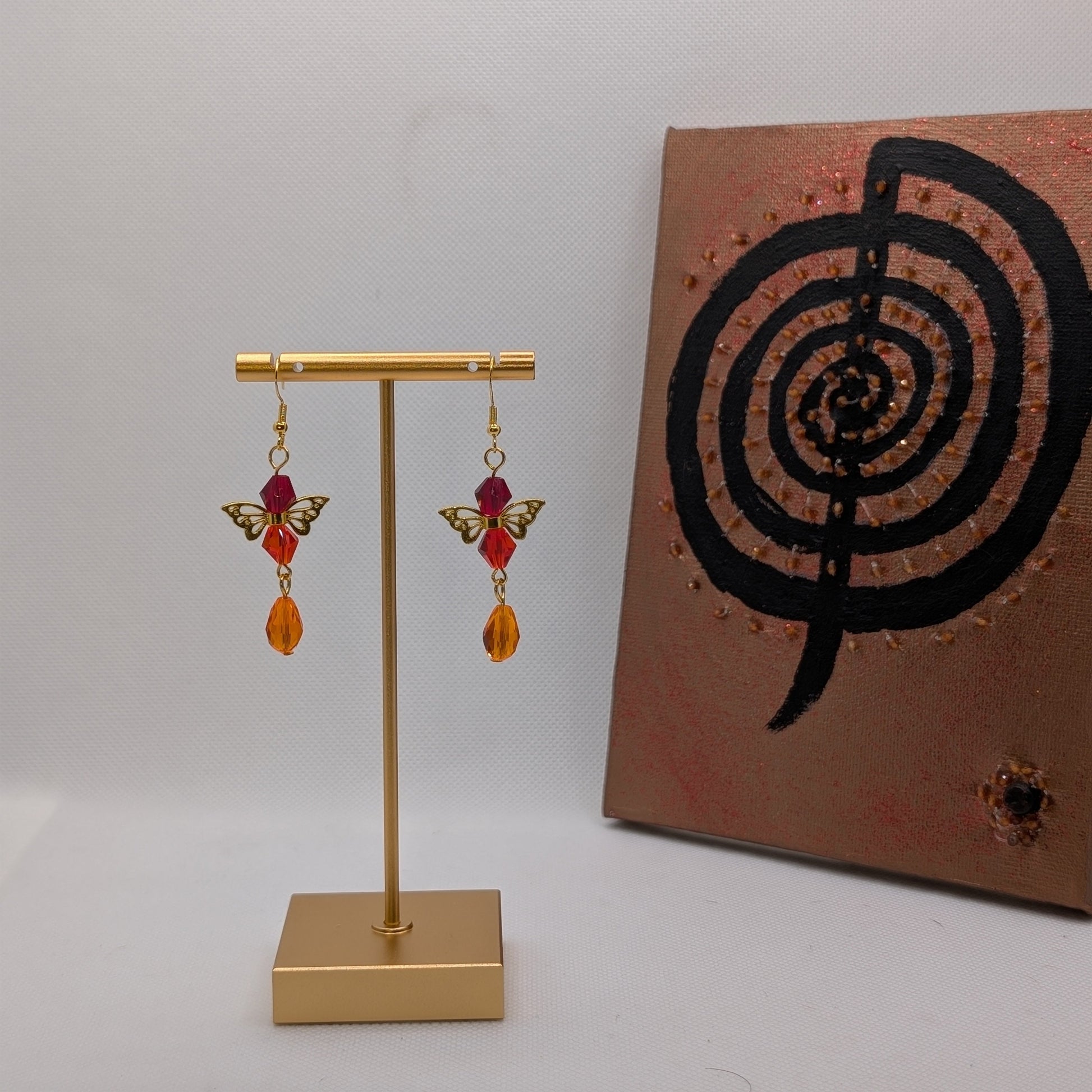 These earrings spark with lively contrast — golden wings suspended between vivid red, glowing orange, and a drop of warm amber. They flutter like sparks at sunset, equal parts playful and striking.