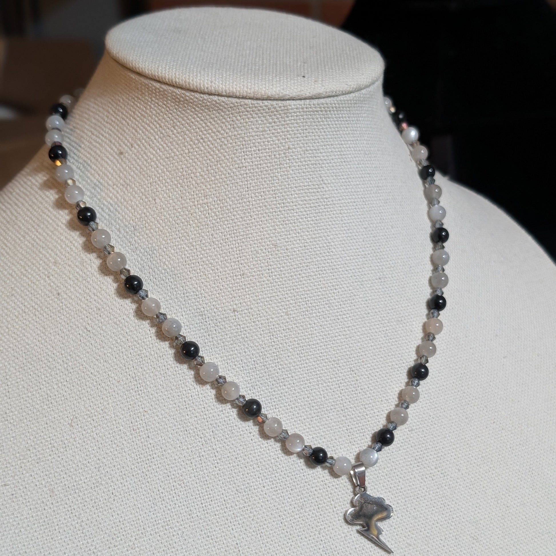 ✨Flickerpour✨| Silver Gray Moonstone & Obsidian Lightning Pendant Necklace