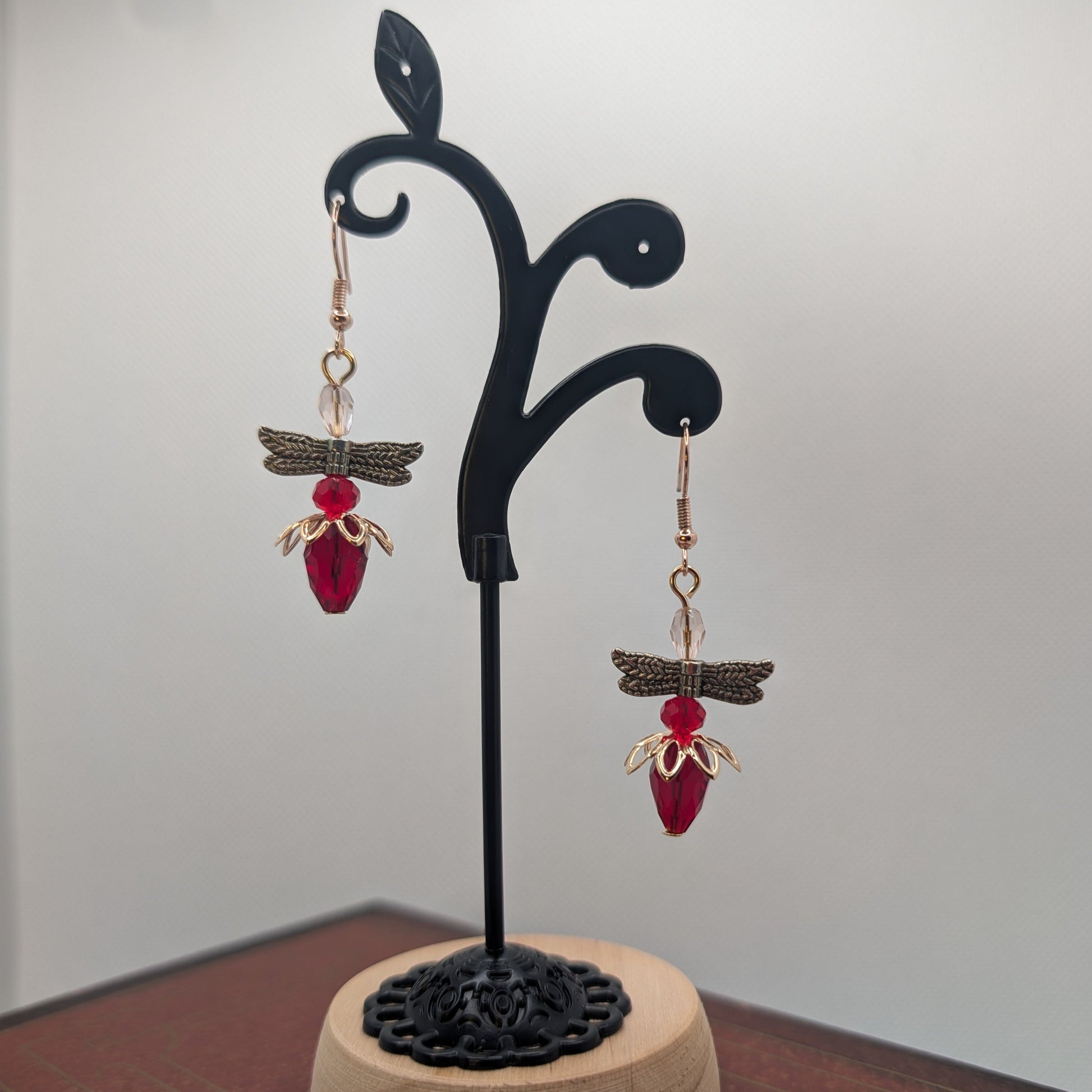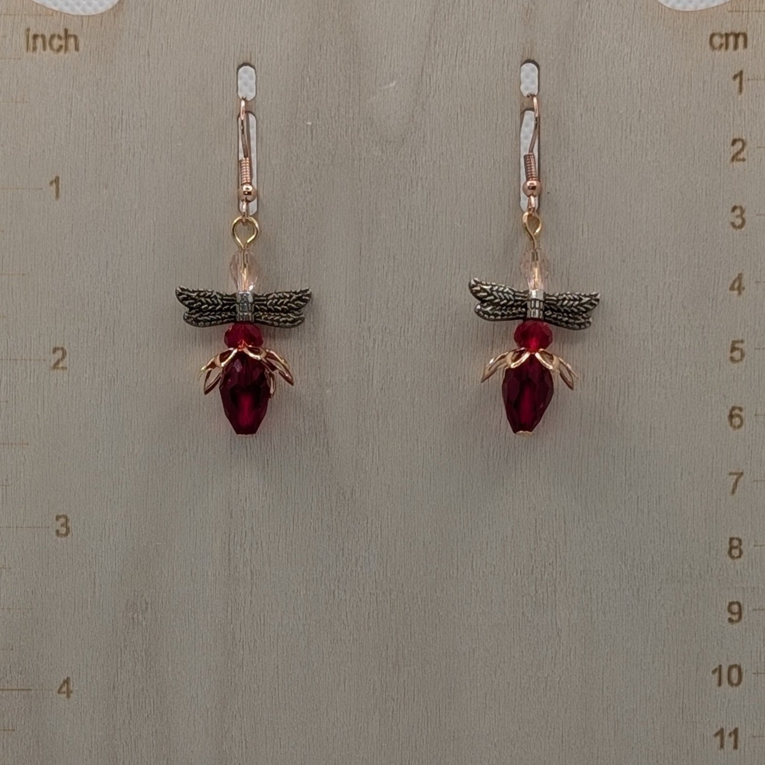 A spark, a shimmer, and a flick of wings—Flitterflare is here to turn heads and raise heart rates. These vibrant fairy earrings feature fiery red and rose-gold tones, with faceted beads forming a glowing body and flower petal skirt. Bronze-toned wings stretch wide, ready to lift off in a blaze of charm and mischief.