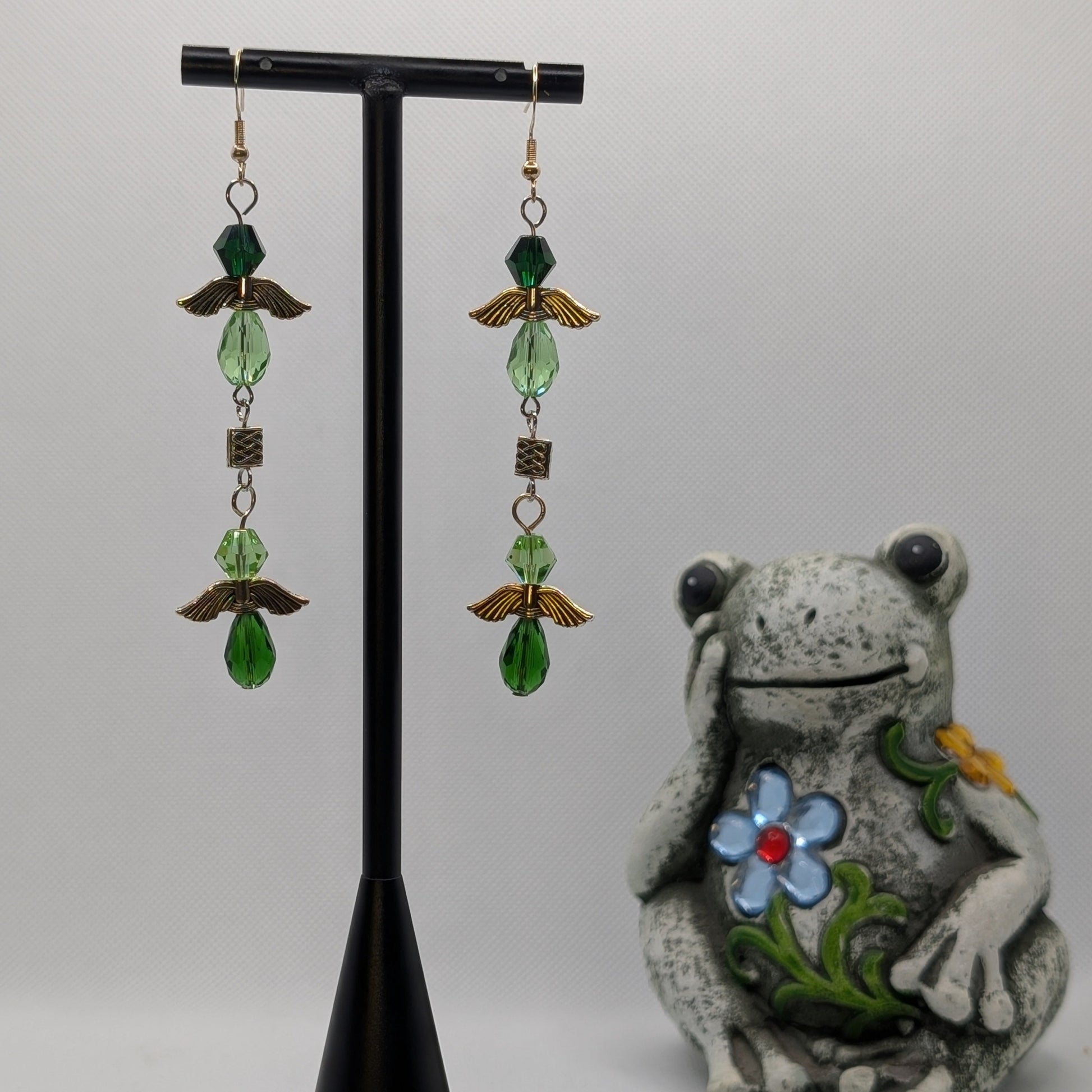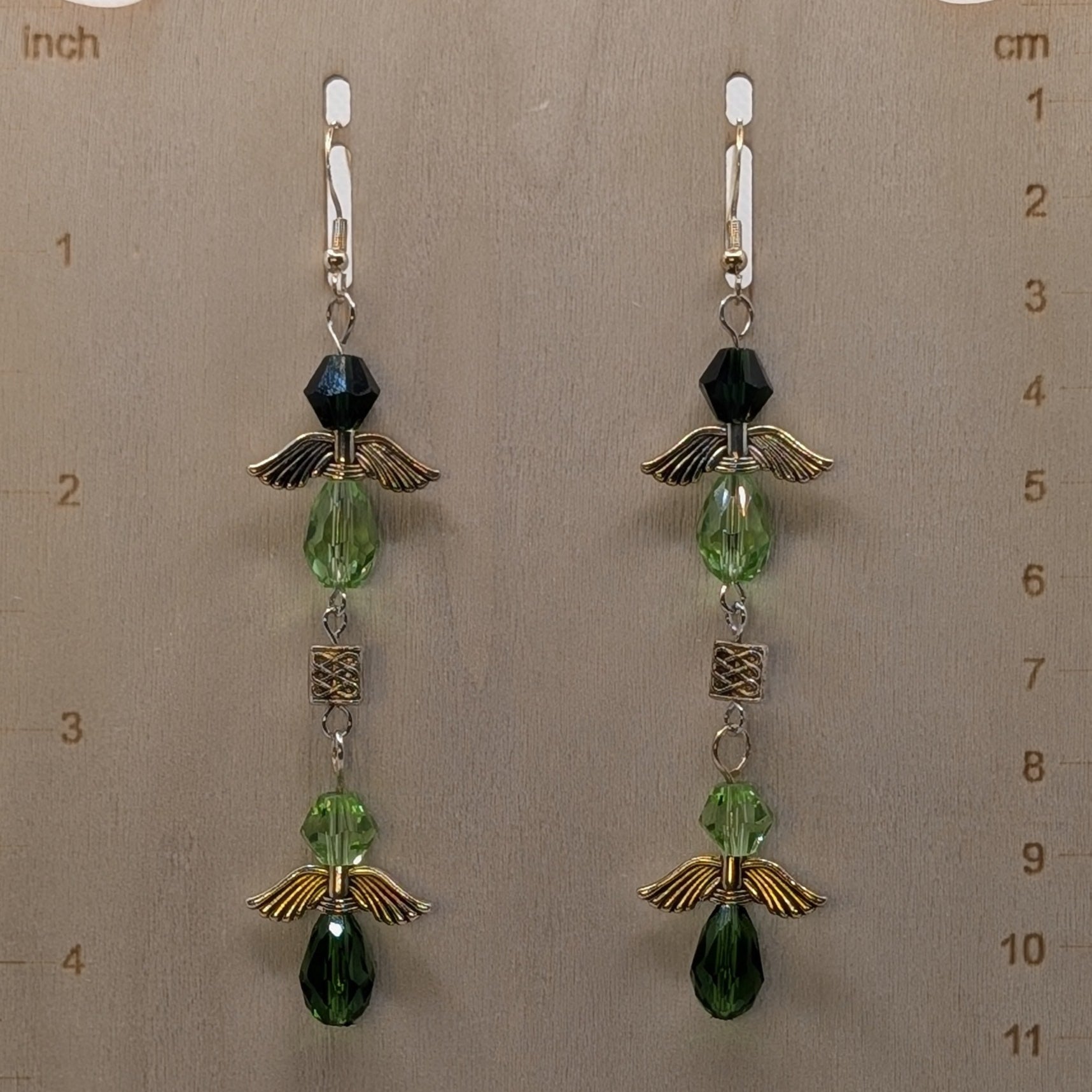 Two forest spirits, bound in mirrored flight—Gladeglyph captures the mystique of enchanted woodlands in motion. Each earring features twin green-winged figures formed from faceted glass in deep pine, fresh moss, and leafy chartreuse tones. Antique silver-toned wing components form the fae shapes, while a delicate Celtic knotwork-style bead sits between them like a magical sigil.