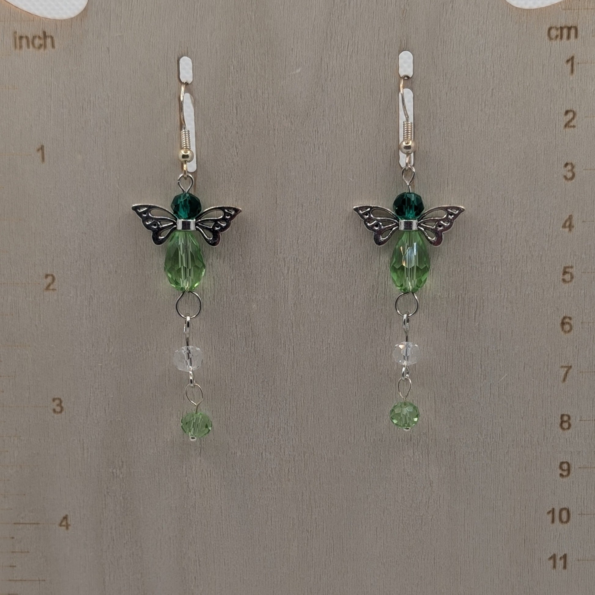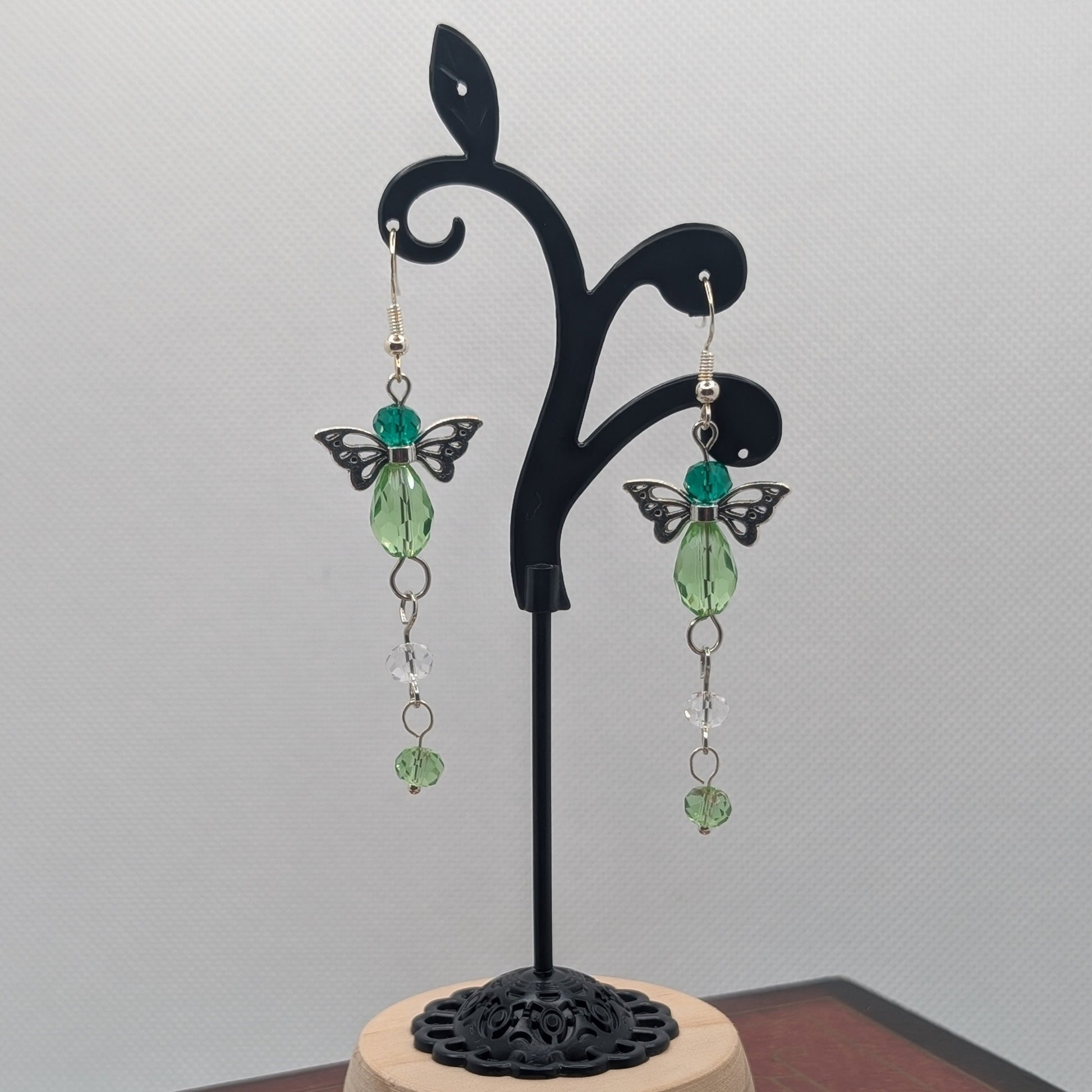 A shimmer caught in the undergrowth, a flutter among the vines—Glimmervine captures the quiet enchantment of fae-laced foliage. These dangling earrings feature fairy-wing accents atop green glass drops, trailing into clear and green beads that sparkle like dew on woodland leaves. The translucent hues play in the light, giving each movement a touch of magic.