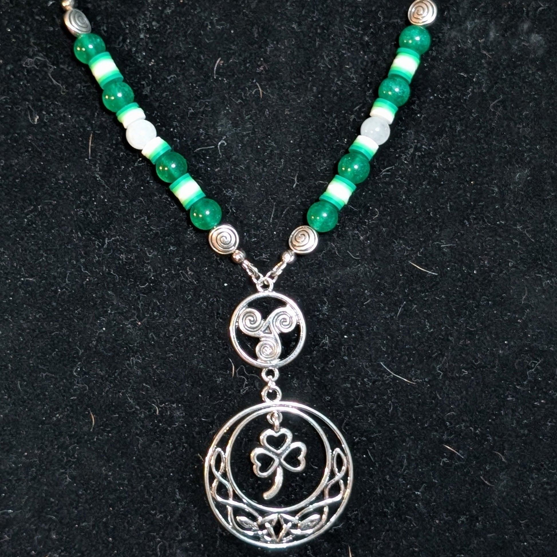 The pendant at its heart—a shamrock framed in intricate silver—grounds the piece in Irish lore, bridging mortal tradition with fae enchantment. Worn close, it feels both festive and mystical, equally at home at a celebration of heritage or in quiet moments where symbols matter most.