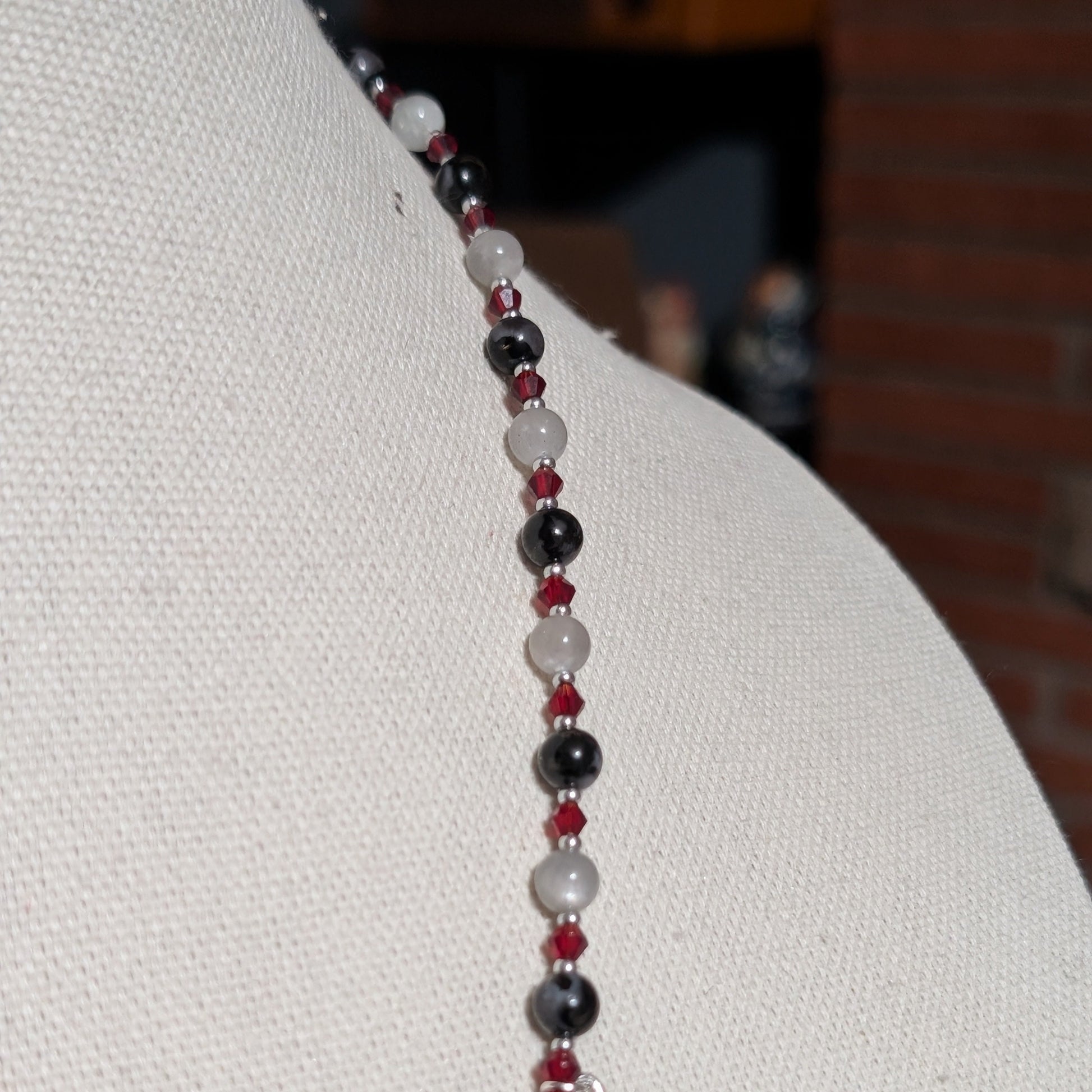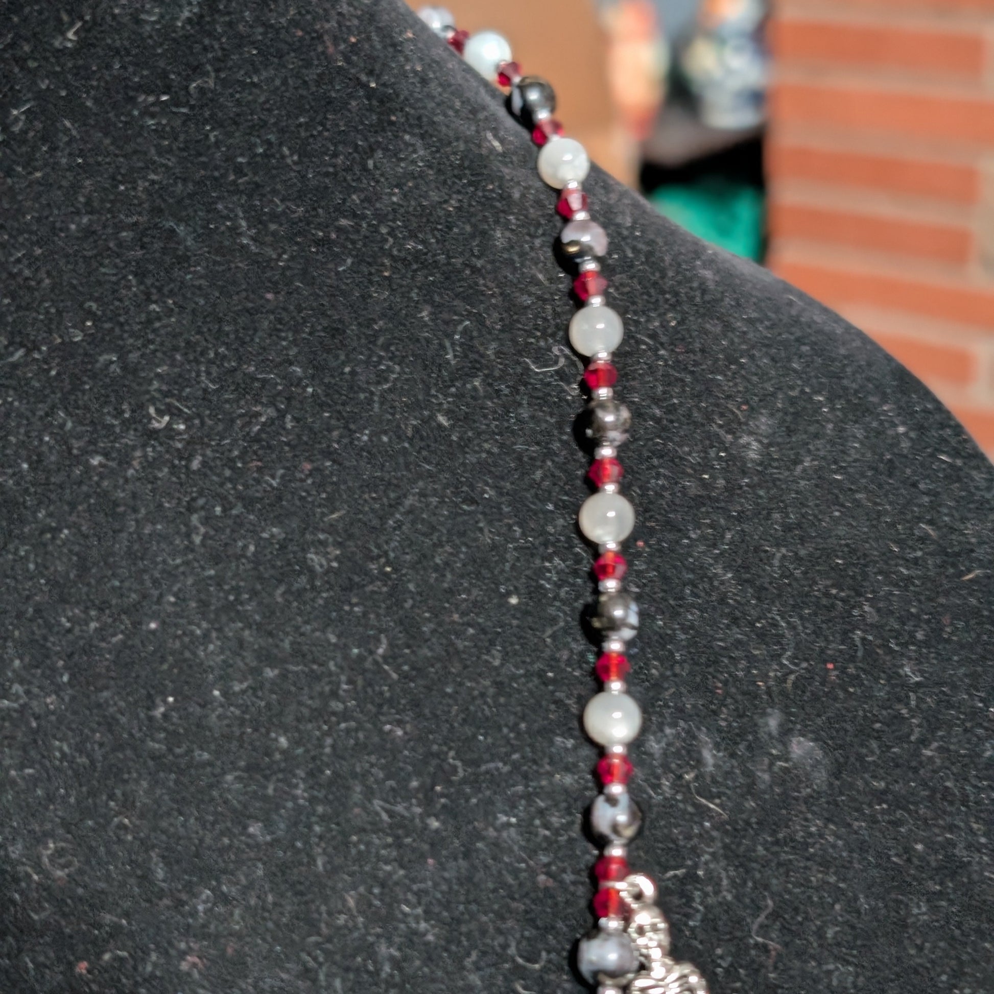 Grave Waltz is strung with indigo gabbro (merlinite) beads, each marbled in smoky shades like storm clouds caught in stone. Silver gray moonstone gleams between them, its shimmer almost mirror-like, flashing light in the darkness. Deep red faceted spacers flicker like drops of blood or candlelight in a crypt, while tiny silver seed beads thread everything together with a gleam that ties the charms to the strand.