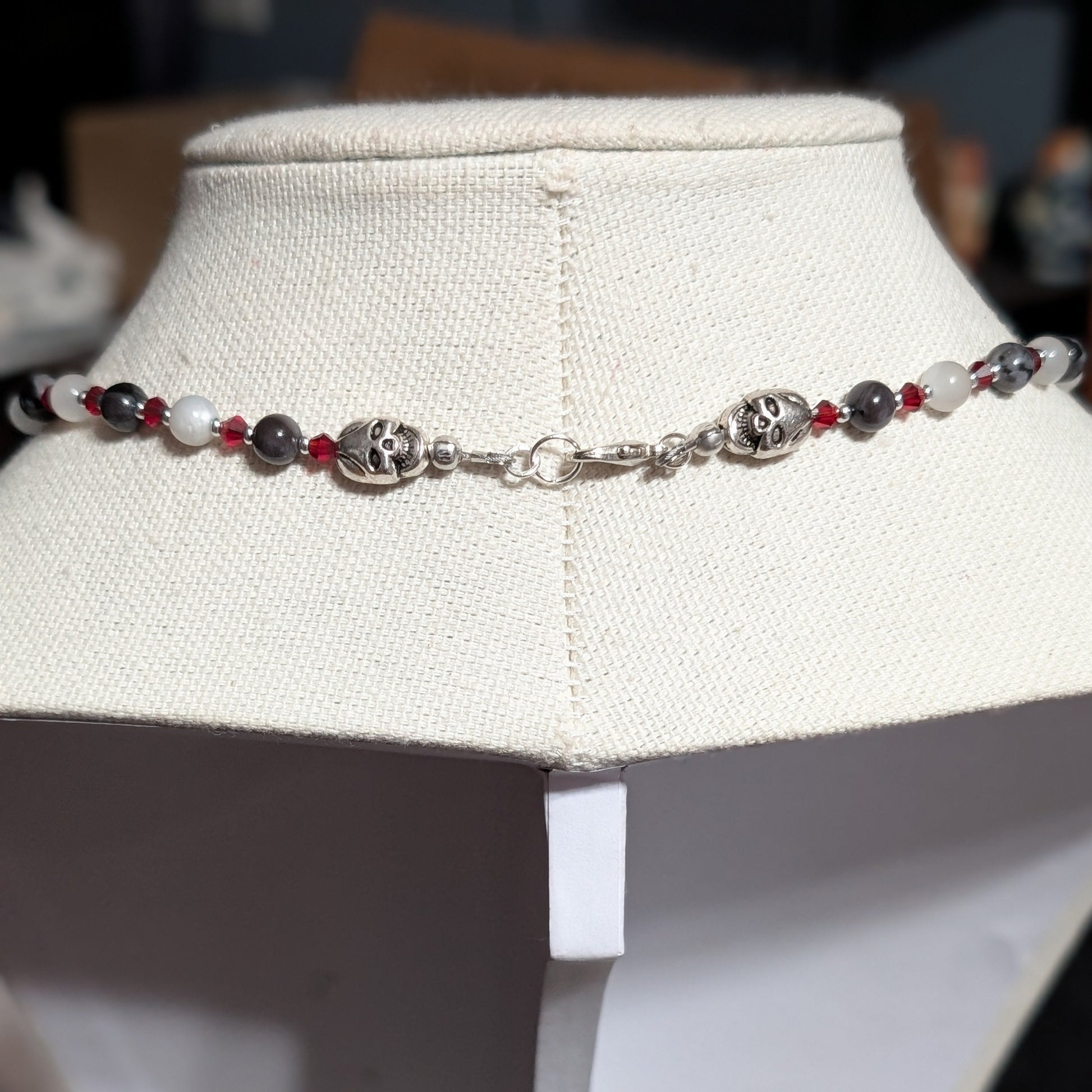 Even the clasp bears its secrets: a pair of skull beads grins mischievously at the back of the neck, a hidden detail meant only for those who know to look.