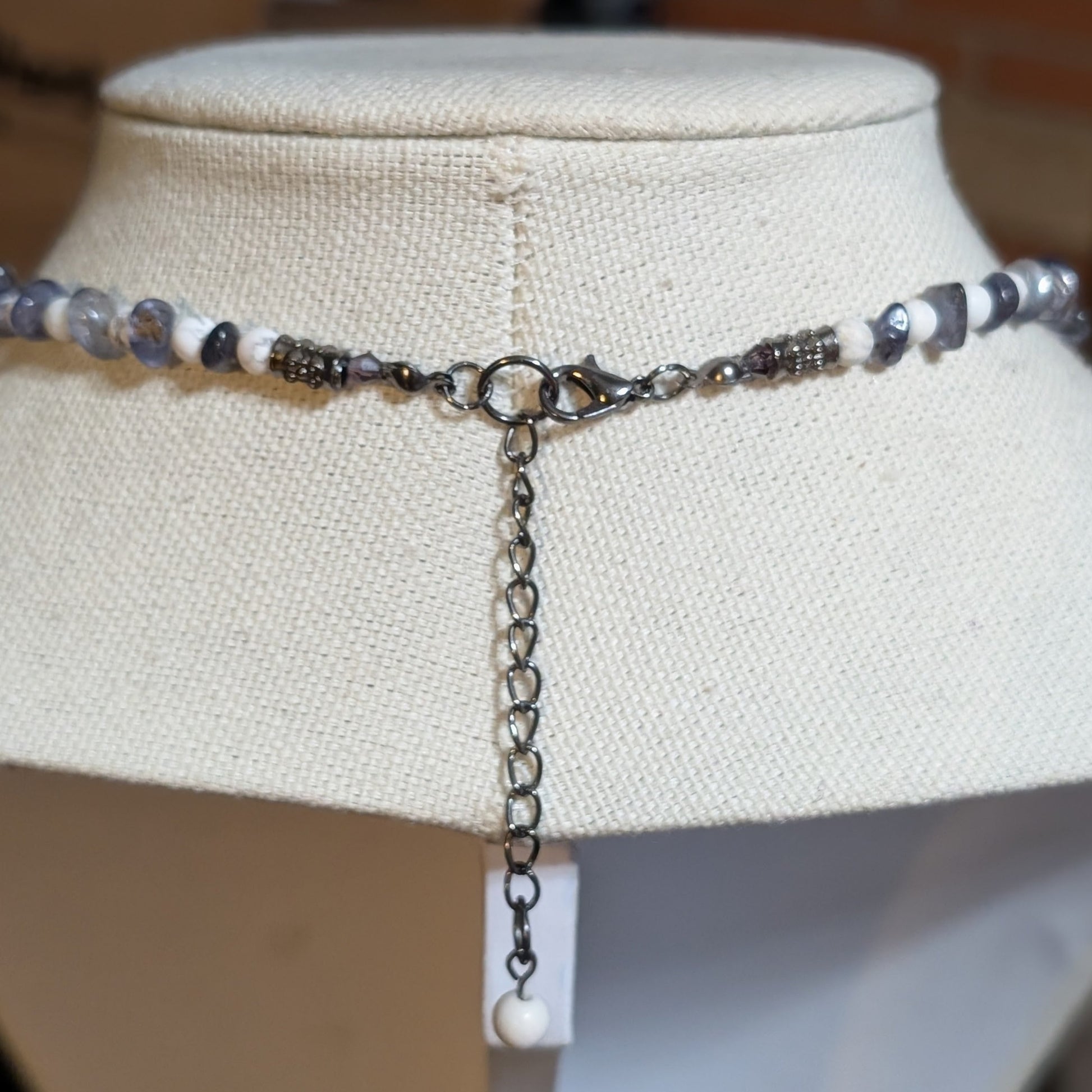 There’s a quiet elegance to Iolisse, a necklace that seems plucked from another century. Genuine iolite beads shimmer with dusky indigo tones, balanced by the cool marble-white of howlite. At the center rests a delicately framed cameo, a portrait frozen in time and haloed by dark, sparkling accents.