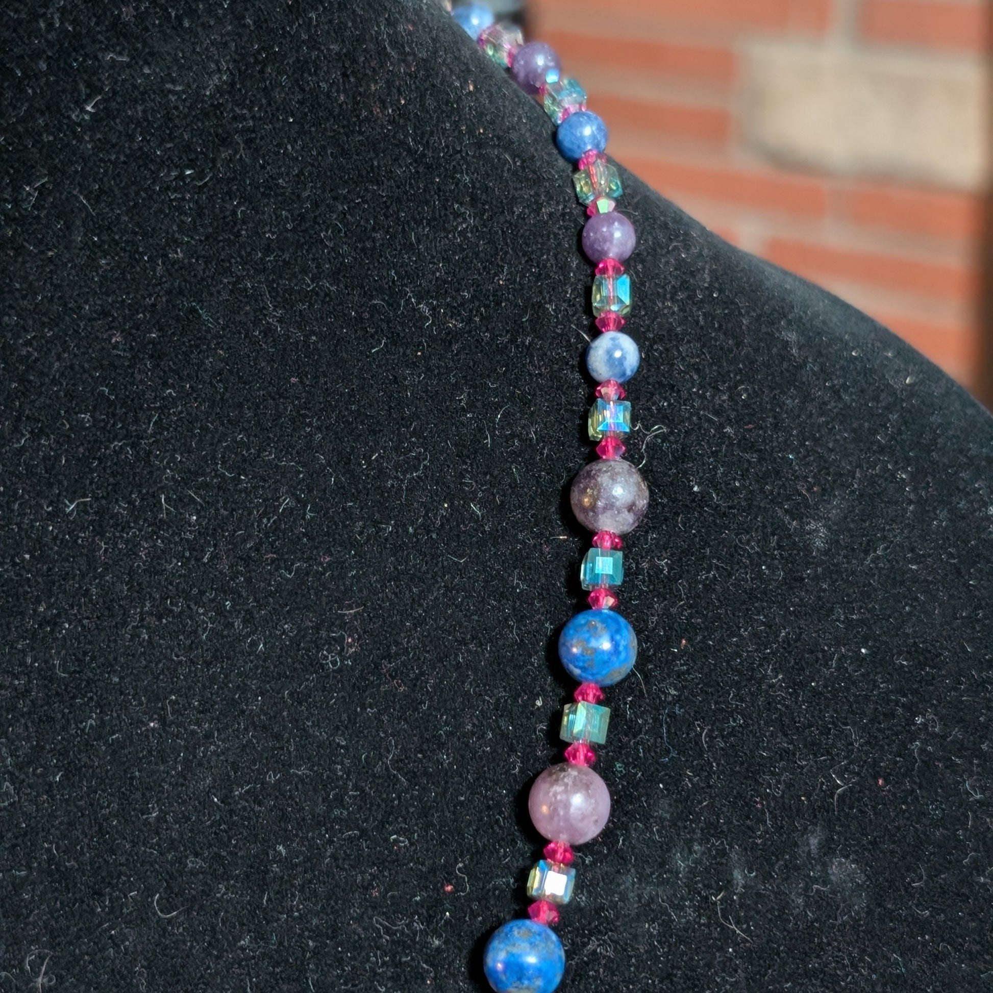 The beads mirror her shifting hues: rich purple charoite, deep lapis lazuli, and dusky sodalite. Iridescent cube crystals and magenta spacers echo her shimmer, giving the strand a rhythm of color that changes with every turn of light.