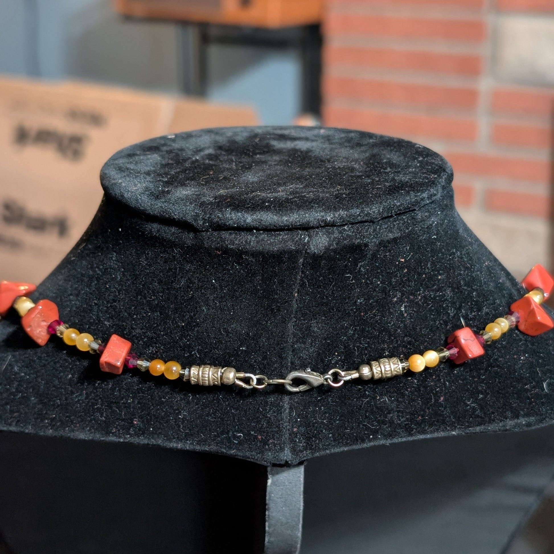 This necklace is strung with the deep reds of red jasper, balanced by the honey warmth of golden tiger’s eye. Faceted crystal accents flicker with light, shifting between olive-green and scarlet depending on the angle—like smoke and flame caught mid-dance. At its heart rests a triangular pendant with a jasper cabochon, a symbol of both focus and balance, framed in bronze tones that ground the fire.