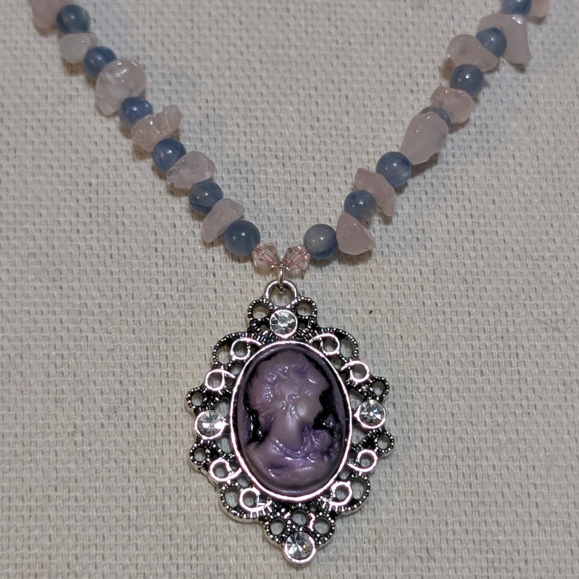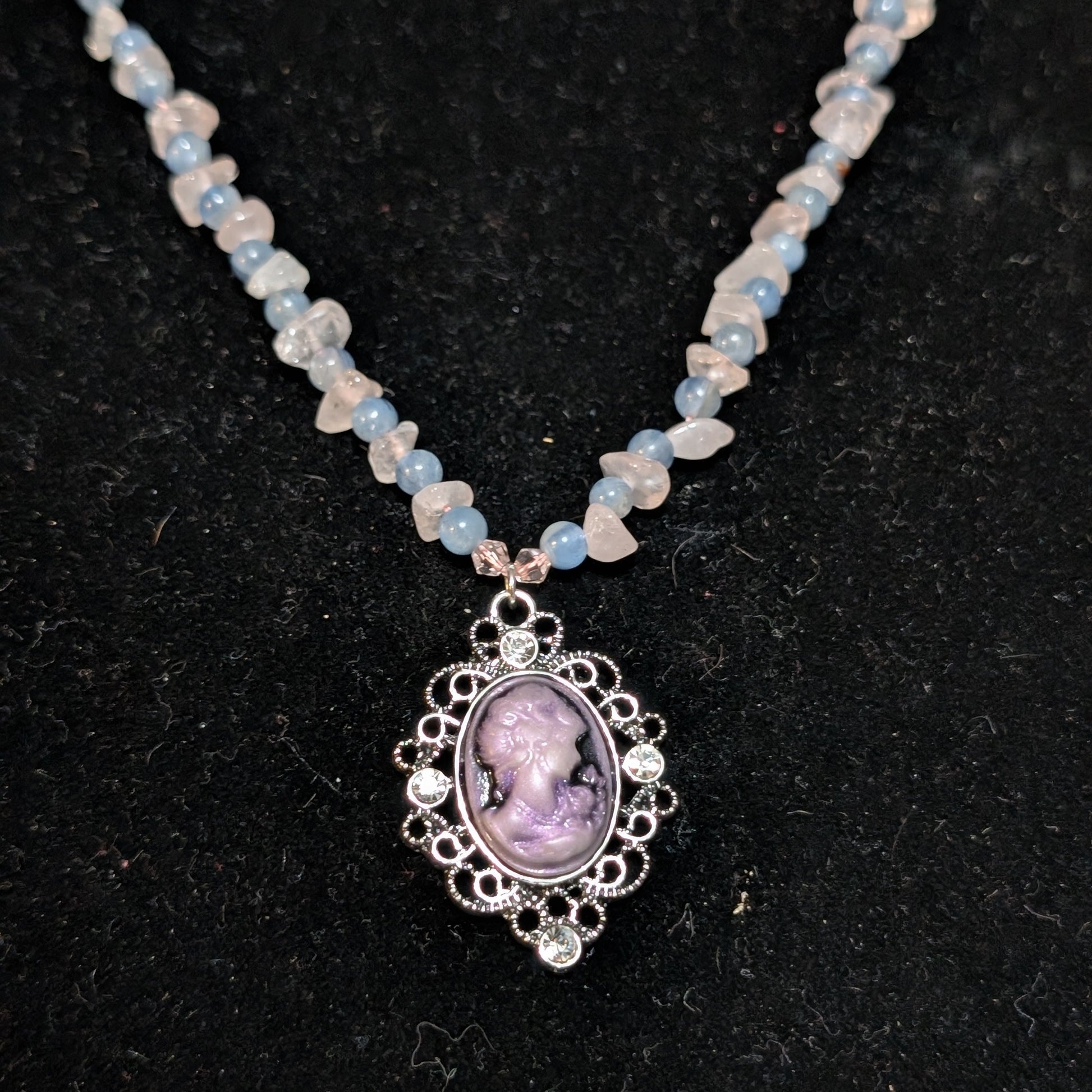 This necklace pairs soft rose quartz with vivid blue kyanite, a duet of gentle blush and bold azure. Each bead feels like a pastel stroke, layered into a string of shifting hues that guide the eye to the centerpiece: a lavender cameo framed in silver filigree and rhinestones. At the clasp, tiny silver rose accents bring a finishing flourish, like petals tucked into a sealed letter.