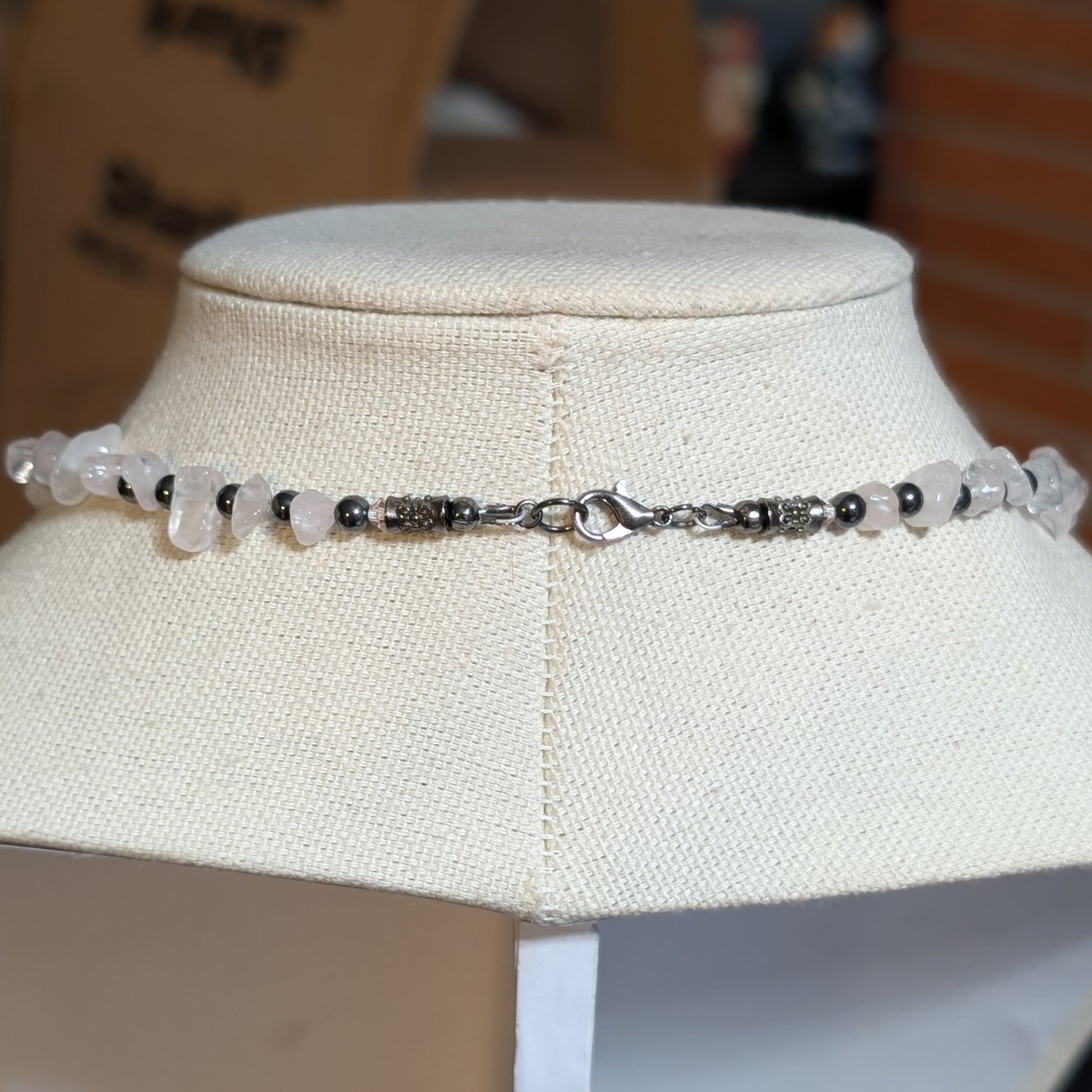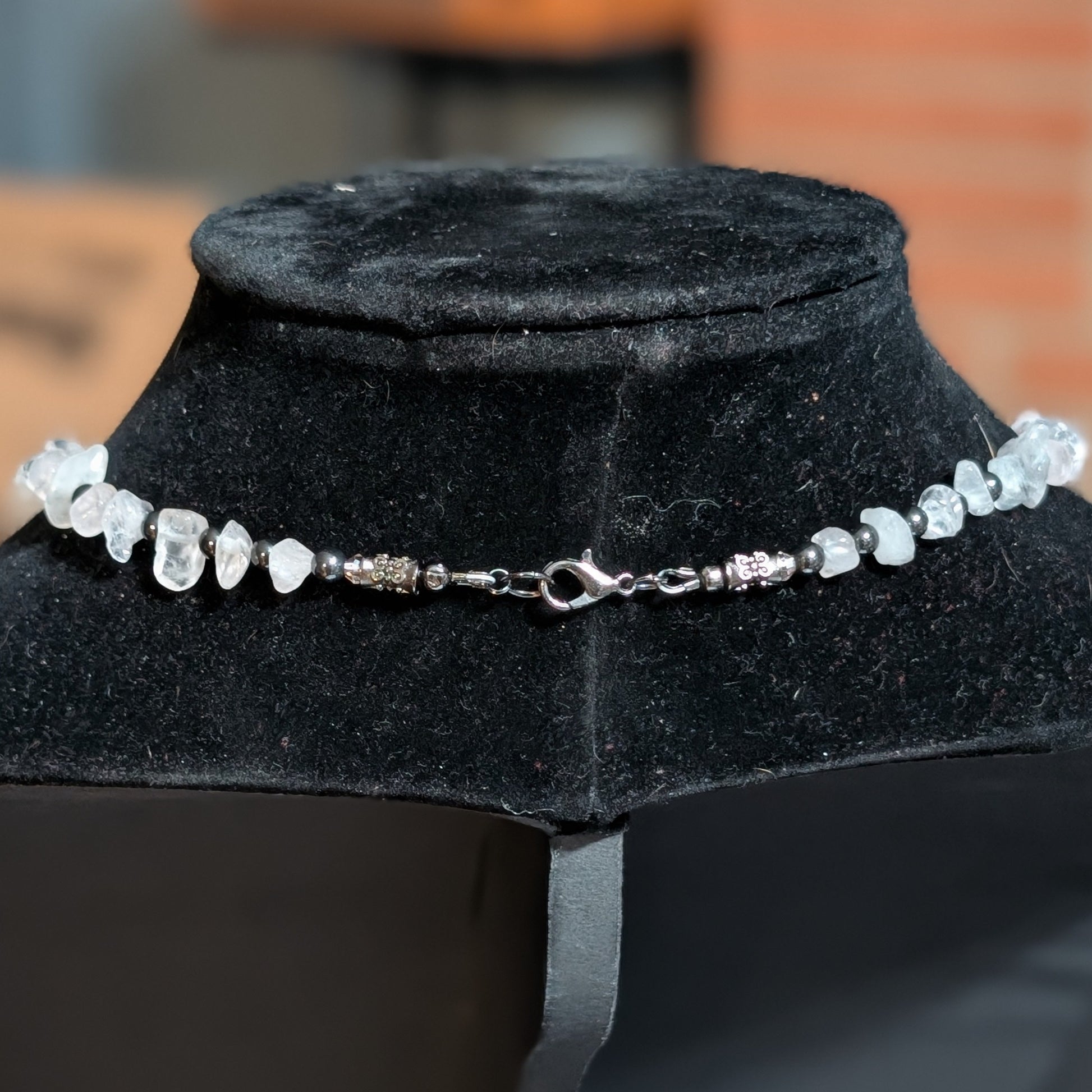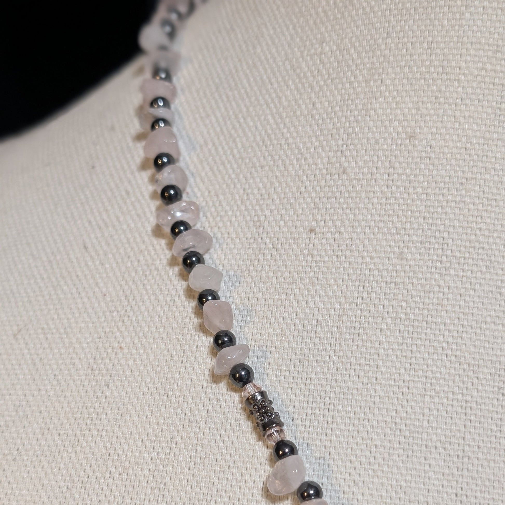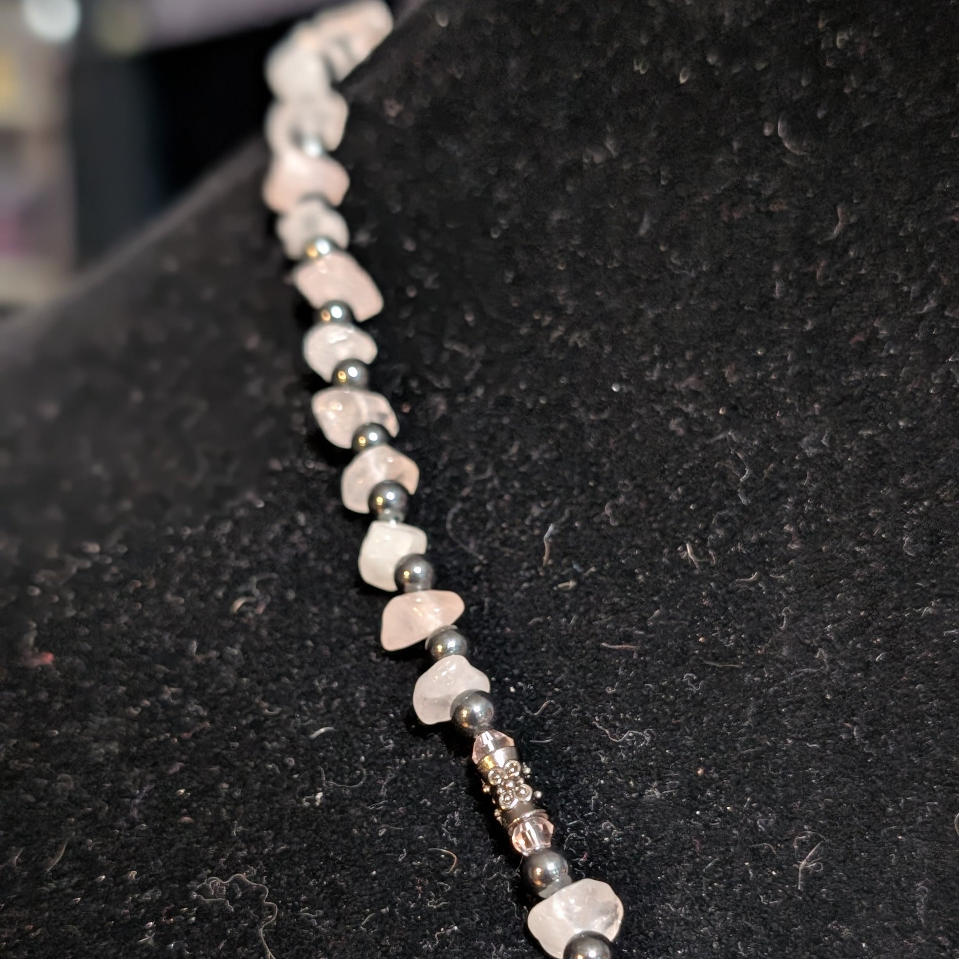But look closer. Hematite beads gleam like polished armor, grounding the sweetness with steel, and one subtle bar of gunmetal stands defiantly among the stones — a deliberate scar, a sly smirk. It’s the kind of detail you notice once and never forget.