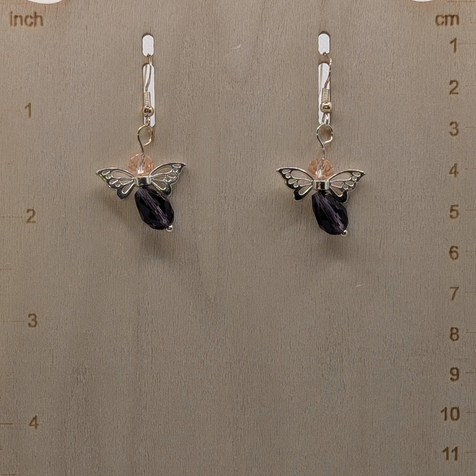 These lightweight fairy earrings are made with soft peach-pink and plum purple faceted glass beads, silver-toned fairy wings, and nickel-free earwires. The shimmer is gentle, the length is short, and the charm is thoroughly dreamy.
