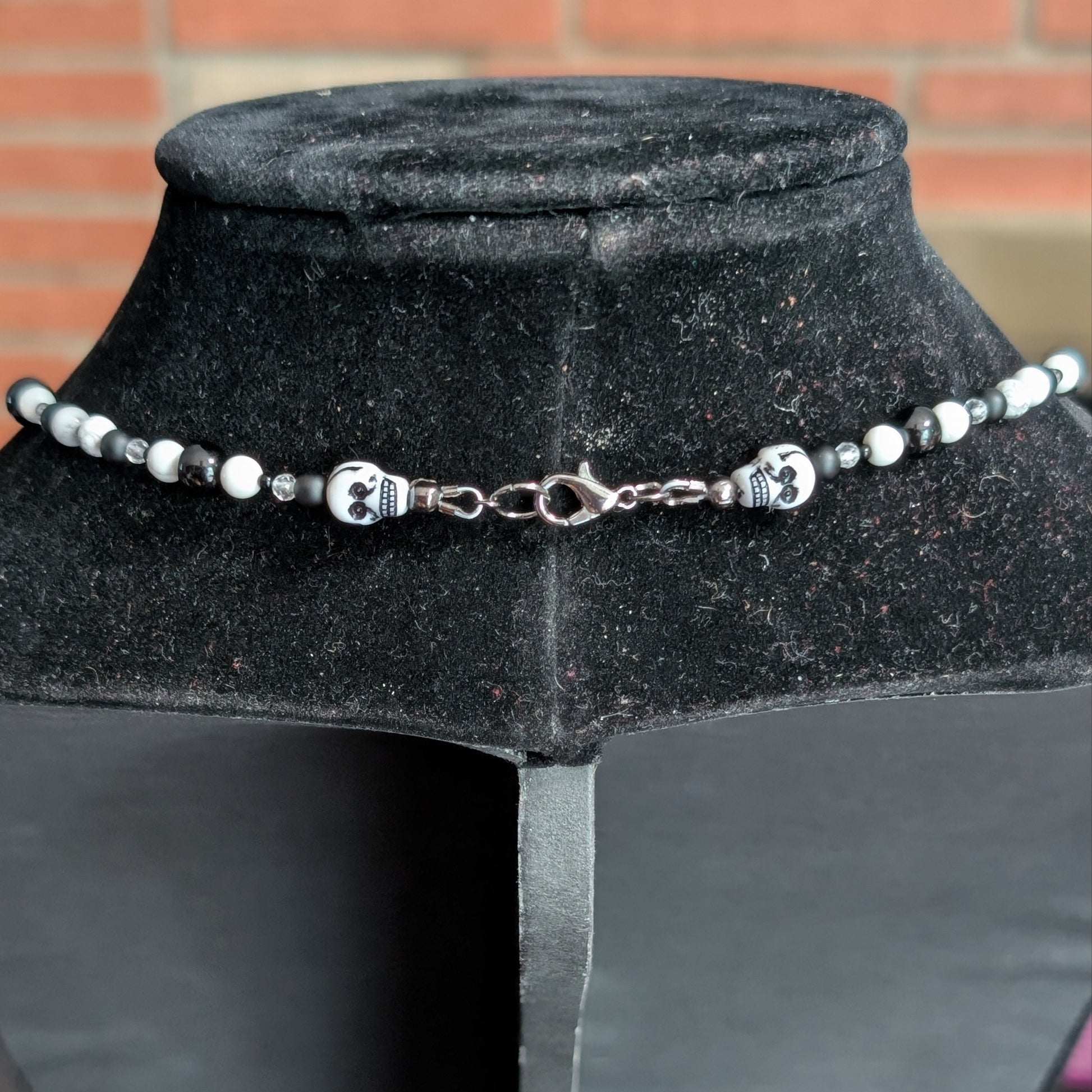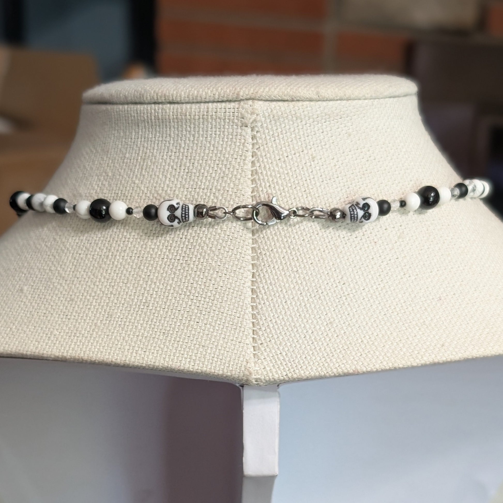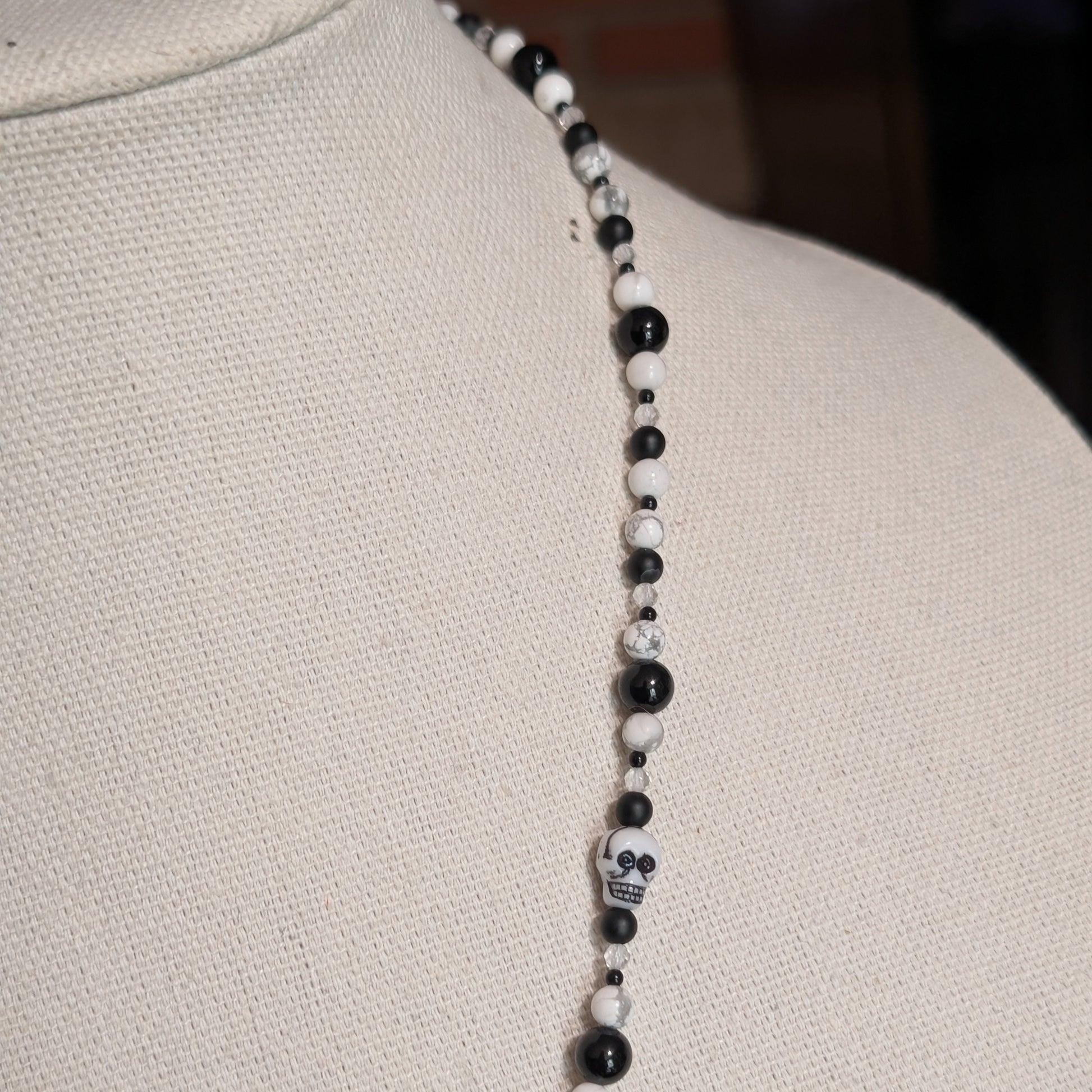 The strand that frames her tells her story: onyx and howlite beads shifting in balance, punctuated by skeletal accents that echo her retinue — the household she rules with a firm but protective hand. Clear quartz lends its crystalline glimmer, as though her authority extends not just through shadow, but through clarity and light.