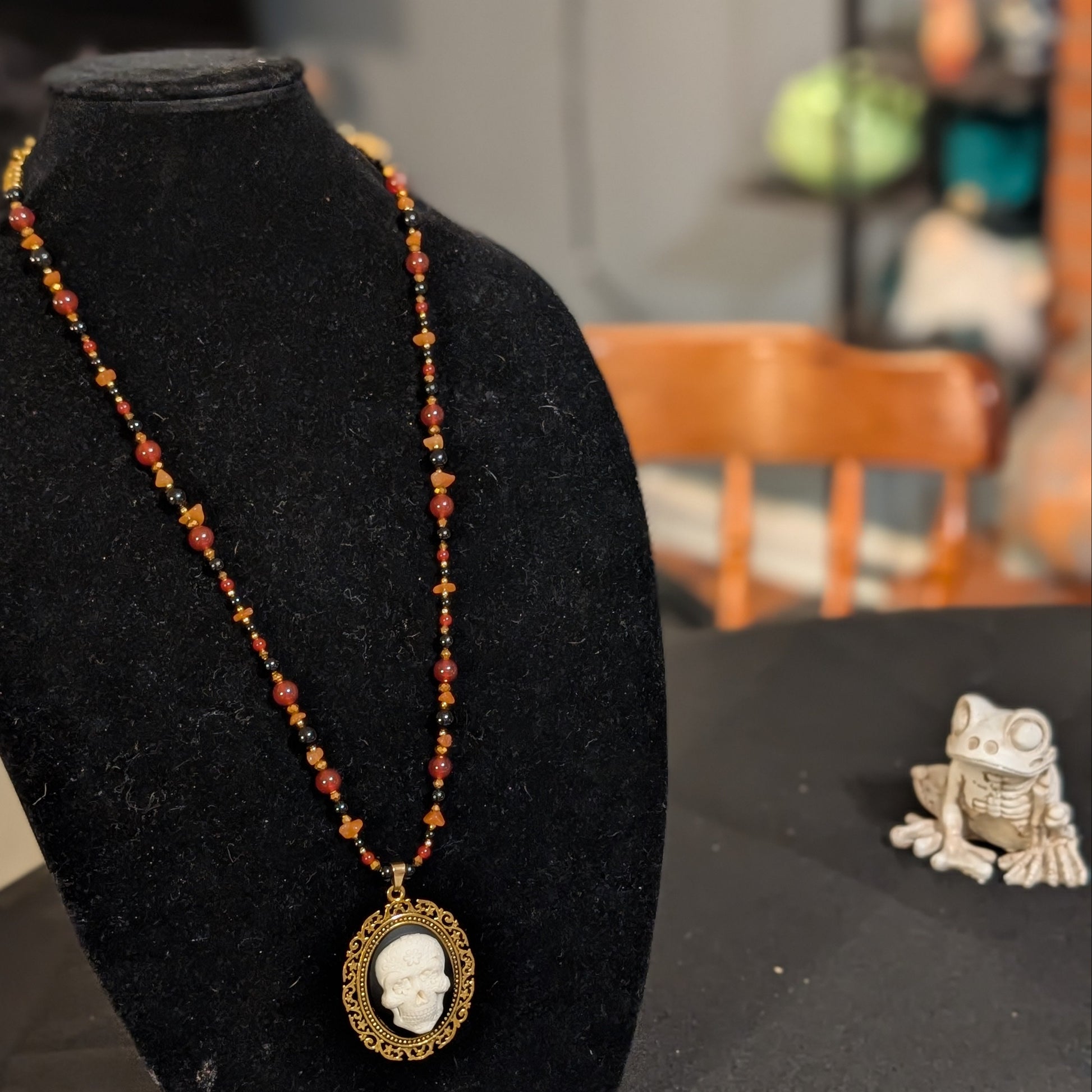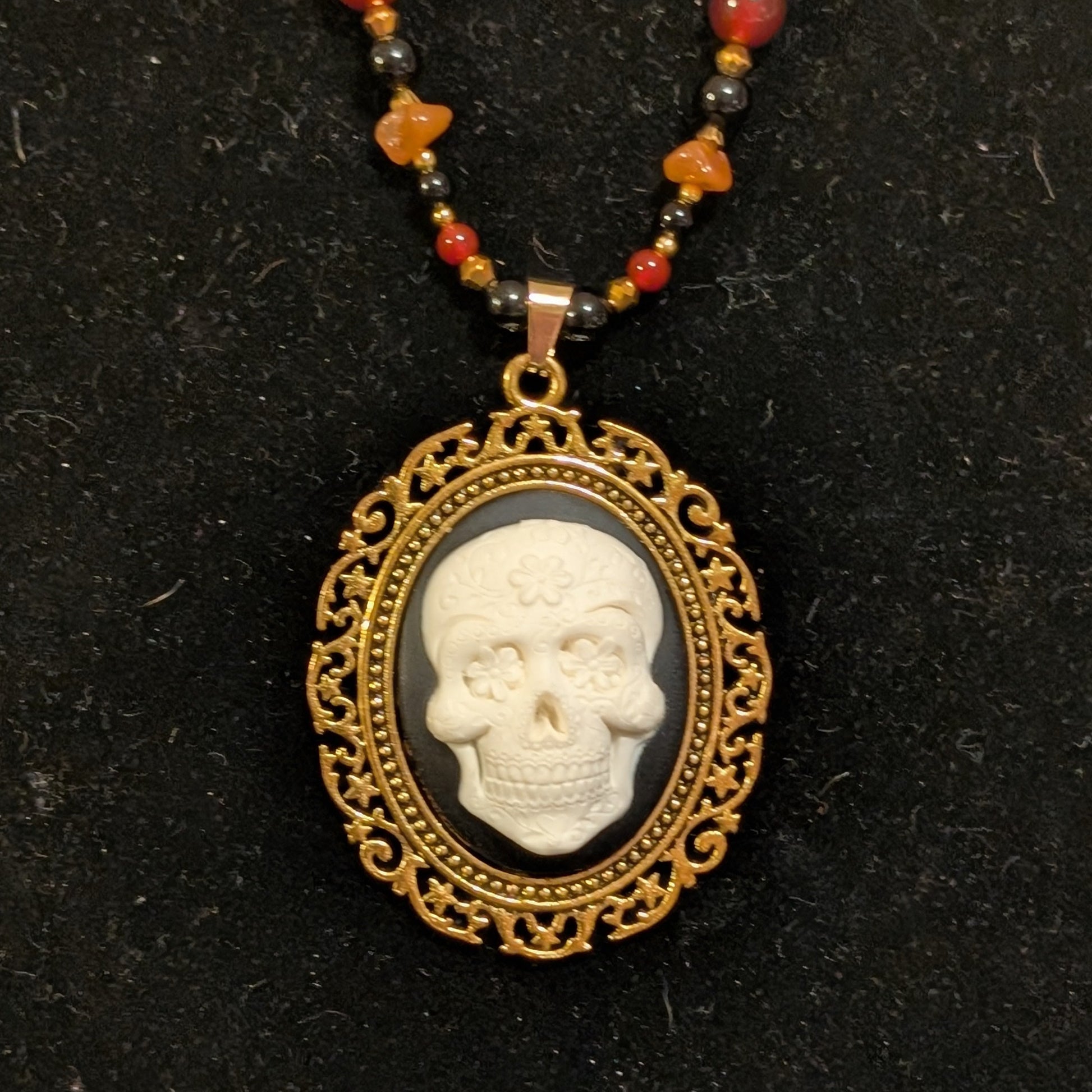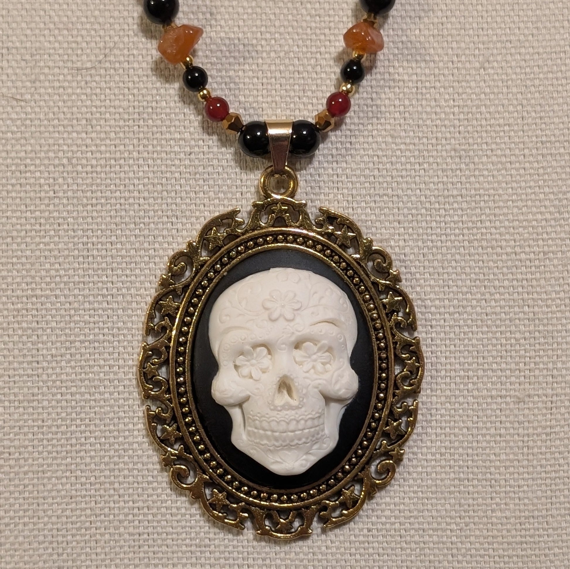 ✨Mariskullisman✨| Red Agate, Onyx, & Orange Aventurine Marigold Skull Cameo Necklace