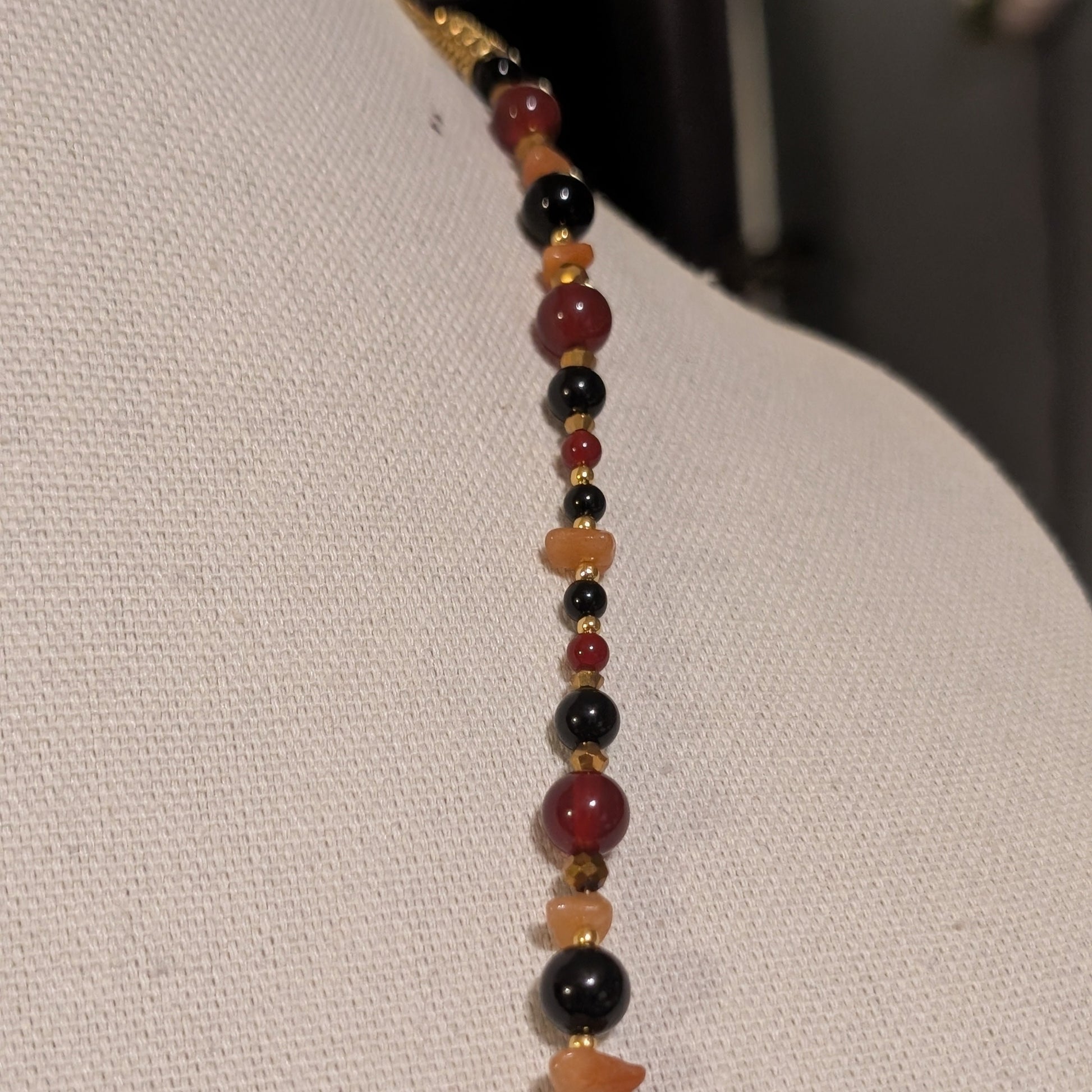 Mariskullisman is strung from red agate and onyx, balanced with antique-gold spacers that gleam like candlelight in procession. Red for vitality, orange for renewal, black for protection — every hue chosen with purpose, every bead a note in the quiet hymn of legacy.