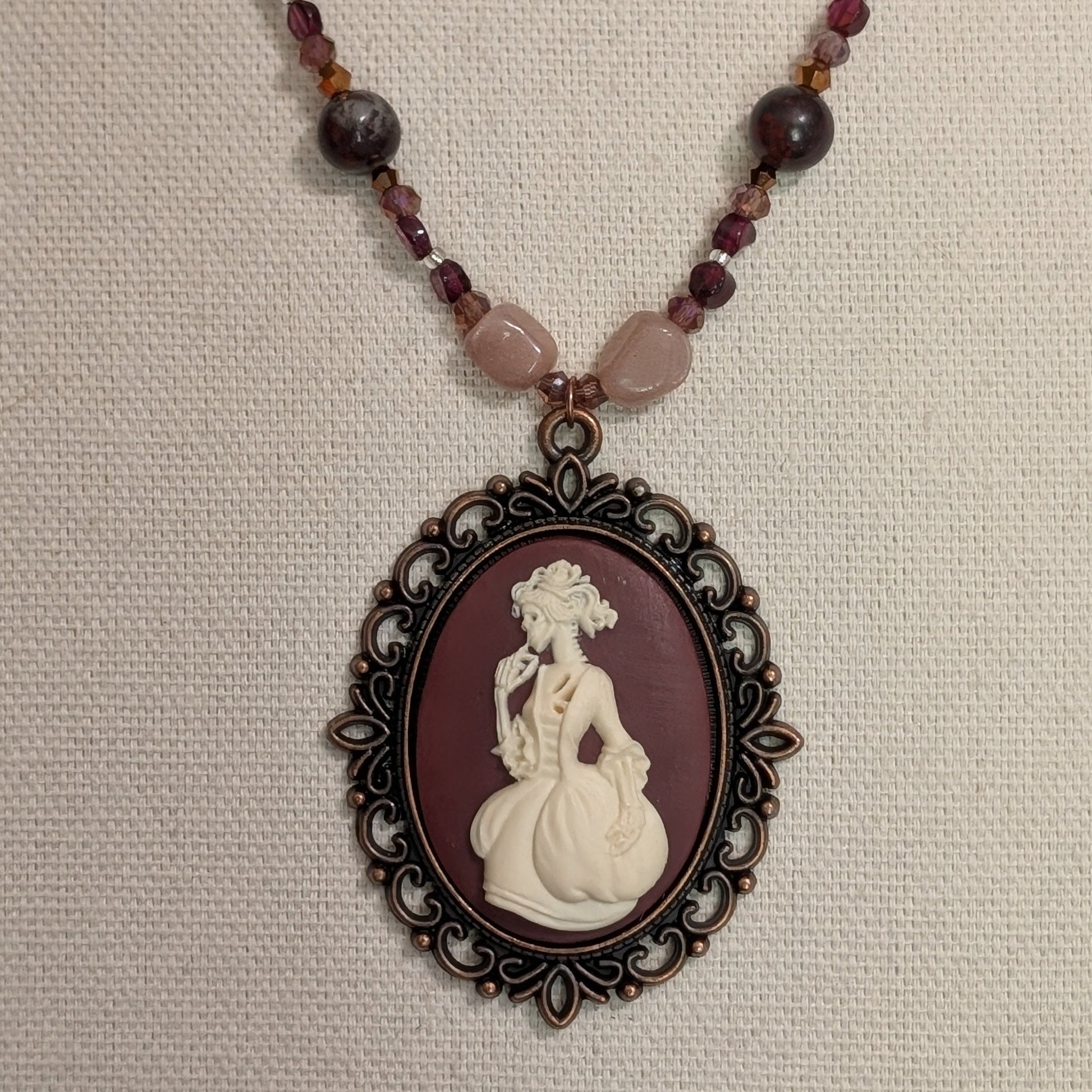 ✨Mauvelight Intrigue✨| Rhodolite Garnet, Sunstone & Tourmaline-in-Jasper Necklace With Skeletal Cameo & Floral Toggle