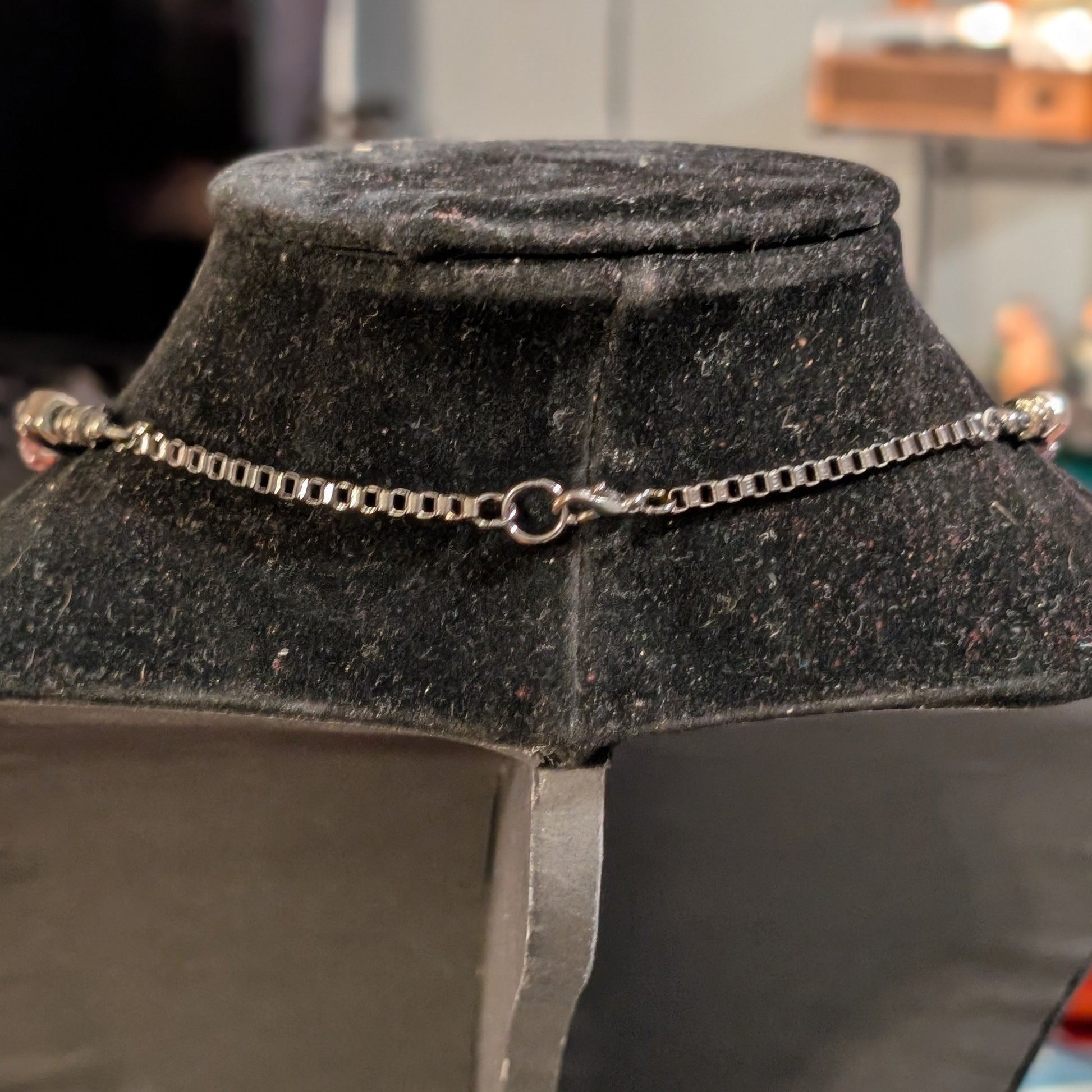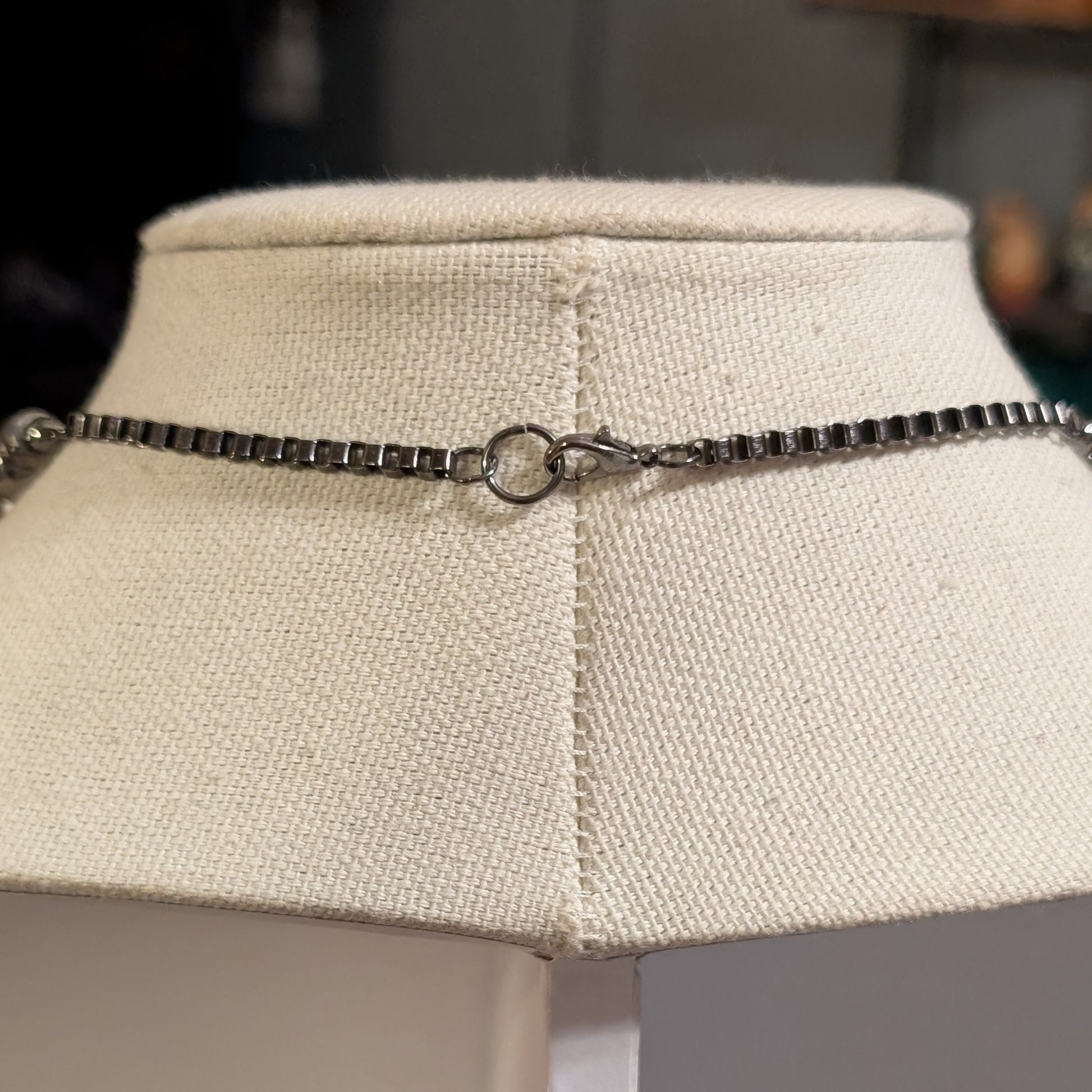 From the shadowed wing of the Cameo Court comes a warding trinket whispered to blunt the gaze of monsters and men. A black oval bears the pale visage of Medusa-as-memento—skull crowned in living serpents—framed in dark ropework like iron spun by Fates. Along the strand, temple-marble howlite keeps its cool counsel while wine-dark garnet chips mark the path like spilled pomegranate seeds. Faceted gunmetal glints with the faintest green-blue flicker—scale-light, here and gone—so the magic stays subtle until the moon finds it. Square-link chain at the shoulders wears like light armor; a single skull sentinel (at each side) minds the borders and lets the cameo keep court.