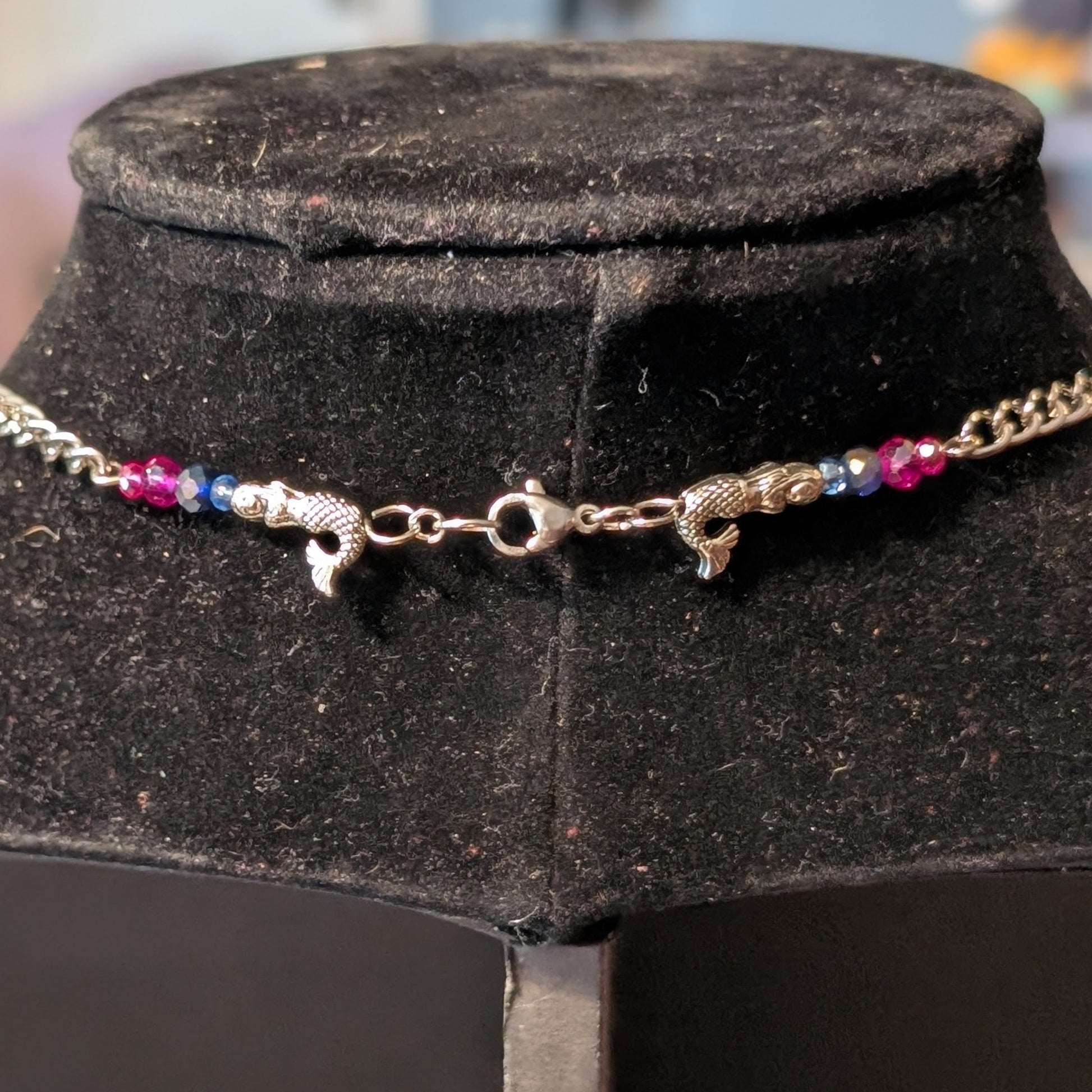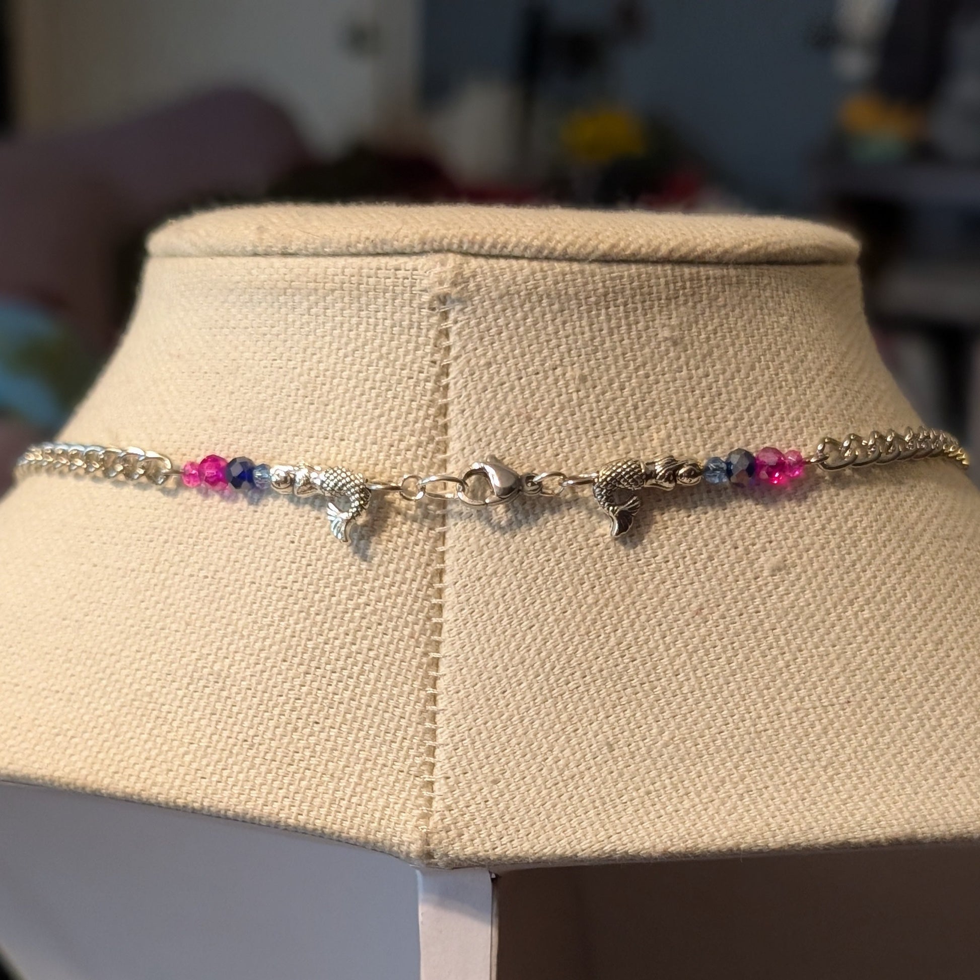 This necklace holds that melody. A silver-framed mermaid cameo rests at its center, surrounded by sparkling stones of ocean blue and coral pink — the twin colors of Melusina’s secret. Along the chain, tiny mermaid charms swim between clusters of matching crystals, like echoes of her companions weaving through waves. The result is bright, graceful, and quietly enchanted — an everyday treasure that still hums faintly of tide and sunlight.
