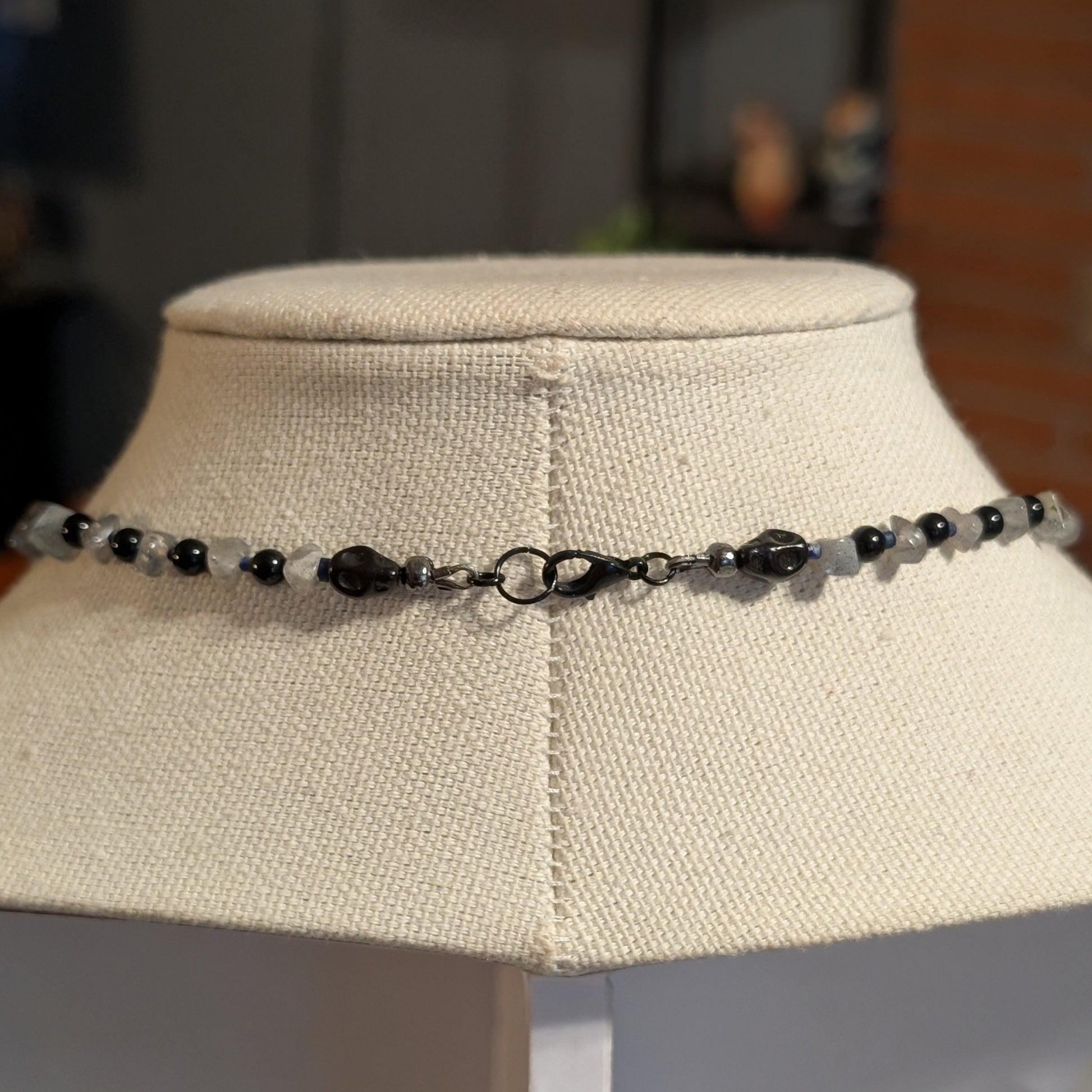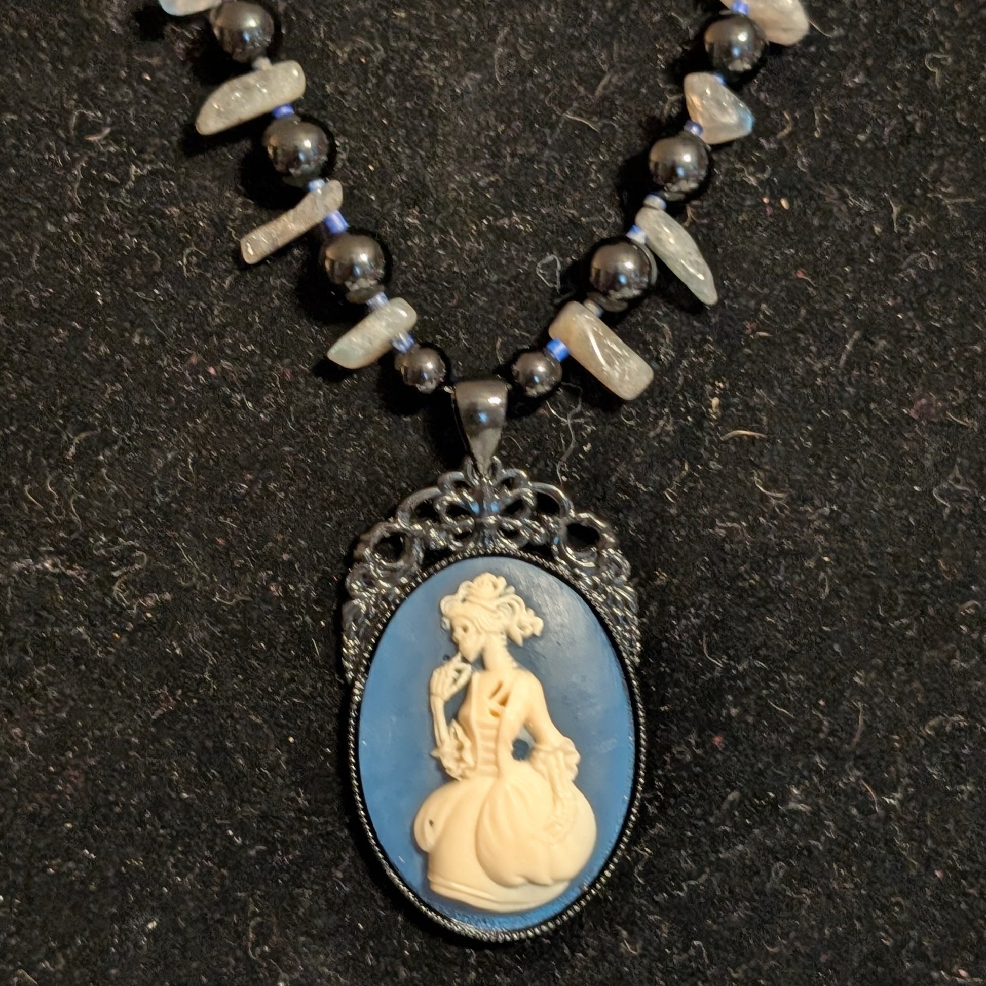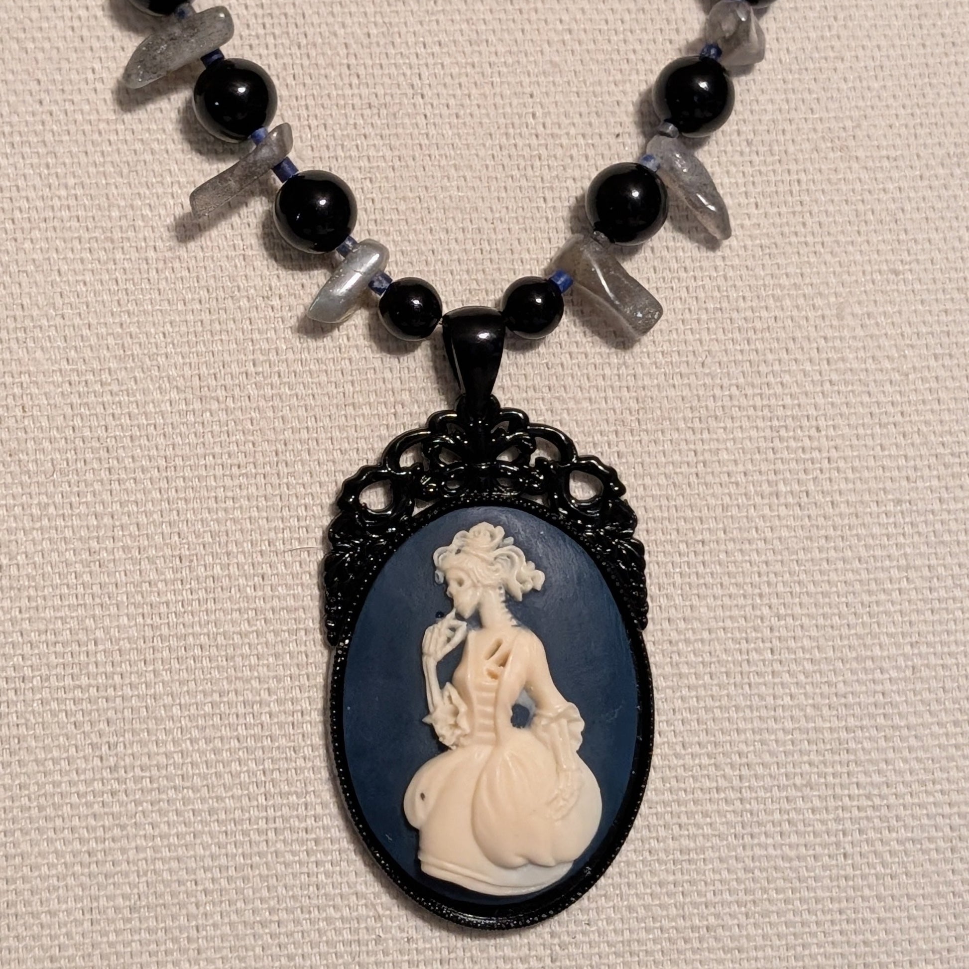 Her face is calm as moonlight, carved in pale relief against a storm-blue backdrop, framed in filigree black as the night she inhabits. Labradorite chips flicker with spectral fire, as though each one holds a secret reflection of her thoughts. Onyx rounds mirror that depth — smooth, polished, unreadable — while tiny beads of lapis tie the strand to her midnight sky. Hidden at the clasp, two skulls keep silent watch, the perfect chaperones for a lady who never quite left the ball.
