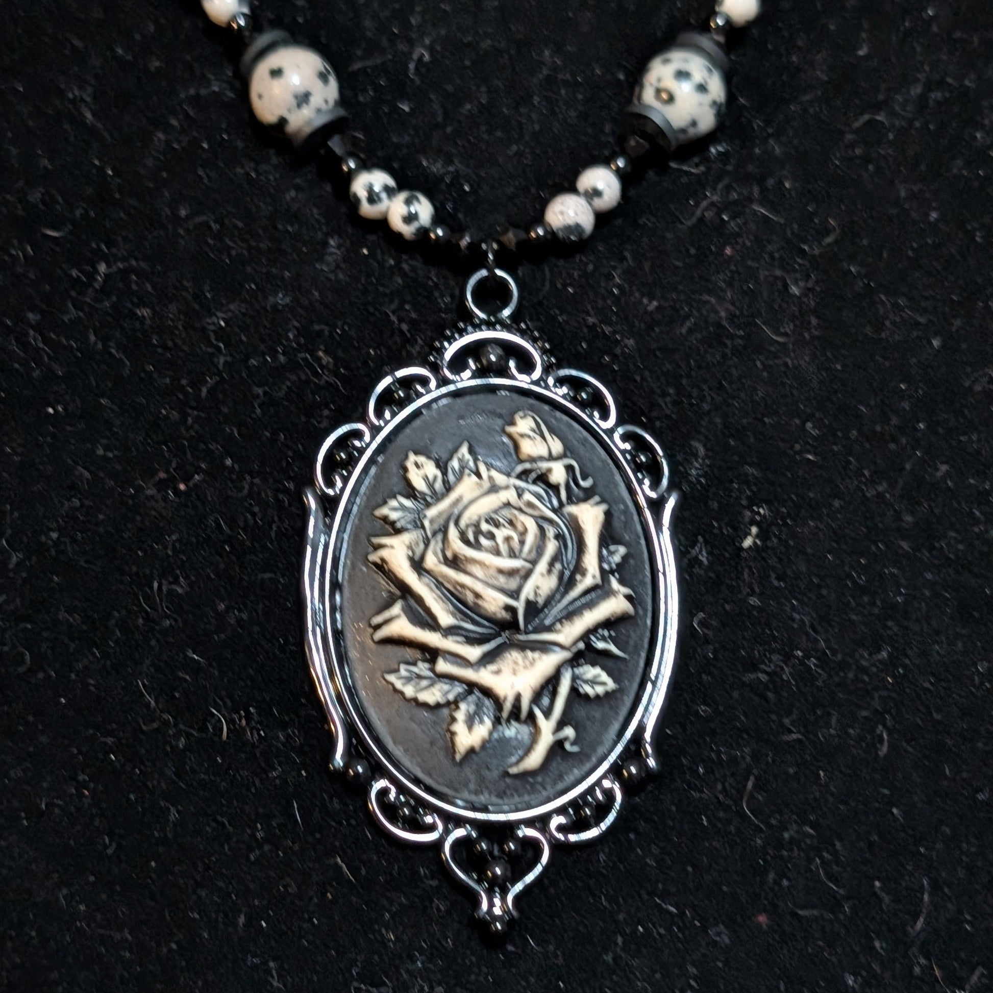 ✨Monochrose✨| Dalmatian Jasper & Black Tourmaline Necklace with Gothic Rose Cameo