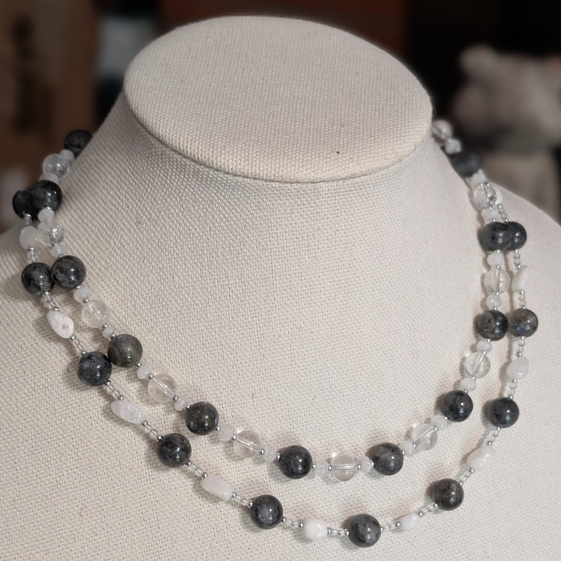 ✨Moonlace✨| Larvikite, Rainbow Moonstone & Clear Quartz Double Strand Necklace