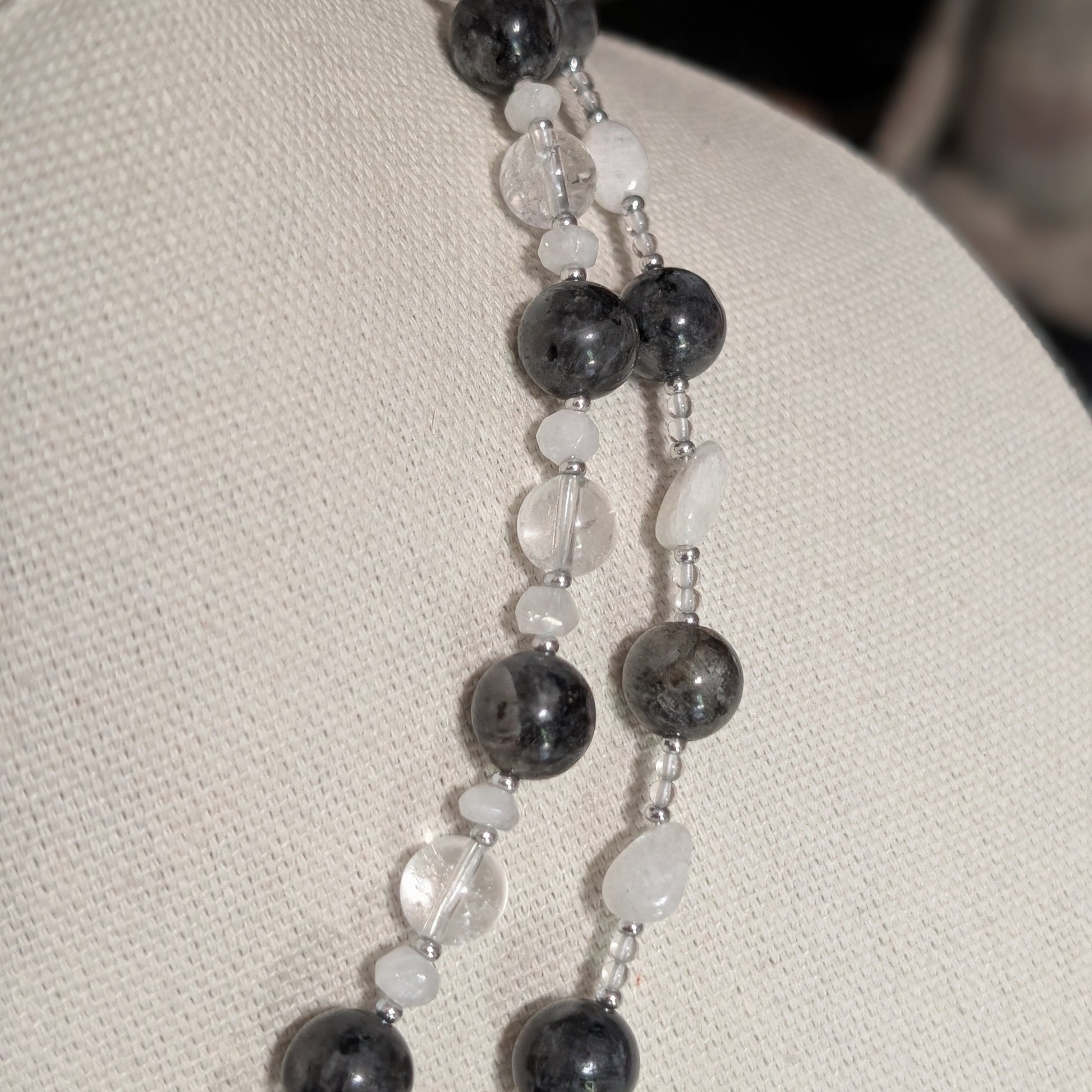 Handmade from larvikite, rainbow moonstone, and clear quartz, this piece layers two unique strand patterns: one darker and grounded, one lighter and luminous. The stones shift from shadow-gray to pearly white, with flickers of rainbow fire peeking out as you move.
