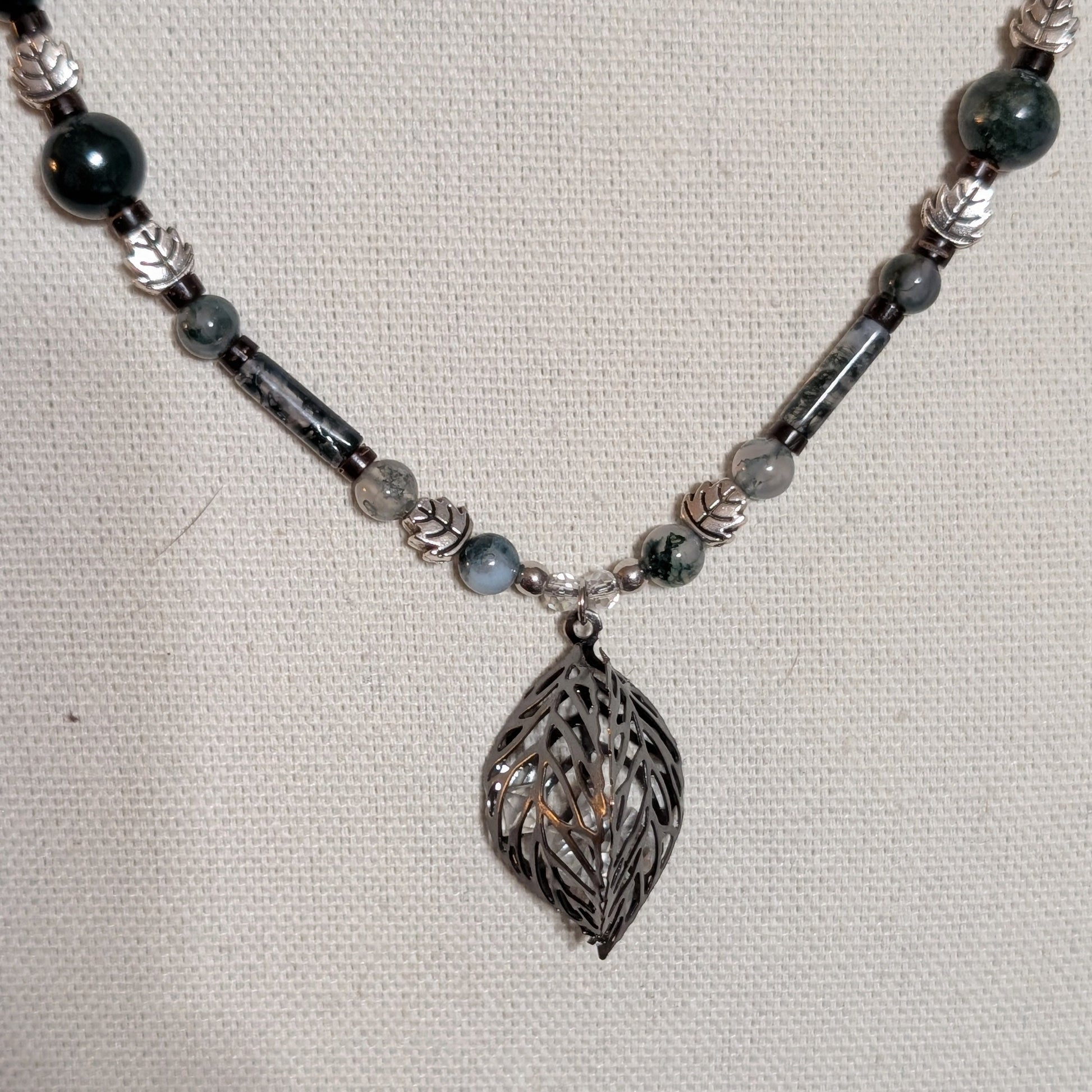 Mossleaf Glen gathers them all into one talisman: moss agate beads in shifting shades of green, tiny wood heishi beads grounding the design with warm earth tones, and scattered silver-toned leaf spacers to echo branches and vines. At its heart hangs a carved wooden leaf pendant, paired with subtle leafy details, as though the necklace itself were grown rather than made.