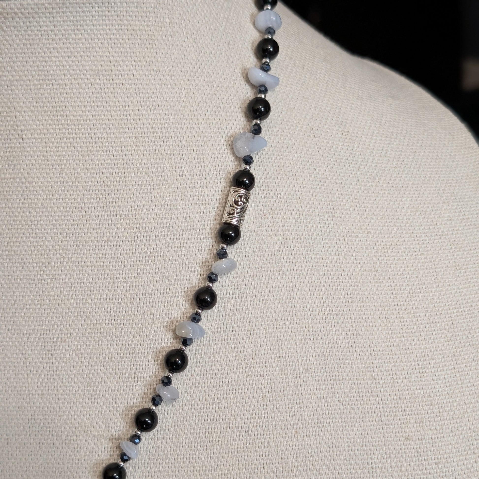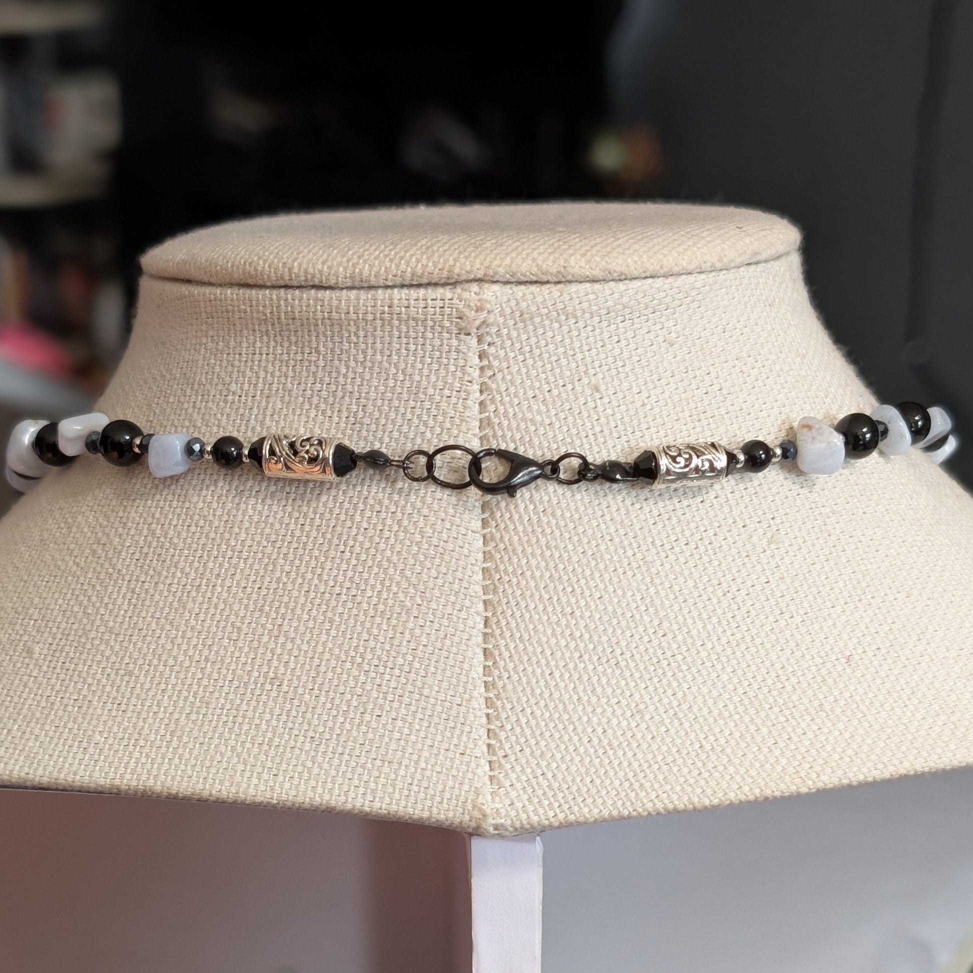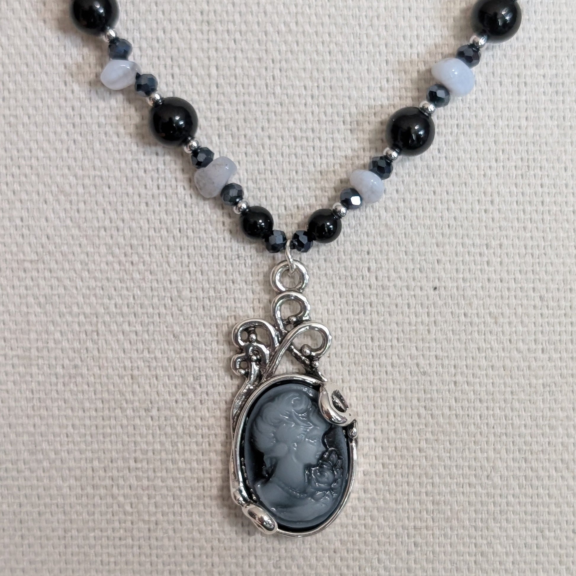 ✨Nocturne Veil✨| Blue Lace Agate & Onyx Necklace with Smoke-gray Cameo Pendant