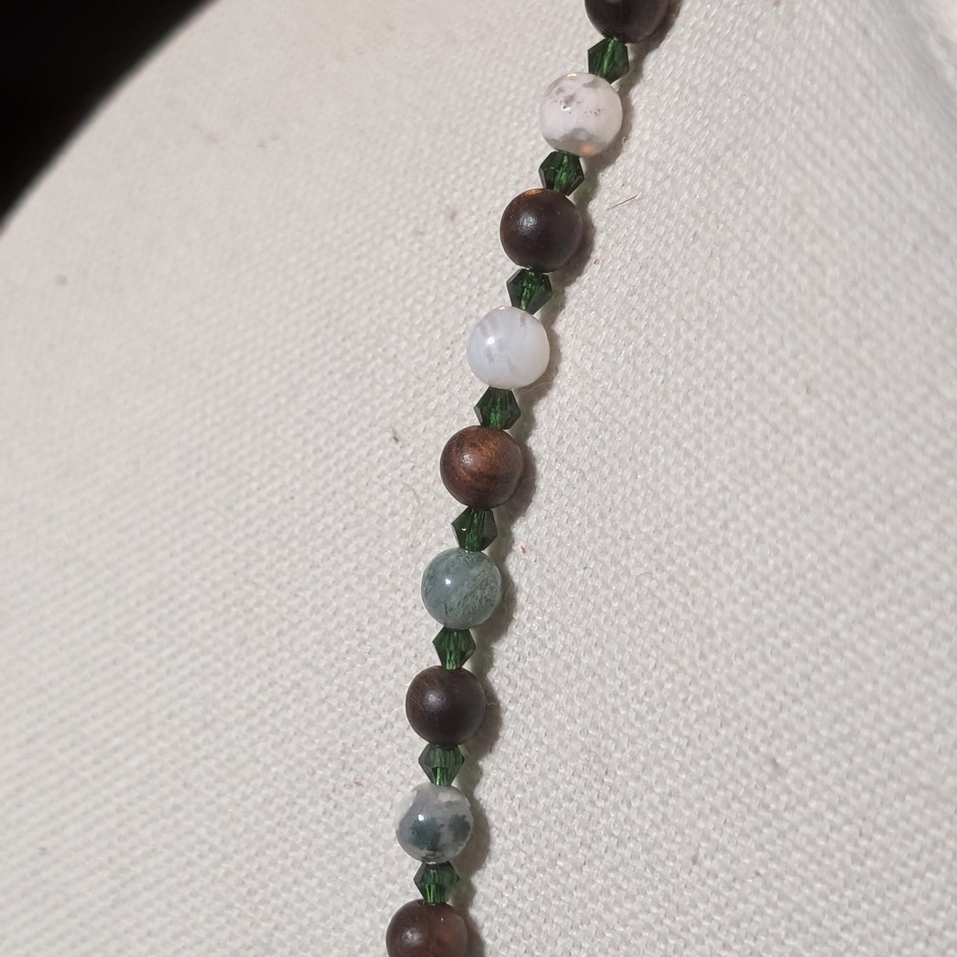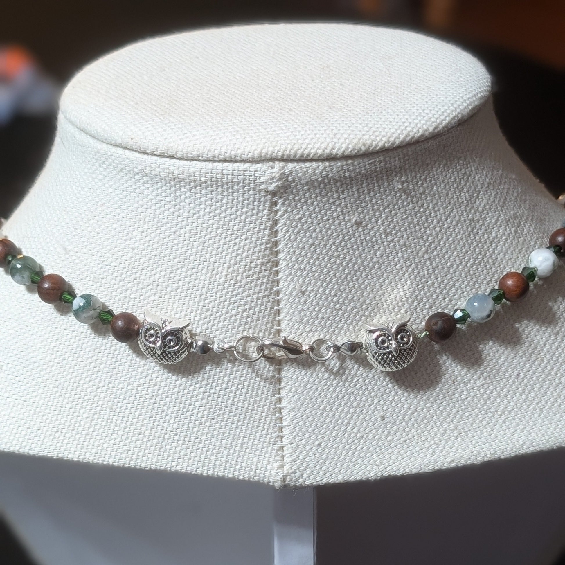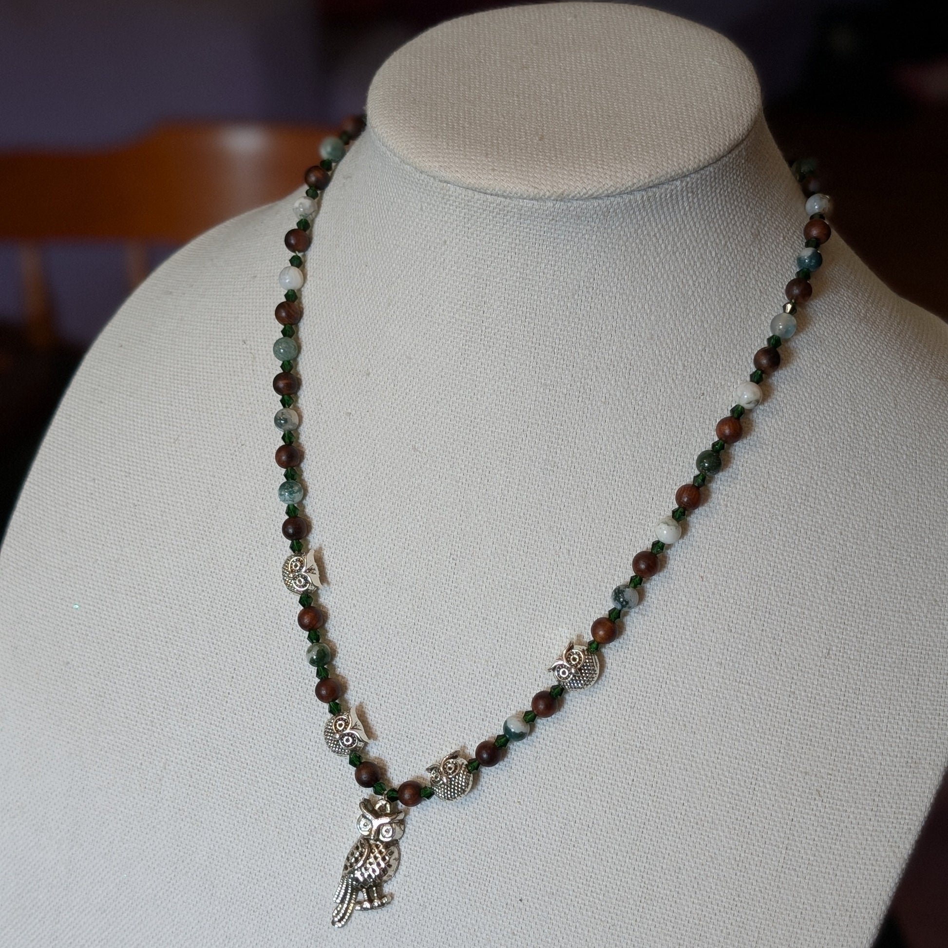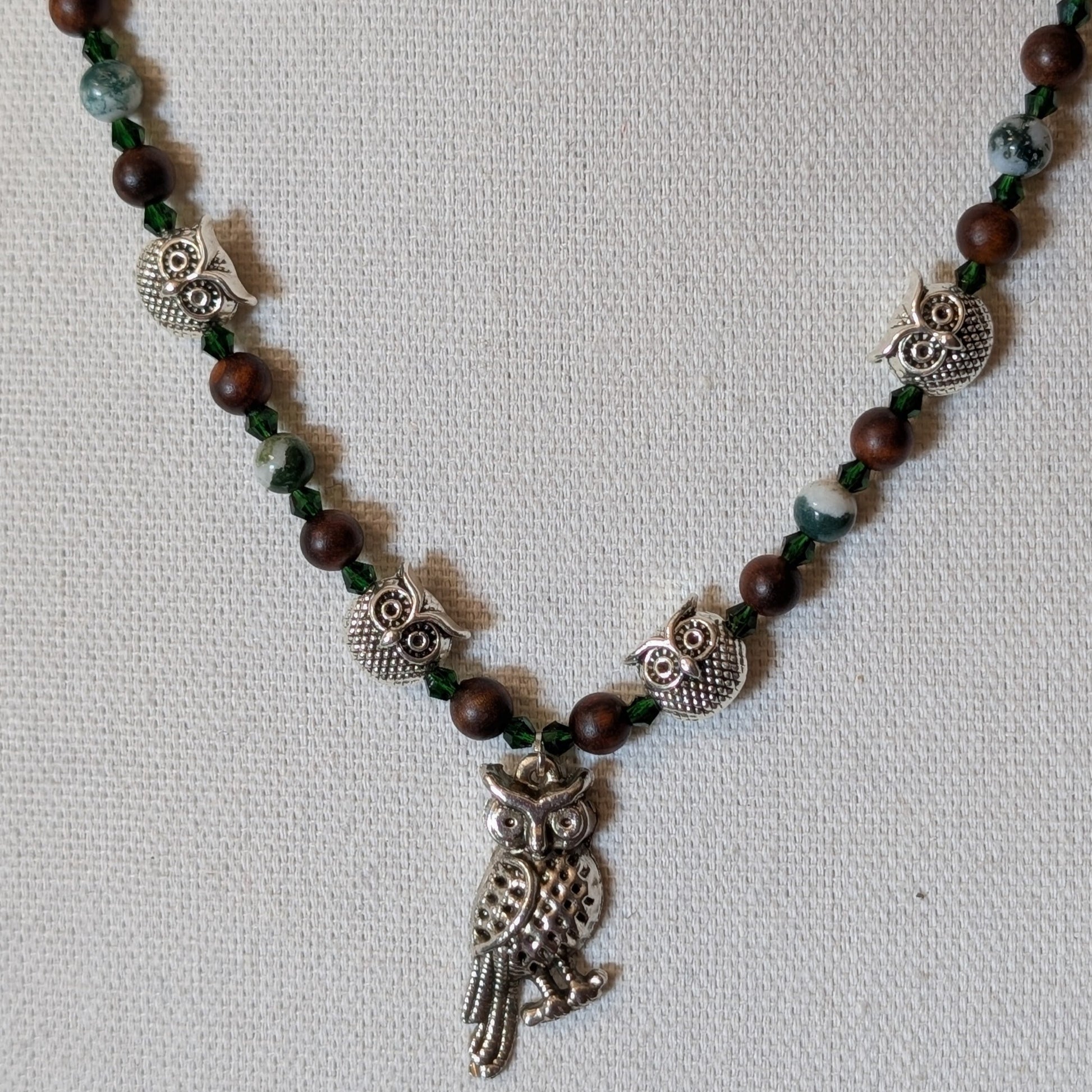 In human lore, owls symbolize wisdom, intuition, and the kind of silence that speaks volumes. It’s a fitting role for the centerpiece figure: the one who’s seen things, heard things, and now—reluctantly—has office hours. This necklace doesn’t just feature owls; it plays out a whole scene, complete with leafy ambiance and a little mischief between the beads.