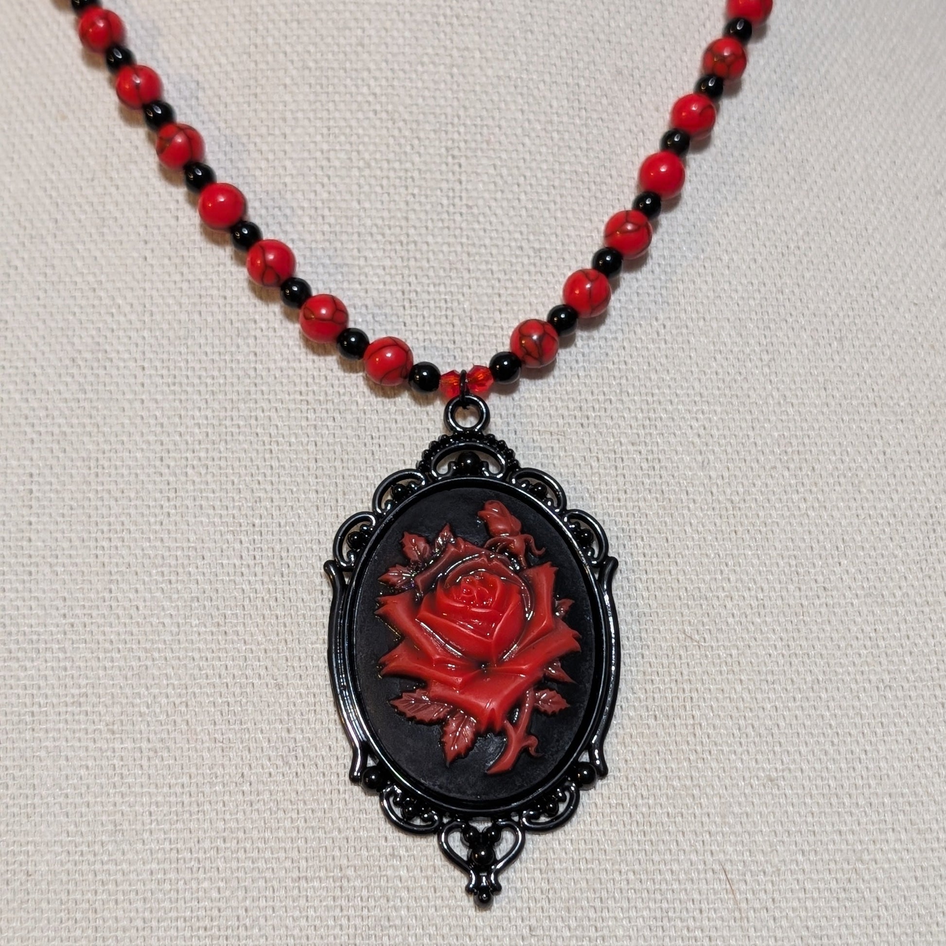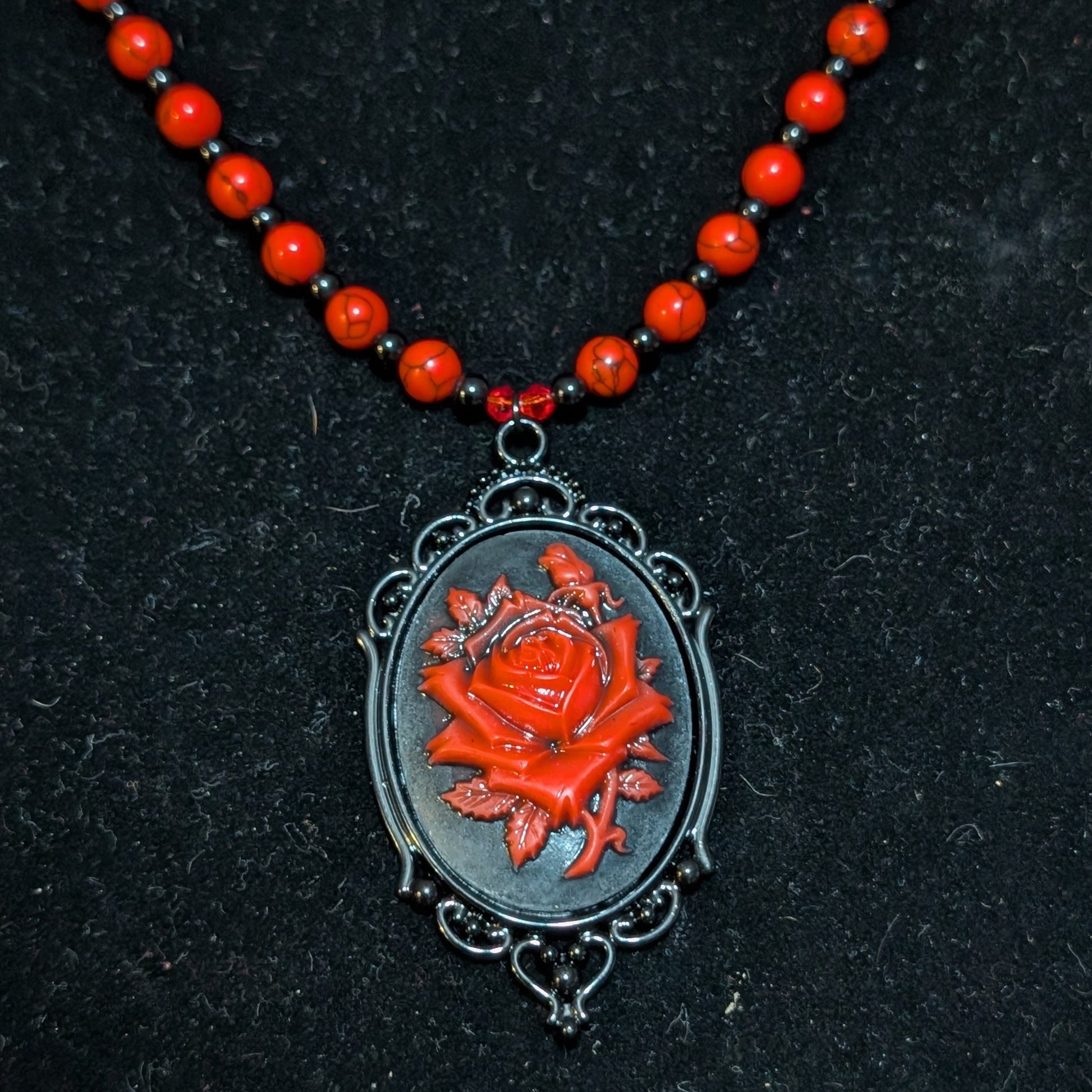 ✨Petalvenom✨| Red Turquoise & Onyx Necklace with Gothic Rose Cameo