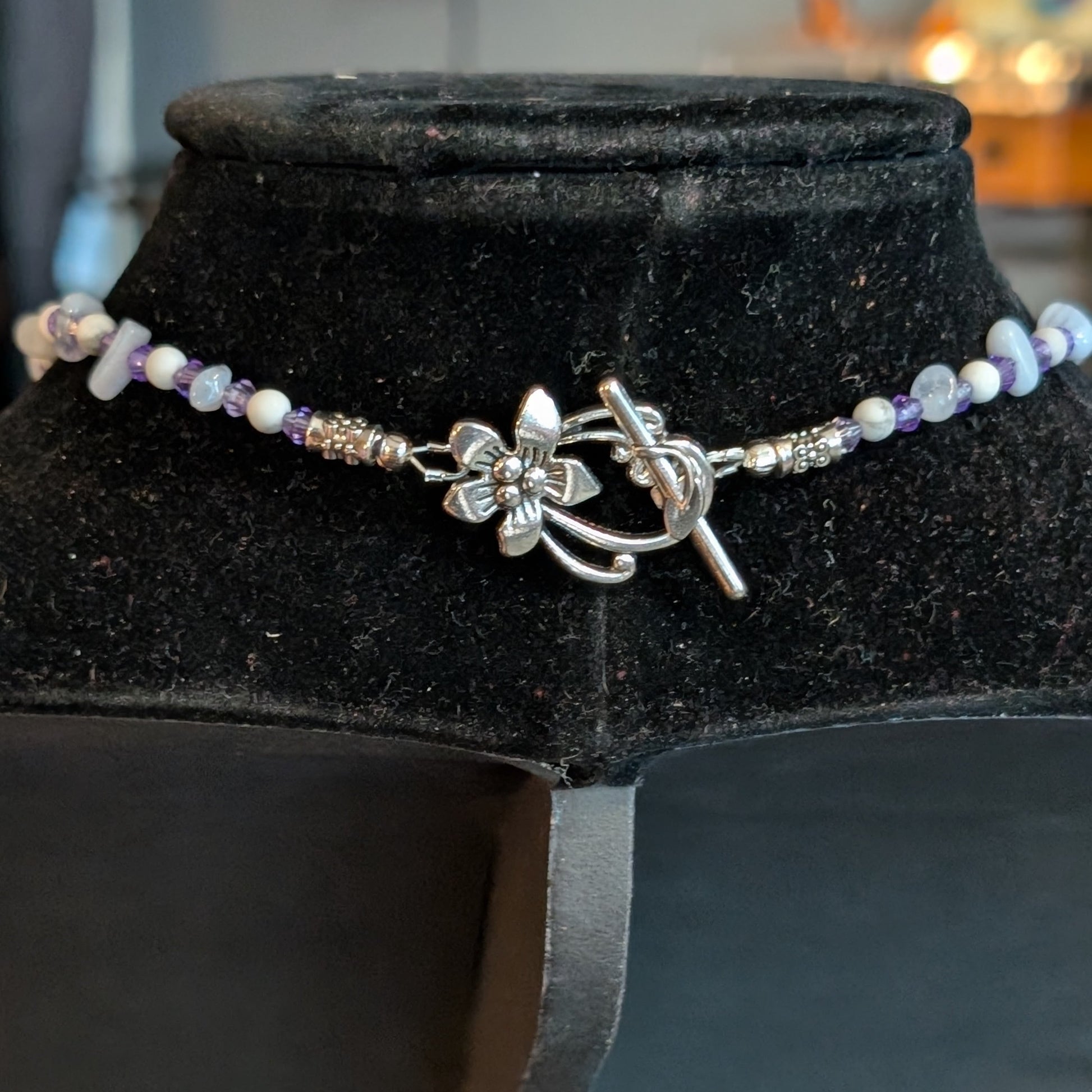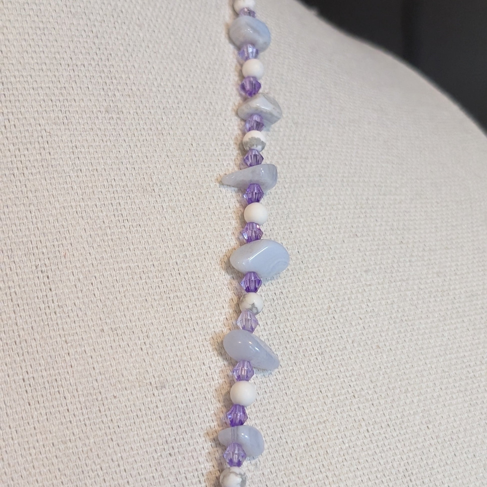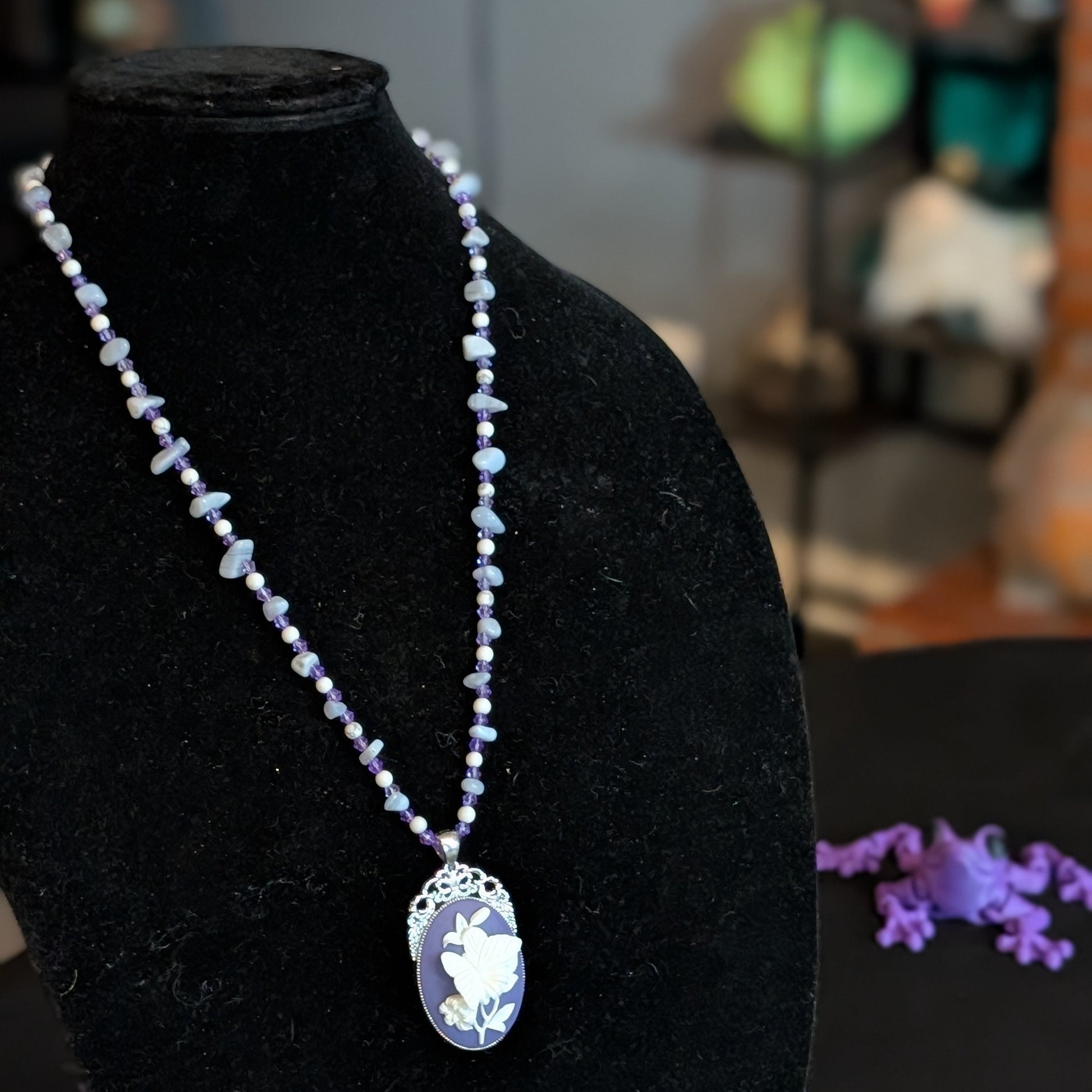 Her pale lavender cameo captures a butterfly mid-rest, one fragile wing poised against the petal that cradles it — a moment so still, you can almost hear the hush of air around it. The chain echoes that quiet grace: soft blue lace agate chips, misted howlite, and violet crystal spacers weave together like dewdrops and sighs.