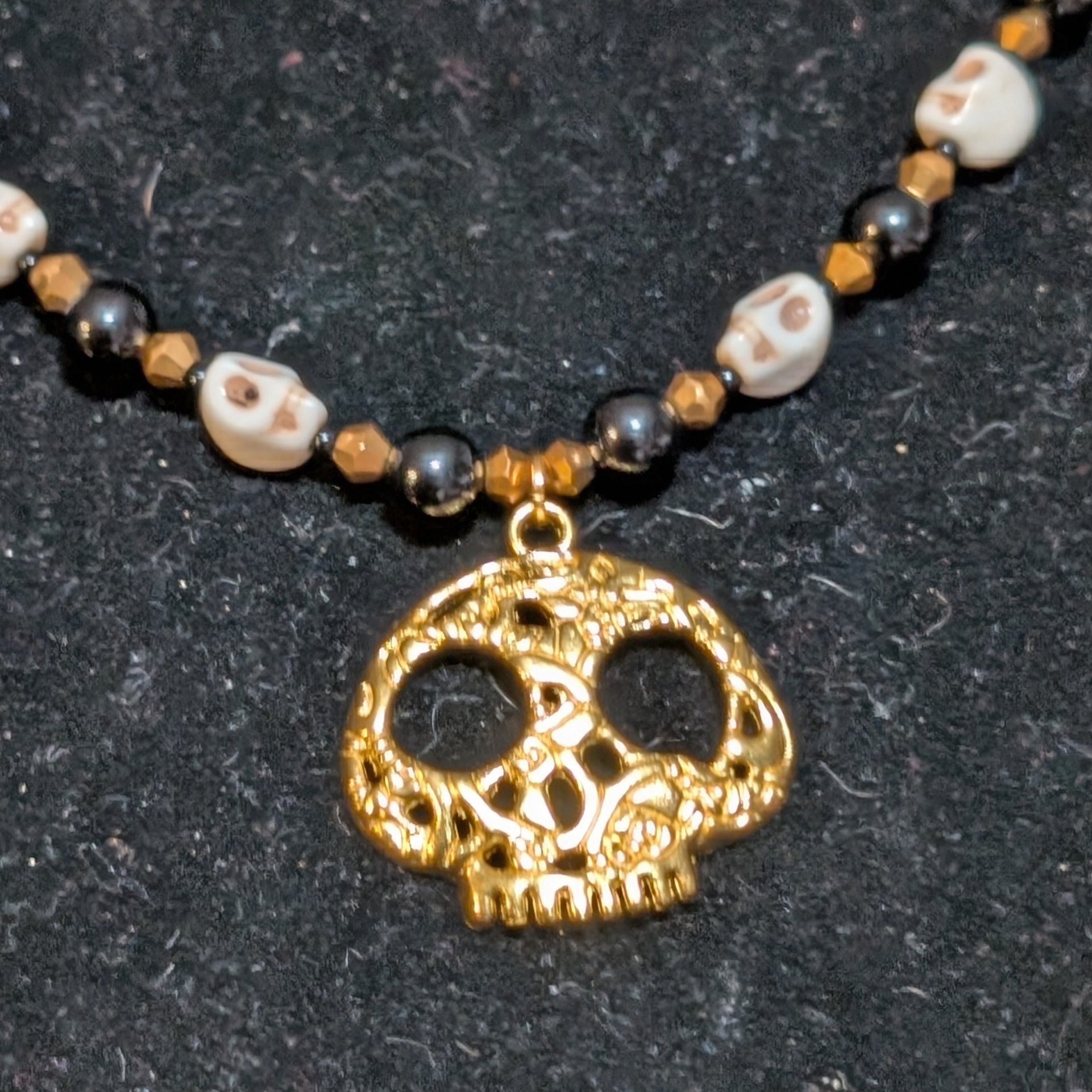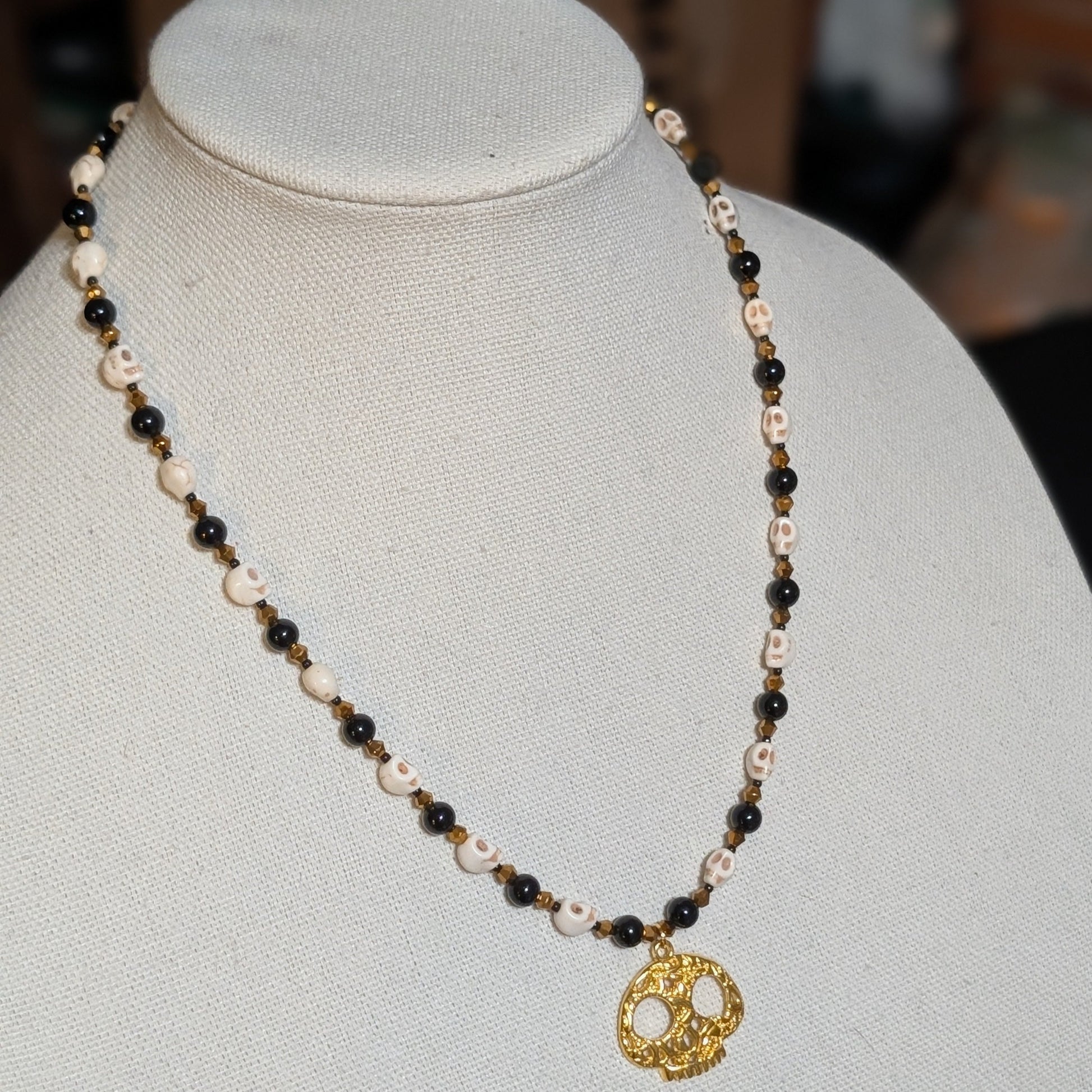 Once a pirate’s boast, this necklace now carries a different story. Plundergeist pairs smooth black onyx with tiny ivory-toned skull beads, bound together with glints of gold. At its center rests a detailed skull pendant, gleaming like treasure pulled from the depths.