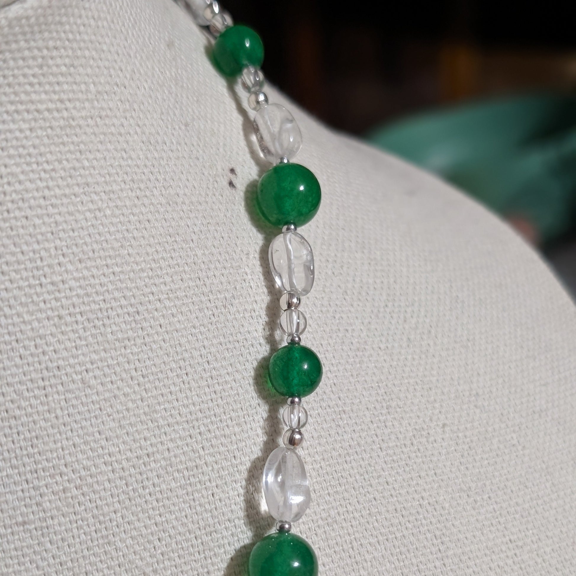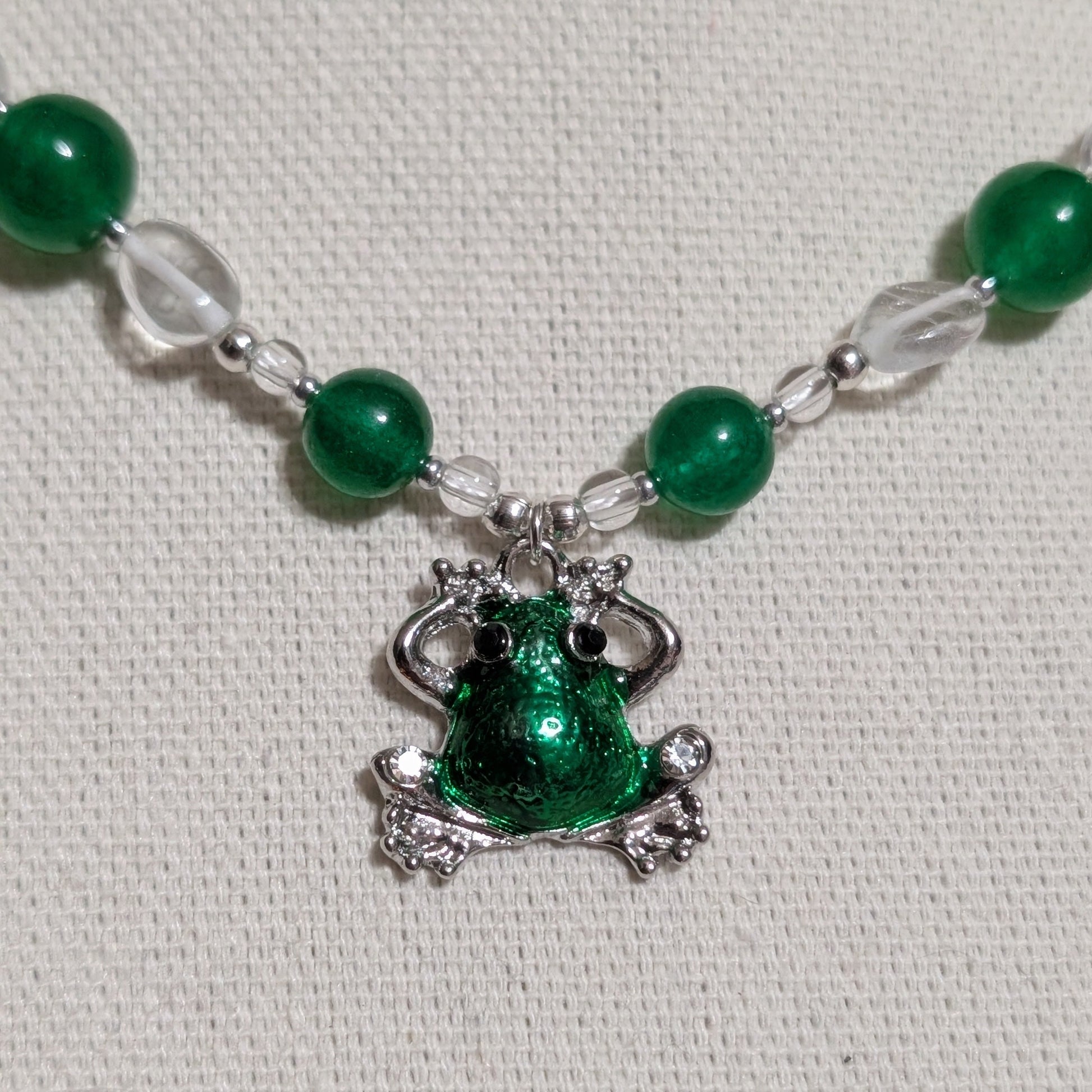 Pondlight Jewels is a necklace that carries both elegance and whimsy: the shine of quartz, the boldness of jade, and the laughter of a frog who once loved a pond so much, he became its light.
