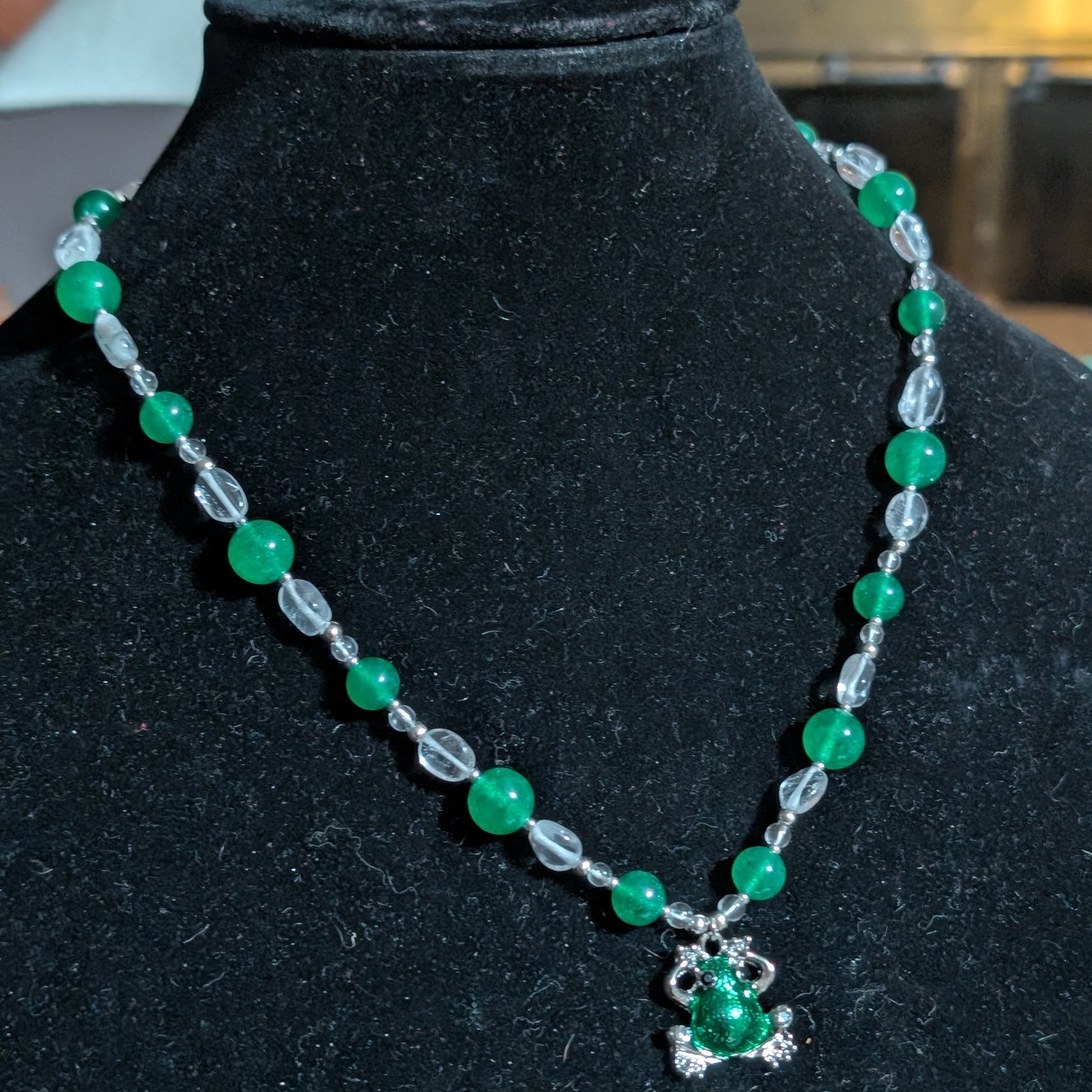 Green jade beads, alternating in size, float among clear quartz ovals and rounds, strung lightly so they seem to hover in water. At the center, a bright green frog pendant sits in playful contrast, cartoonish and lively — the very spirit of the necklace itself. Silver flowers accent the clasp, echoing the bloom of summer by the water’s edge, and the clasp is finished with an extender chain accented by a tiny frog charm.