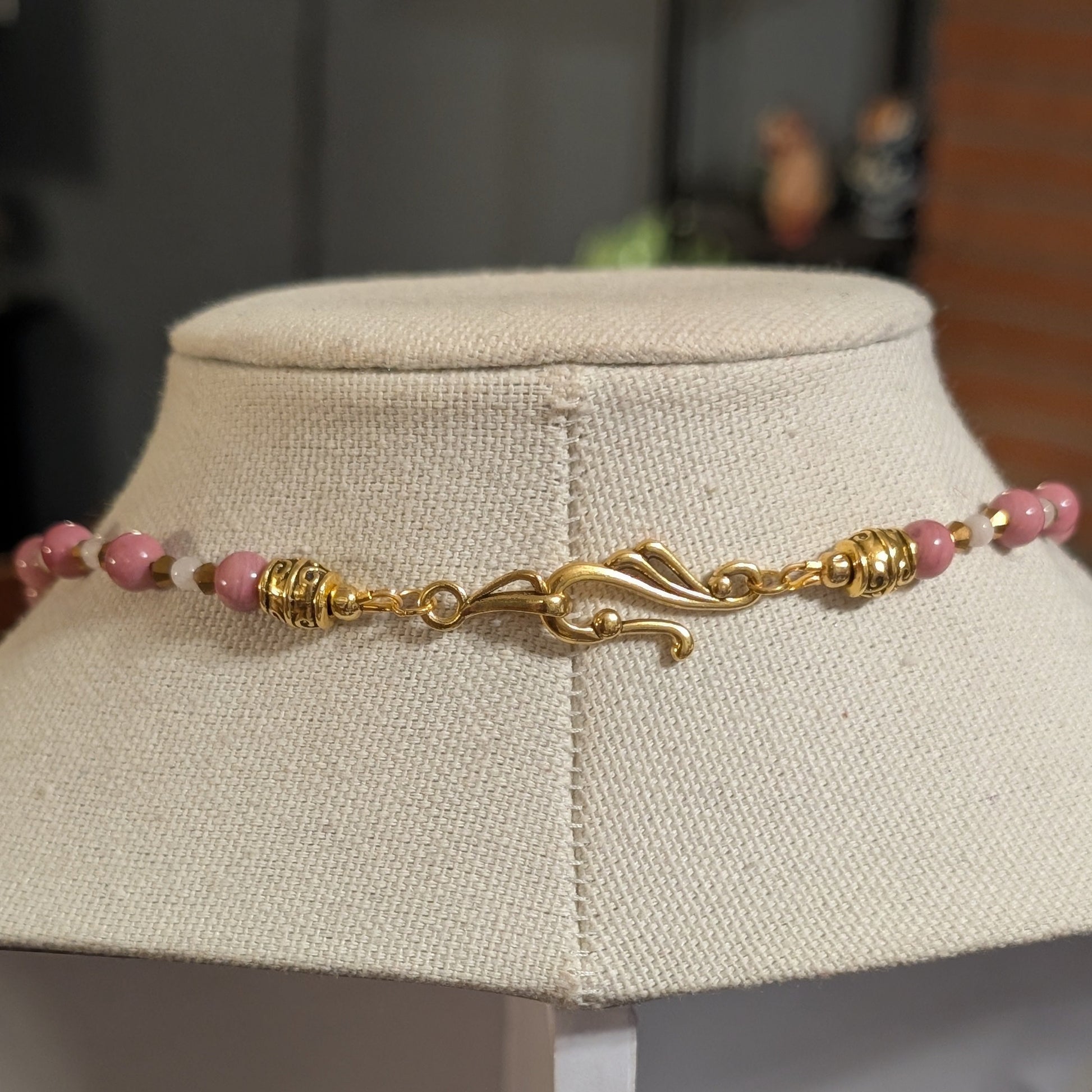 Her cameo captures her just as she prefers to be remembered — serene, flawless, and absolutely unbothered. The soft pink field behind her glows like powdered blush, framed in gold worthy of her every indulgence. Two tiny crown beads rest on the strand like subjects in her retinue, flanking her favorite jewels: rhodochrosite for self-love and pink morganite for charm. Each bead catches the light with the quiet confidence of someone who’s never lifted a paw in her life — and doesn’t plan to start now.