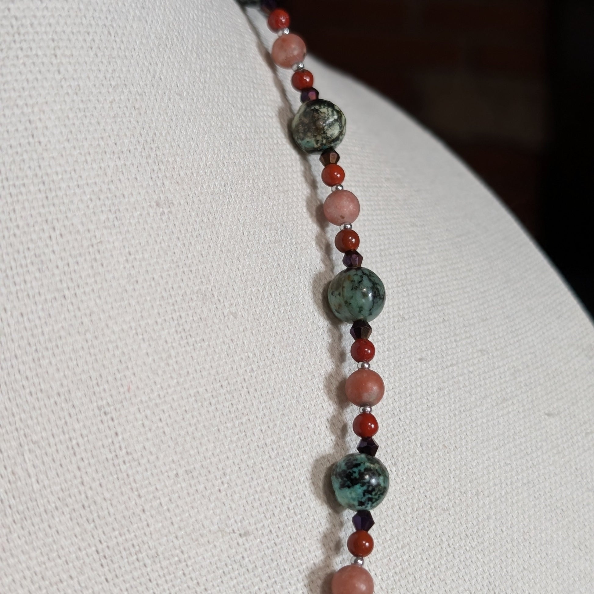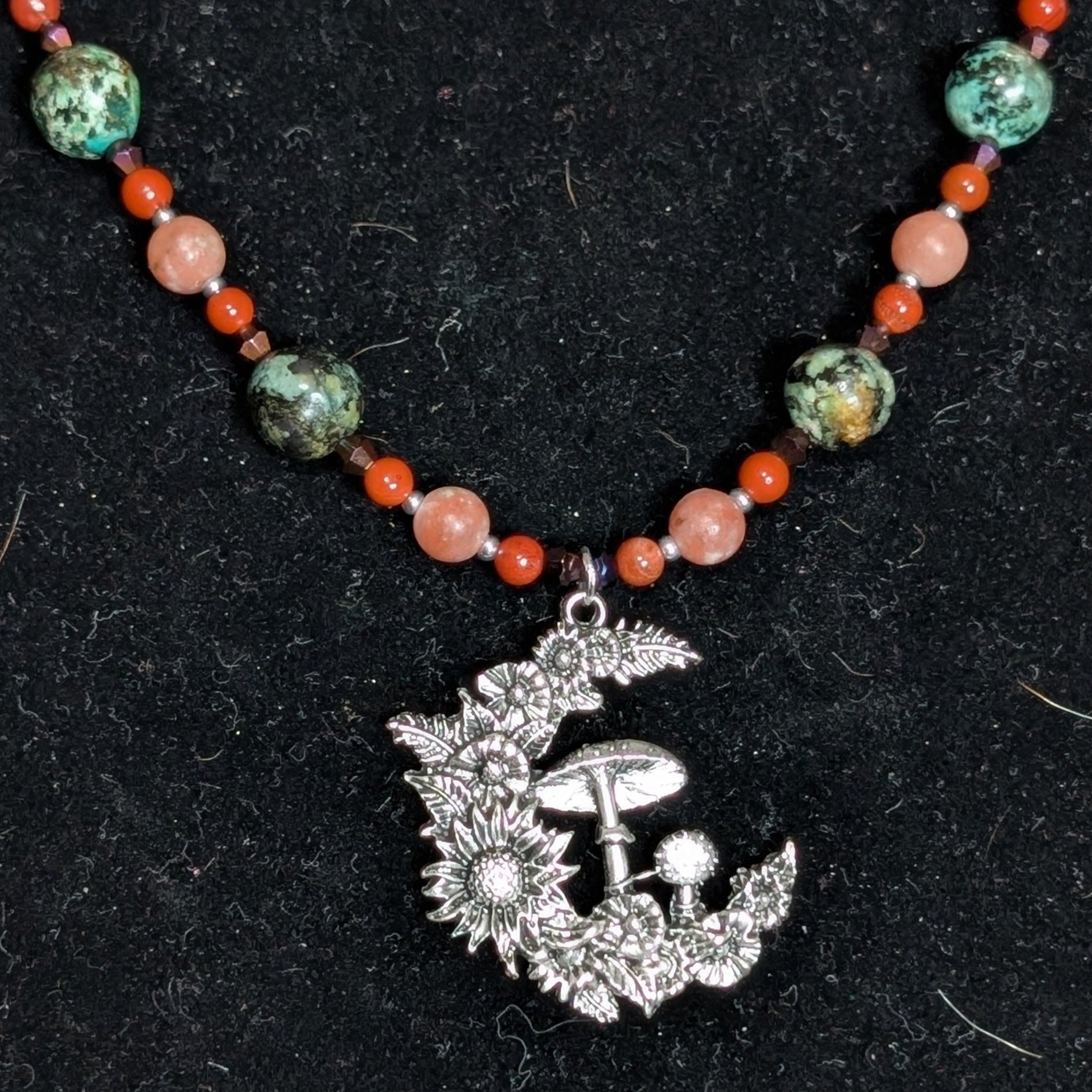 Rising Moonblossom draws its colors from that enchanted hour. Red jasper glows like the last ember of the sun, while African turquoise and an unknown orange stone root the piece in the earth’s deep breath. Between them shimmer faceted beads of purple twilight, catching light like a fading harvest sky. Scattered silver accents tie the strand to its crescent pendant, as though the moon itself had sprouted blossoms of its own.