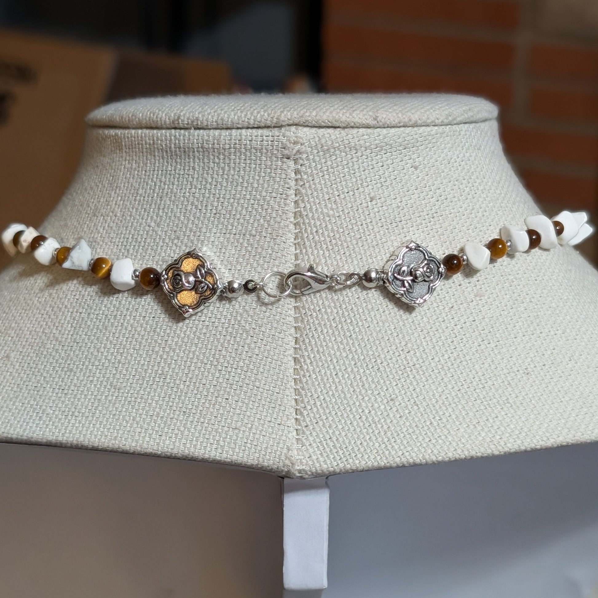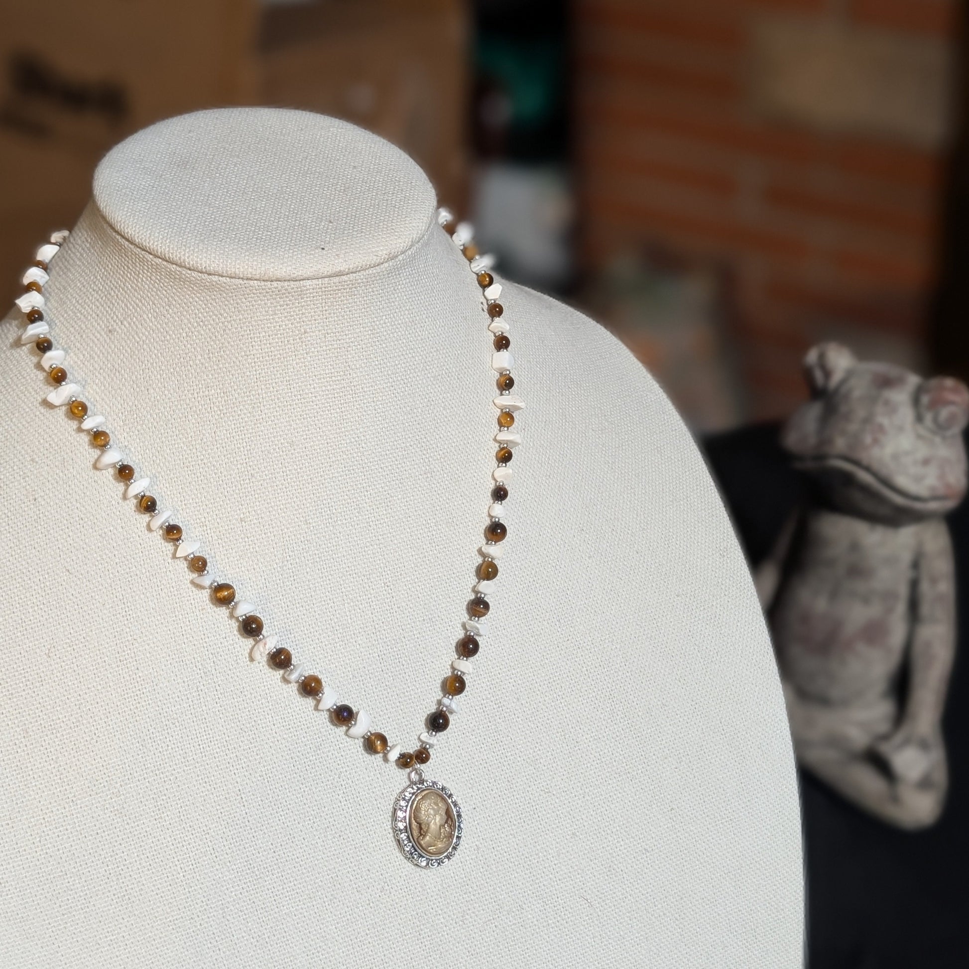 Sepiastone pairs the golden shimmer of tiger’s eye with the cool white of howlite, each bead carefully placed to draw the eye toward the vintage-style cameo pendant. The pendant itself glows in warm brown relief, framed with delicate scrollwork that feels lifted from another era.