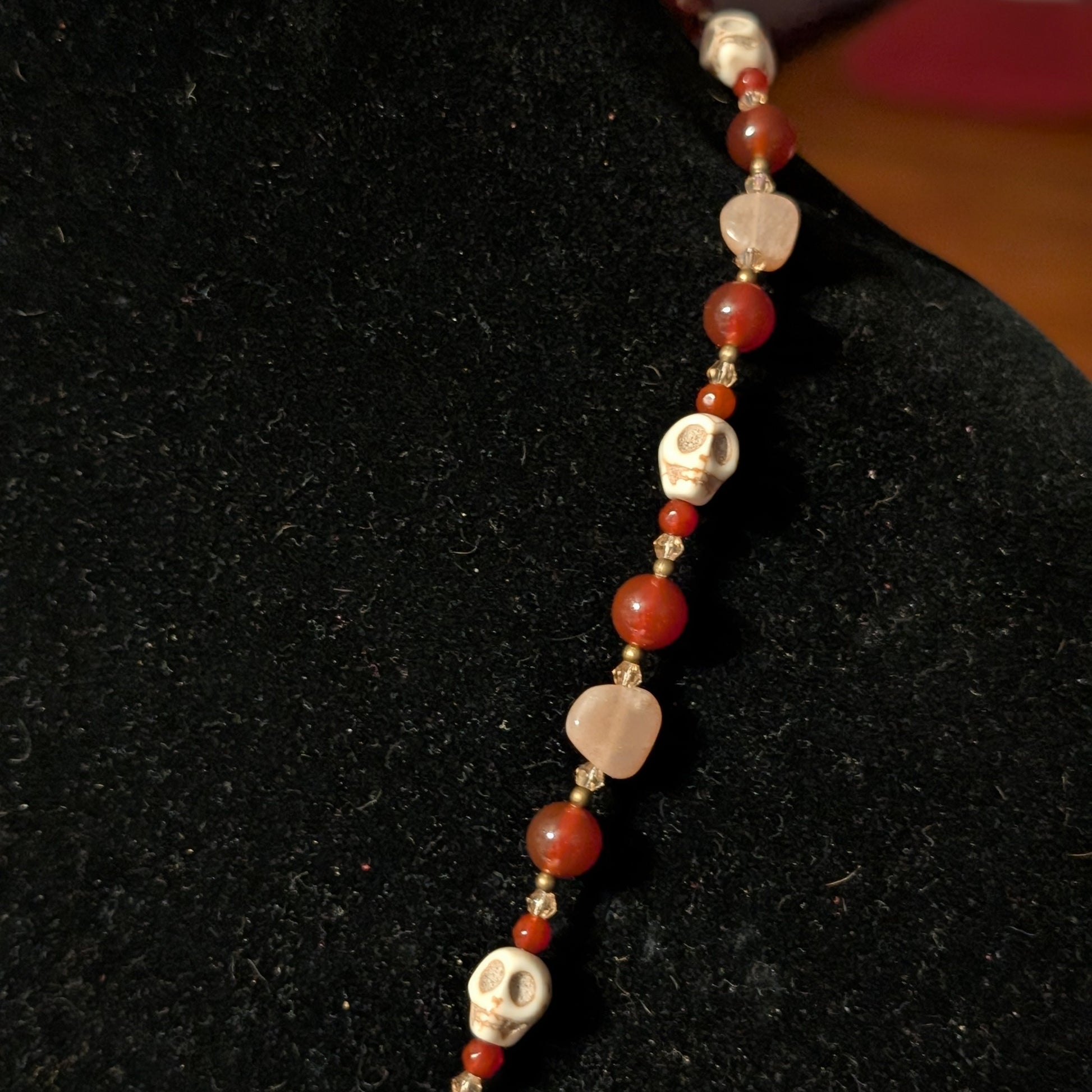 Her necklace mirrors that soft, sinister pull: carved skulls stretch into ghostly faces, framed by blood-bright red jade that glows as if lit from within. Sunstone lends its faint shimmer, a deceitful echo of life, and tiny bone-toned spacers glint like whispers of the souls already claimed. At her center hangs a crimson cameo—a skeletal lady, elegant and empty, her beauty eternal because it no longer beats.