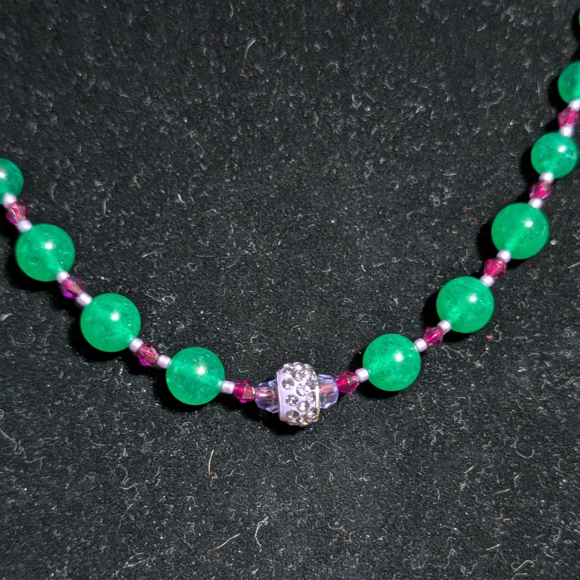 This necklace pairs cool, polished green jade with jewel-bright accents of magenta and lavender, giving it the playful feel of sugared jewels scattered across a banquet table. Each bead gleams like a candied drop, while the central faceted focal sparkles with a confectioner’s flourish.