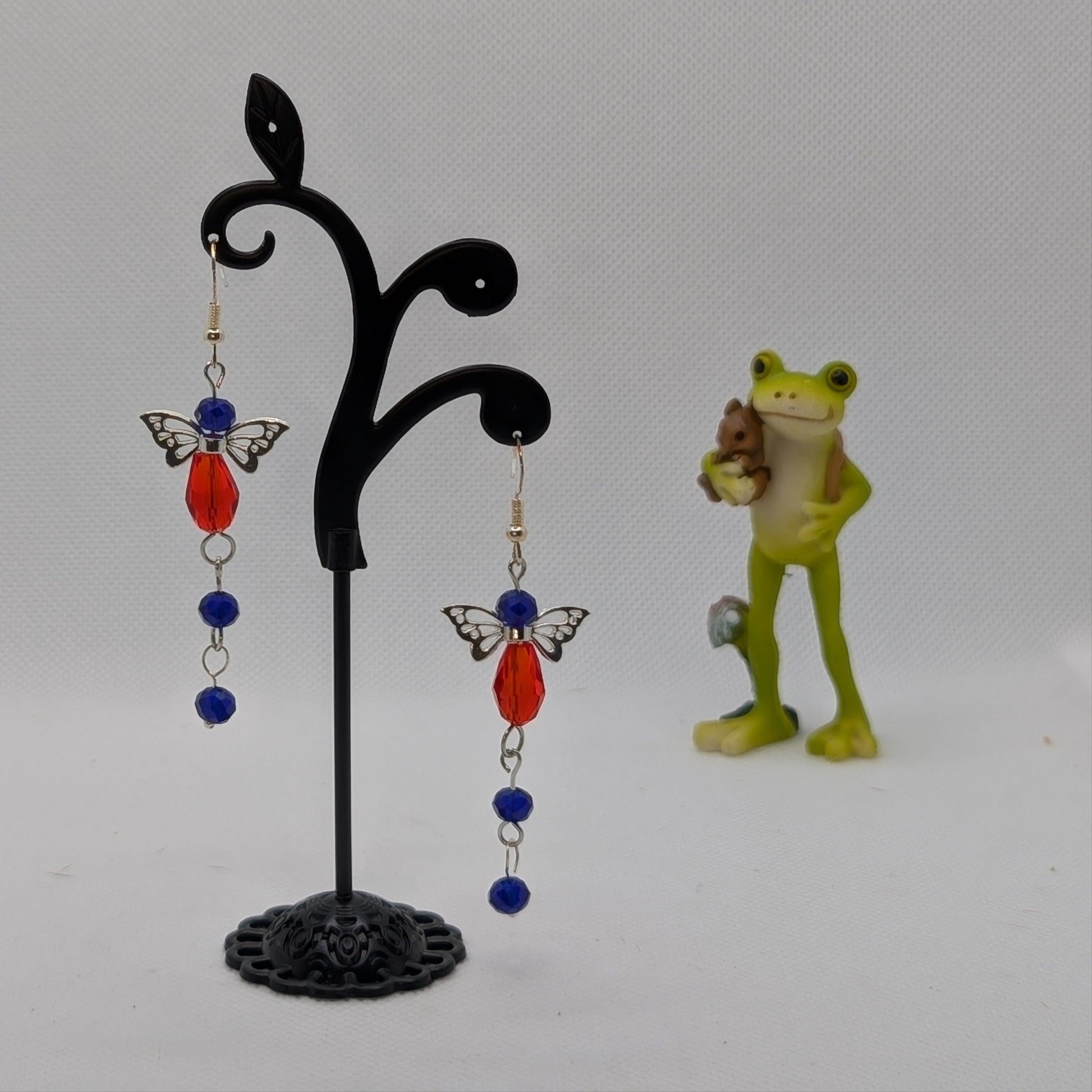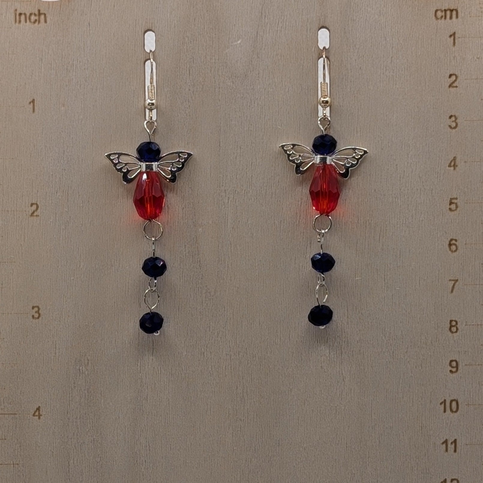 Crafted from fiery red teardrops and deep sapphire-toned rounds, these fairy-shaped earrings evoke the bold warmth of a summer sunset. Silver-toned wings lend a delicate silhouette, while their light-catching beads shimmer with every turn. Whether you're chasing the last light of day or dancing beneath it, Summerdusk will follow you like a spark in the dark.