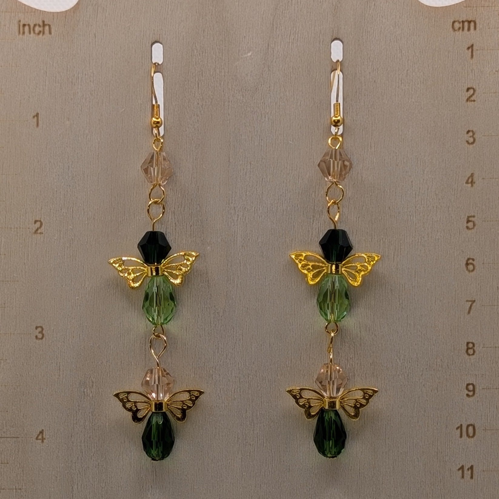 A flutter of golden wings and glittering greens—The Gilded Grassflock earrings look like they belong to a flock of winged sprites gathering in the tallest grass, where sunlight dances through the stems. Each earring features two winged figures, their shimmering glass bodies in graduated tones of light green and deep forest, separated by honeyed champagne crystals and anchored with gleaming gold-toned metal.