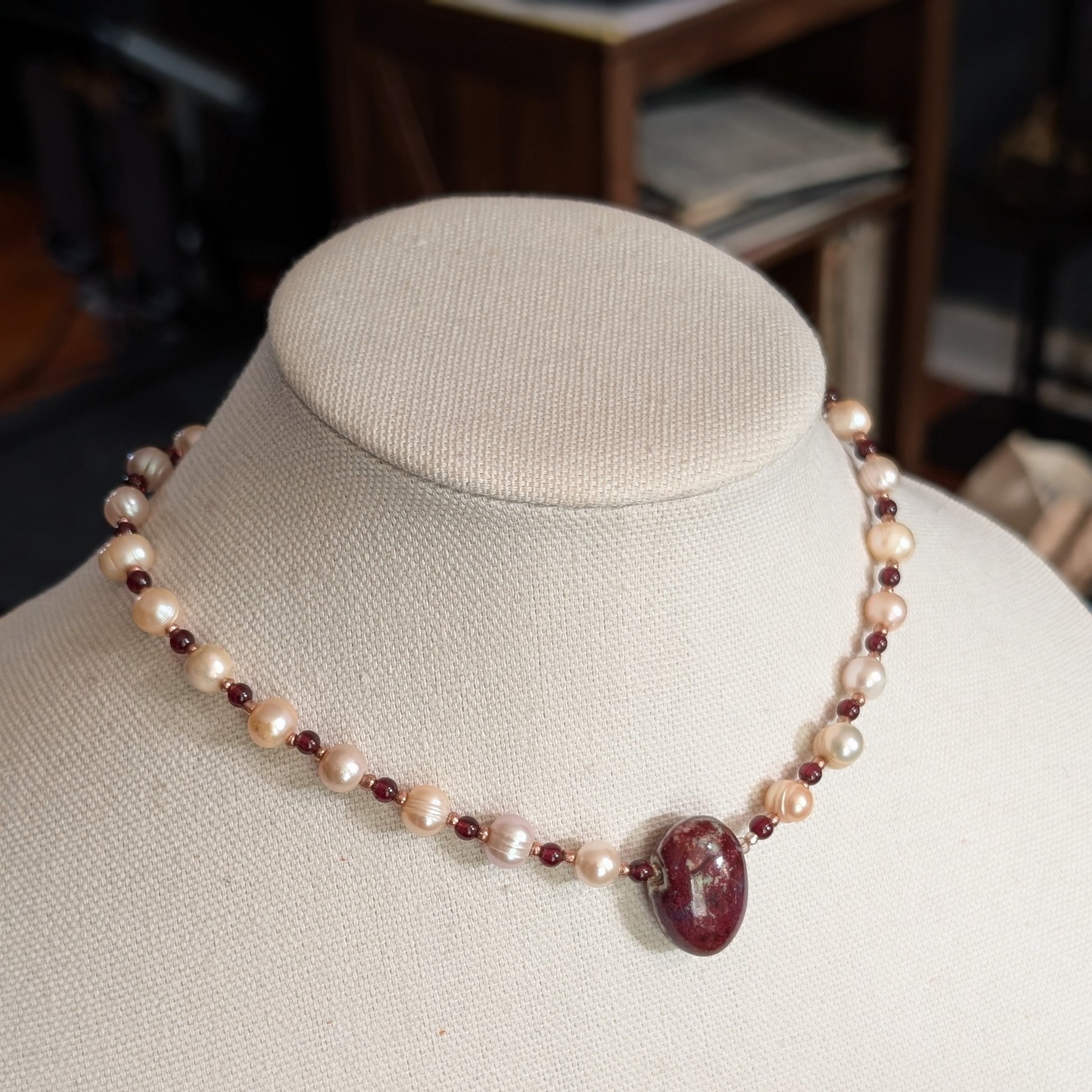 This necklace is made from natural garnets and pearls, which require gentle handling—particularly the pearls; avoid perfume, water, or polish—wipe pearls with a soft, damp cloth and let air dry.