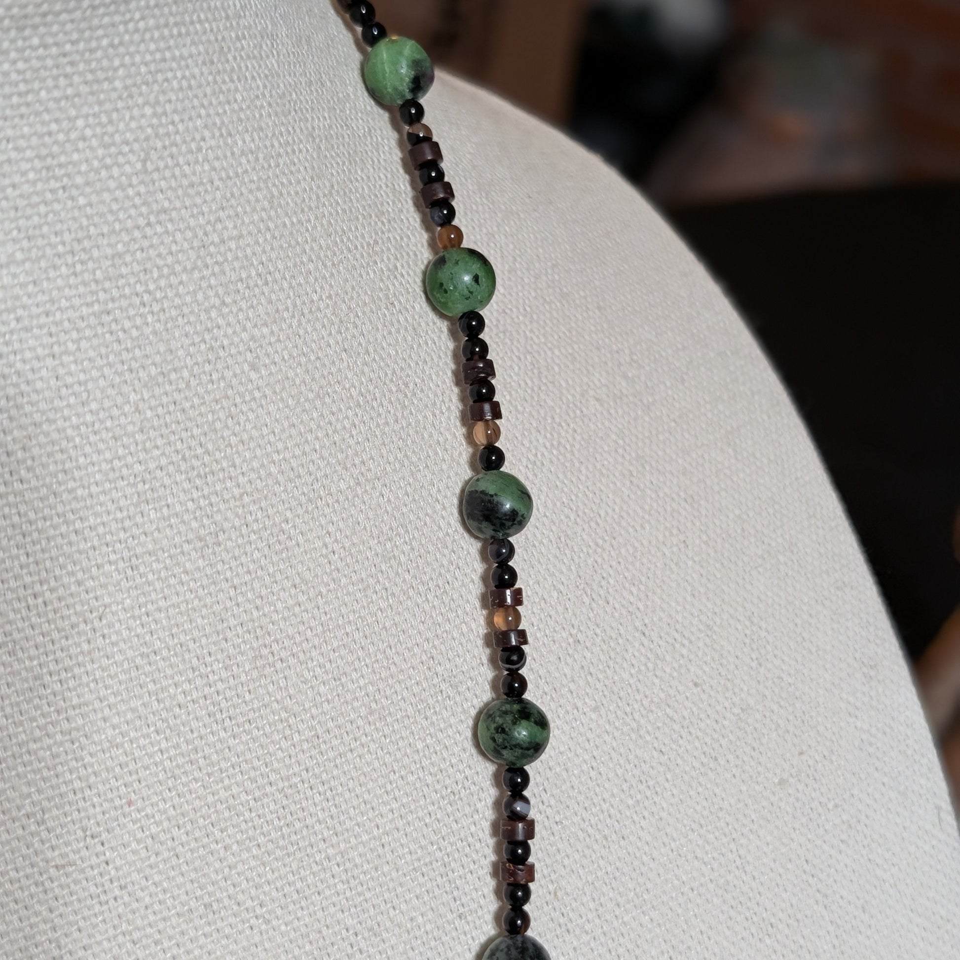The Vineroot Leaf is one of the latter: a talisman strung with ruby zoisite, sardonyx, and warm wood beads, anchored by a carved wooden leaf and a delicate tree of life charm. The palette is drawn from the forest itself — mossy green, deep earth, and shadow.
