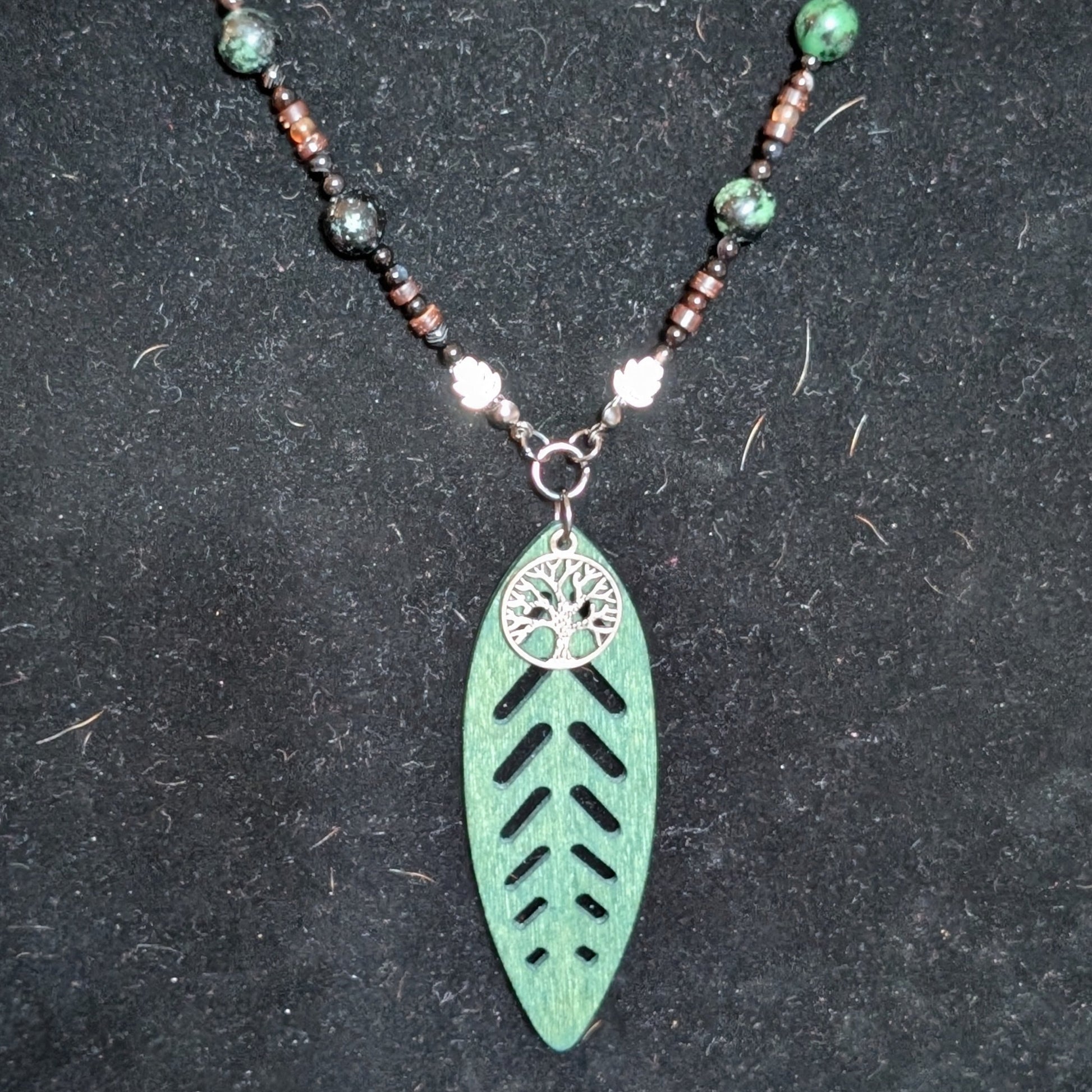 ✨The Vineroot Leaf✨| Ruby Zoisite, Sardonyx, & Wood Necklace with Leaf Pendant