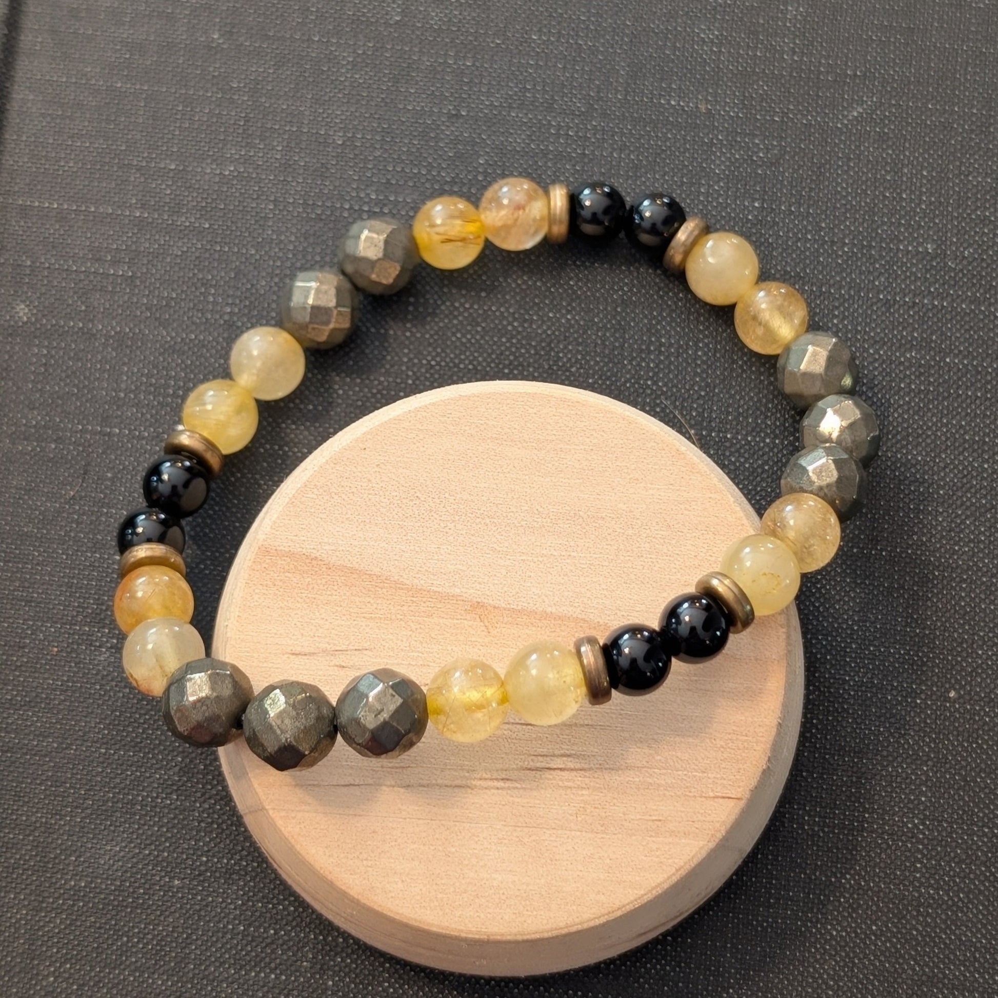This talismanic set of necklace and three bracelets draws on the sleek strength of pyrite, onyx, and citrine—each bead a gleaming echo of wings, armor, and sunlight filtered through danger. Some say it once belonged to a fae sentry whose sting was feared across realms, her flight silent, her justice swift.