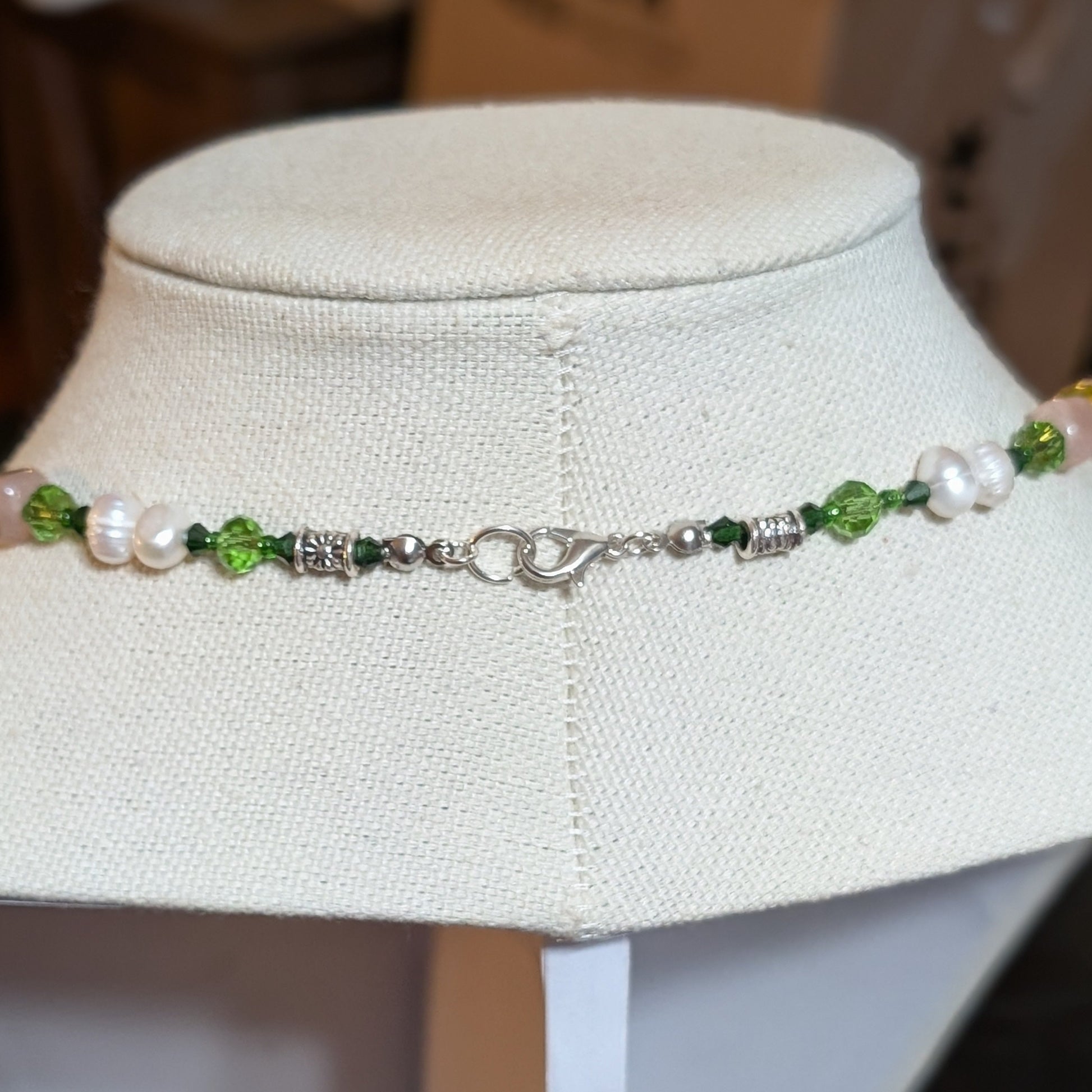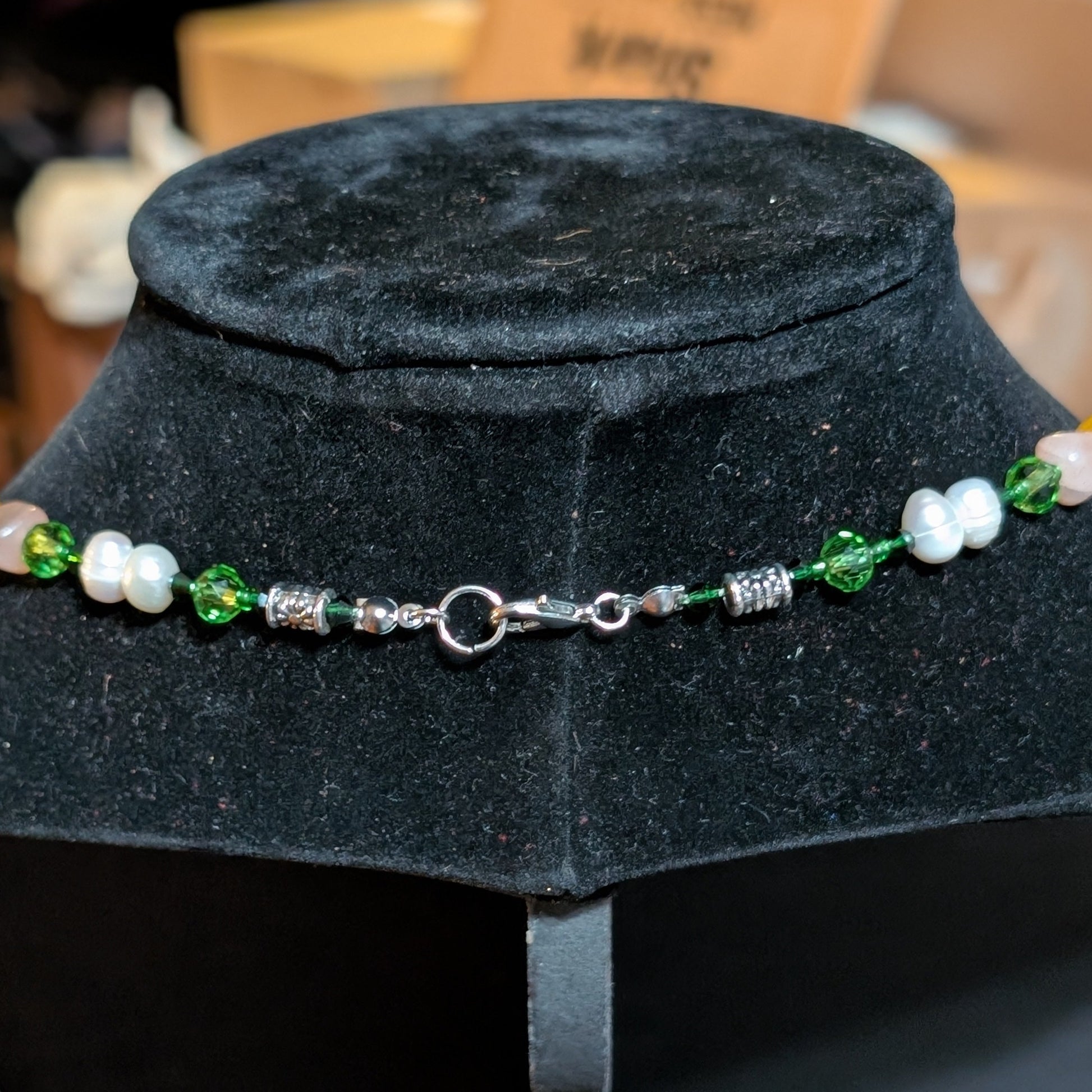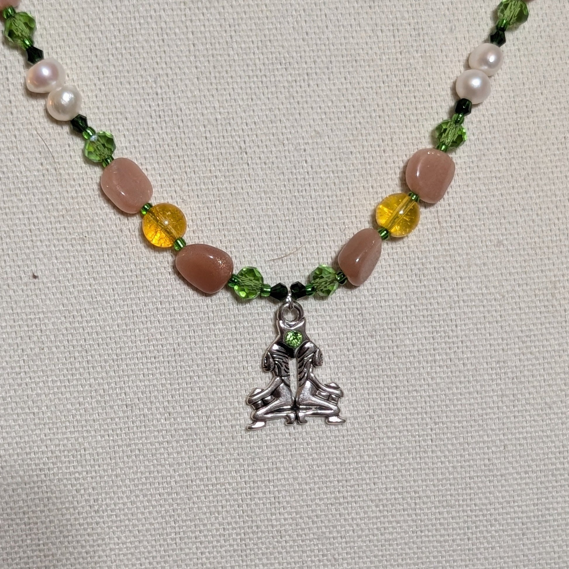 Twinflare is strung from stones of light and warmth: citrine for joy, sunstone for fire, and pearls for clarity. Between them flicker green accents like sparks leaping between twin fires, quick and alive. The silver pendant holds the mark of the Twins — Castor and Pollux, companions in the stars and guardians of the threshold between day and night.