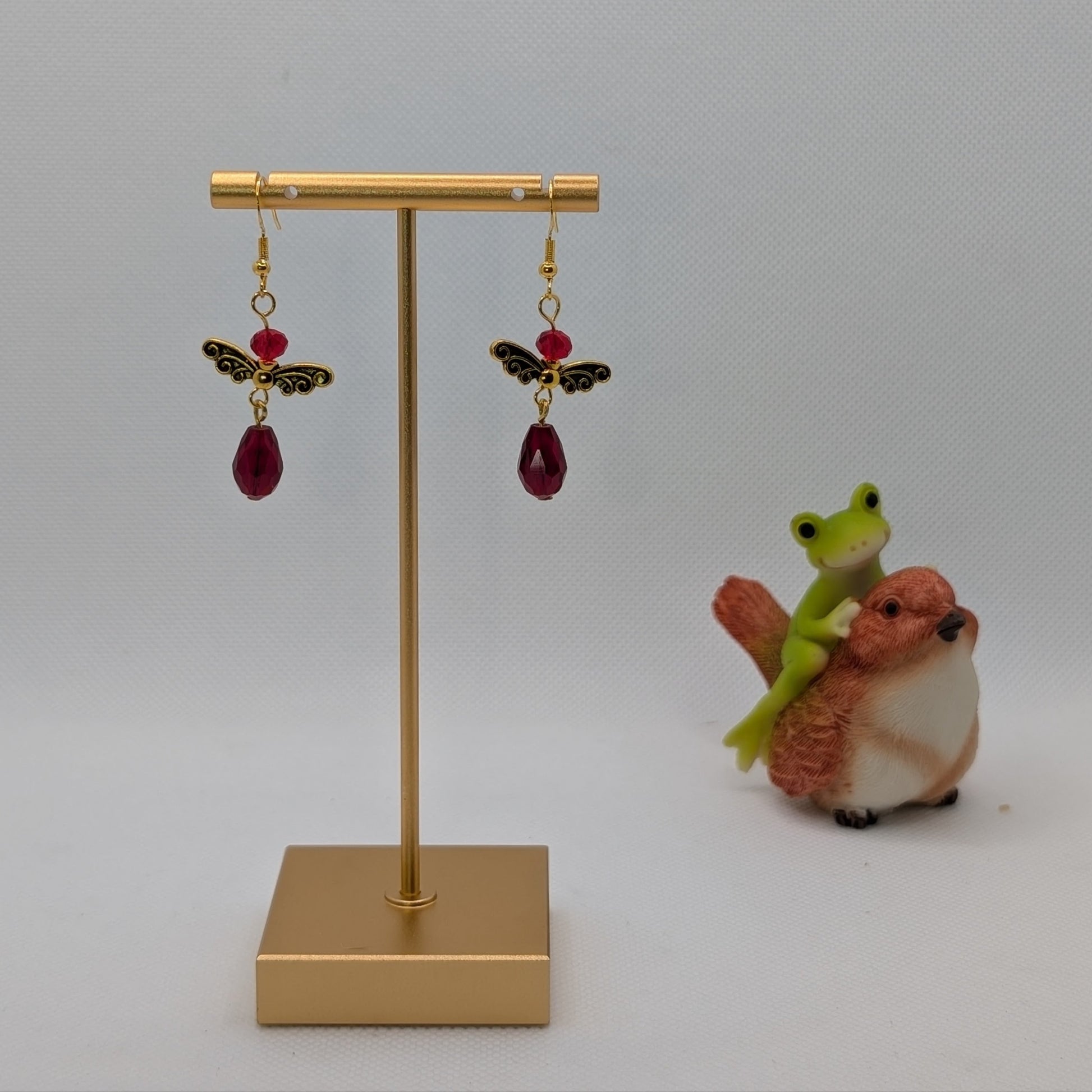 Draped in deep ruby-red and crowned with golden filigree, Velverra is a vision of velvet twilight wrapped in fairy charm. These earrings are sculpted with rich contrast: dark gold antique-style wings unfurl above faceted drops that shimmer like garnets in firelight. The red beads above the wings catch just enough light to suggest movement, like a wingbeat frozen midair.