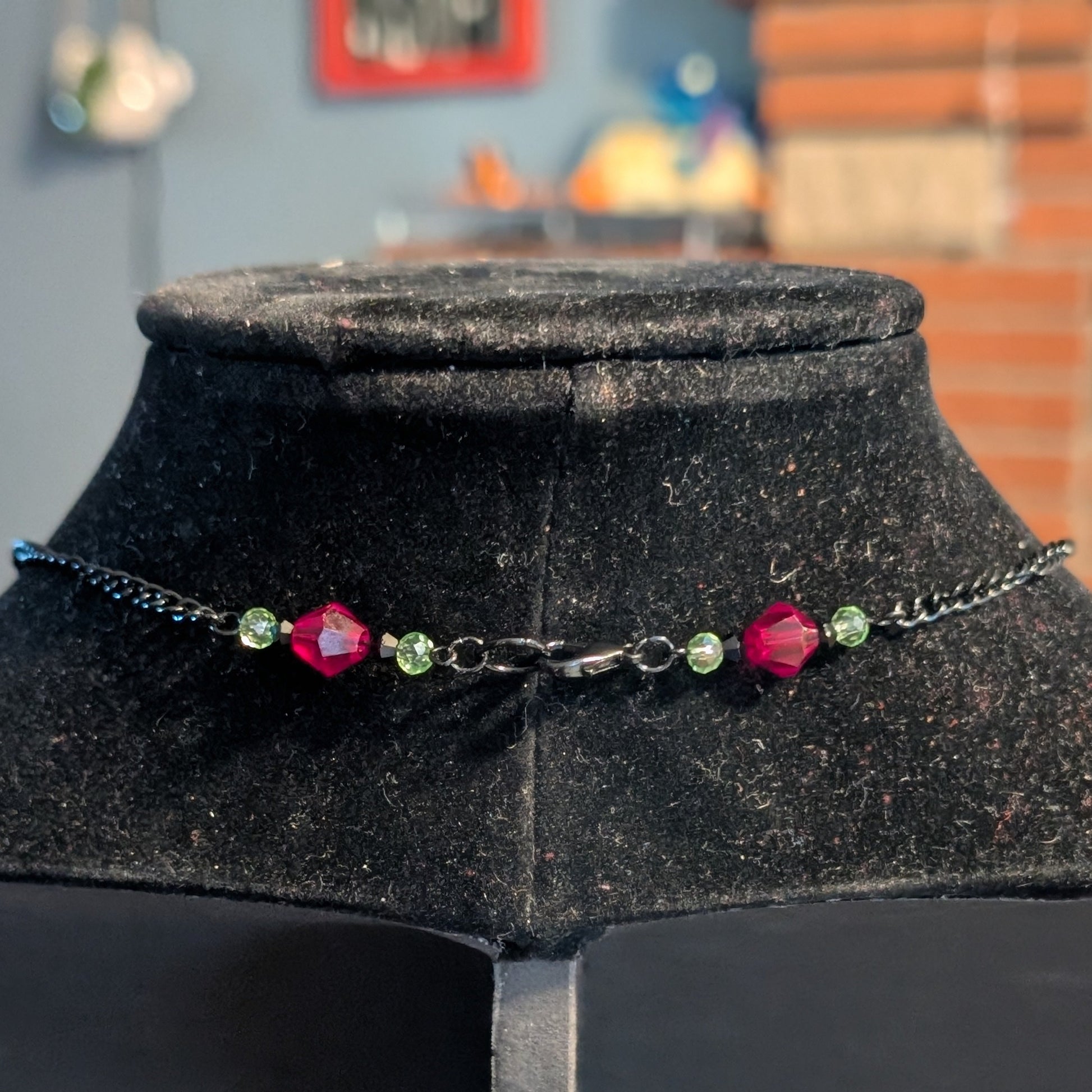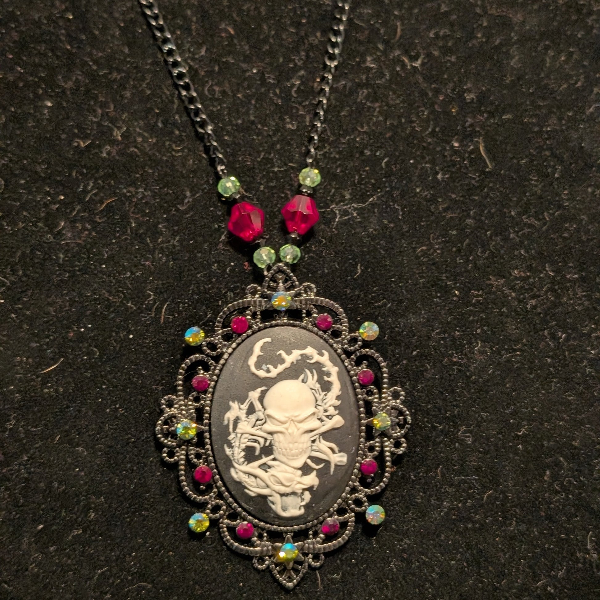 This necklace holds her likeness: a blackened cameo carved in the image of a skull wreathed in serpentine coils, both predator and prophecy. Around her frame, crimson and venom-green rhinestones glimmer like the eyes of a creature too clever to strike first. Along the chain, the same two hues — red for heart, green for venom — flicker in rhythm, a warning disguised as ornament.