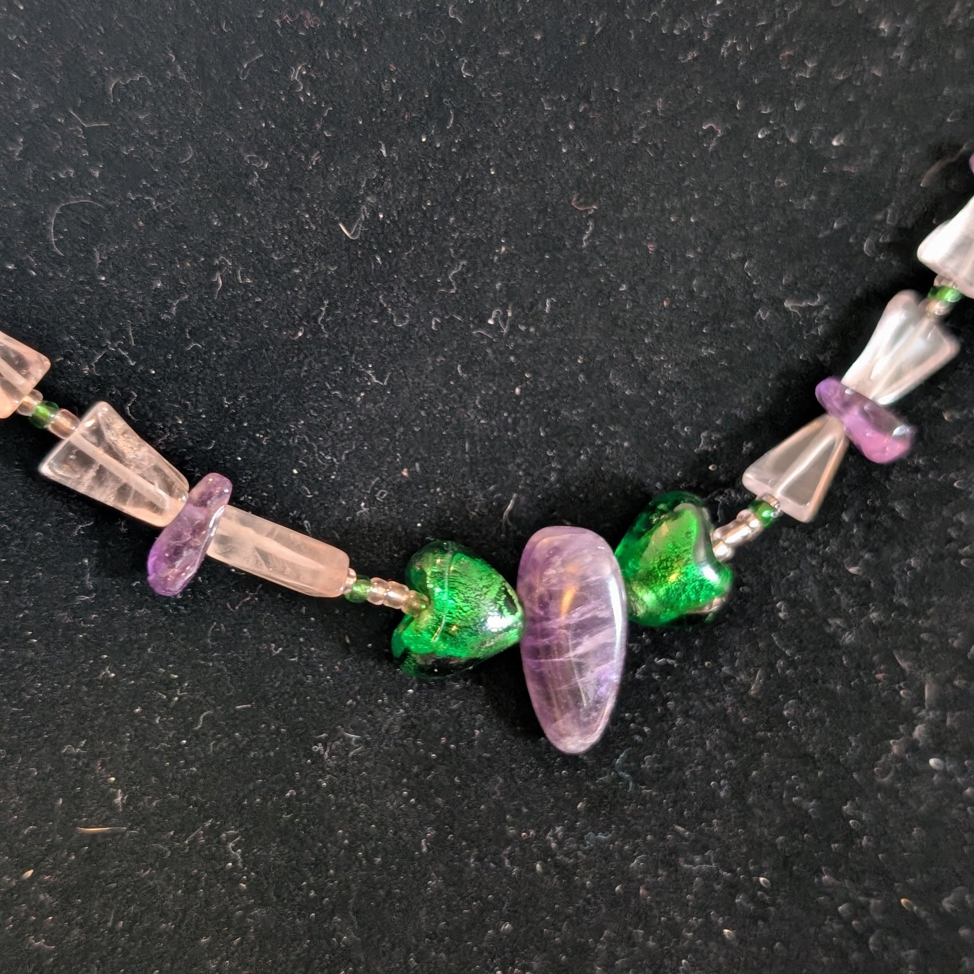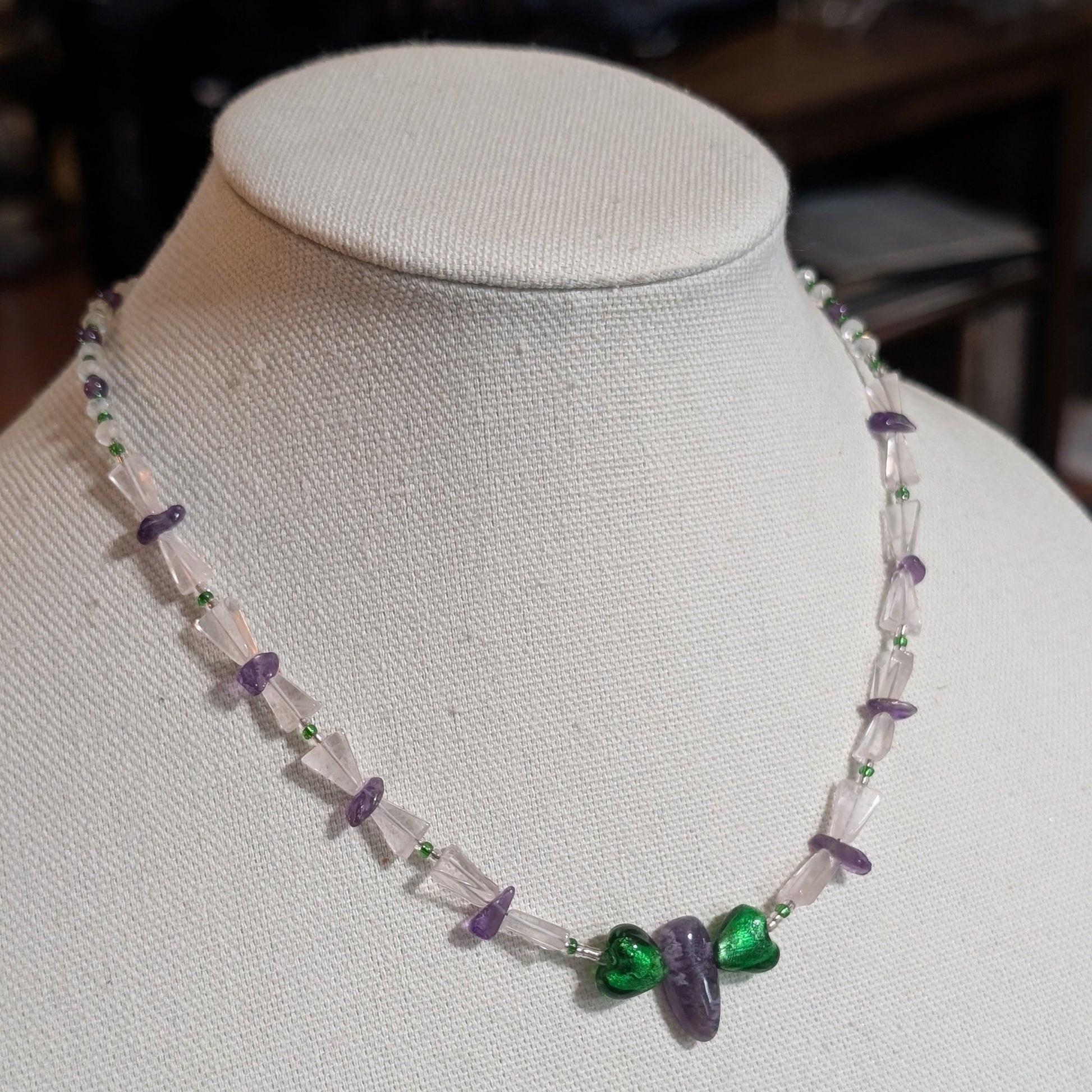 Amethyst pools like twilight, rose quartz lingers like afterglow, and at the center, green glass wings hold the last light—half butterfly, half fae, entirely hush. A single amethyst at the extender tips the piece toward evening calm.